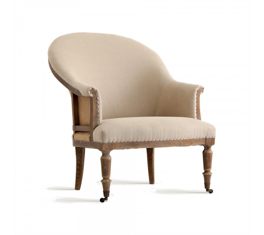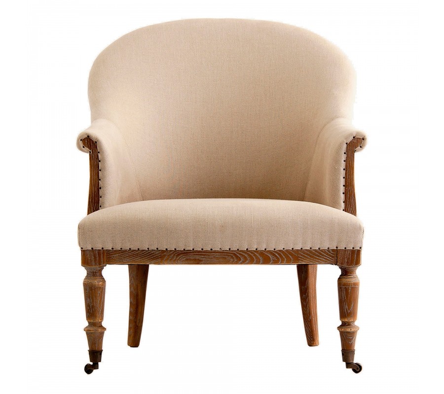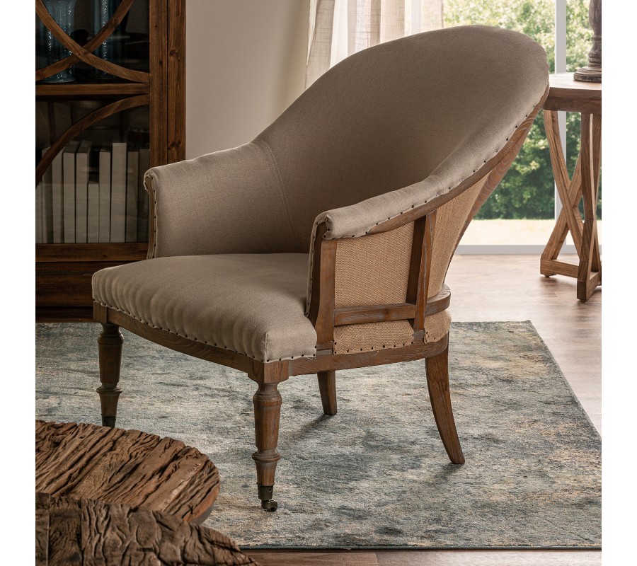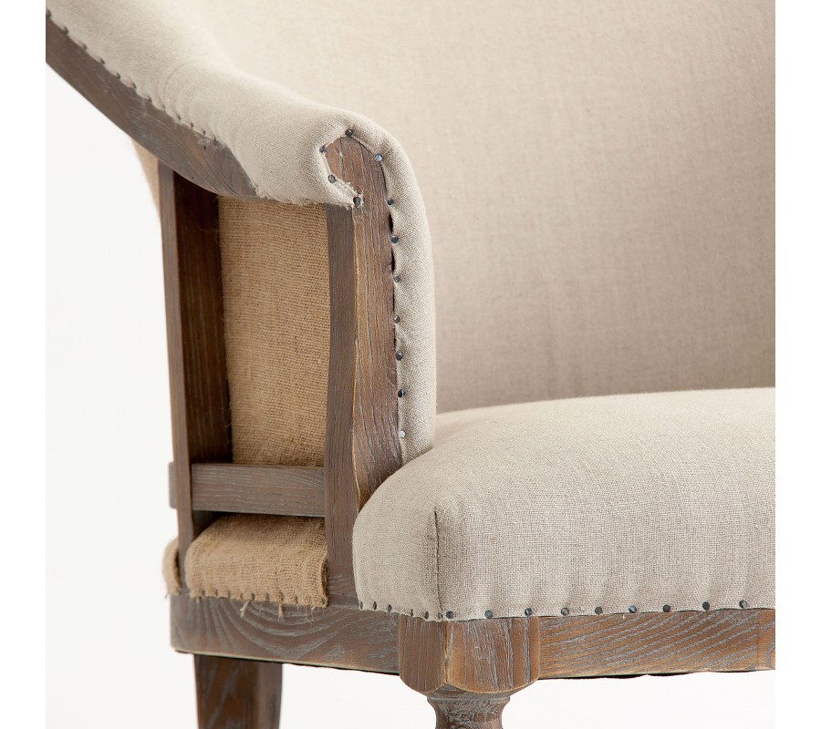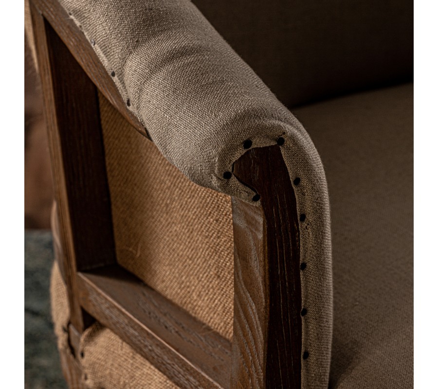 Luxusné kreslo Carlos je dizajnovou fúziou klasického rustikálneho štýlu s vintage prvkami a avantgardným konštruktivizmom. Jeho rám je vyrobený z jaseňového dreva v hnedej farbe. Povrch je upravený tak, aby pôsobil starožitným dojmom, čo zvýrazňuje prirodzenú štruktúru a kresbu letokruhov. Jaseňové drevo je výbornou voľbou pre tento dizajn. Je veľmi tvrdé, odolné, no zároveň pružné, čo umožňuje jeho ohýbanie do delikátnych kriviek chrbtovej časti rámu a opierok na ruky. Predné vyrezávané nožičky sú inšpirované elegantným zámockým nábytkom a ich ukončenie kovovými kolieskami prináša do kompozície hravý a extravagantný prvok. Eklektická estetika pokračuje aj na chrbtovej opierke, ktorá je vyplnená poťahovou látkou z jutového vlákna v tmavšom béžovom odtieni. Čalúnenie vnútorných častí opierok a sedadla je pokryté svetlým krémovým plátnom s výraznou štruktúrou. Textilné časti sú k drevenému rámu prichytené kovovými nitmi, ktoré sa vizuálne prepájajú s kolieskami a dodávajú kreslu esenciu obnaženého industrializmu. Celková silueta kresla s vyrezávanými nožičkami a zahnutými opierkami pôsobí rustikálnym dojmom. Kovové prvky, upevnenie poťahovej látky či povrchová úprava dreva dodávajú kreslu vizuálne charakteristiky rozličných dizajnových štýlov a celkový dojem z nábytku je tak moderne eklektický. Vo vašej obývačke či pracovni bude kreslo pôsobiť ako výrazný umelecký akcentový prvok. Môžete ho doplniť konferenčným stolíkom z masívneho dreva alebo sedačkou s čalúnením v podobných svetlých odtieňoch. Hodí sa tiež k výraznejšiemu vintage nábytku.