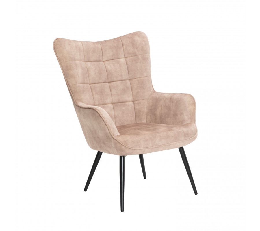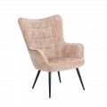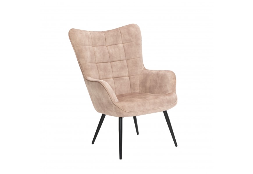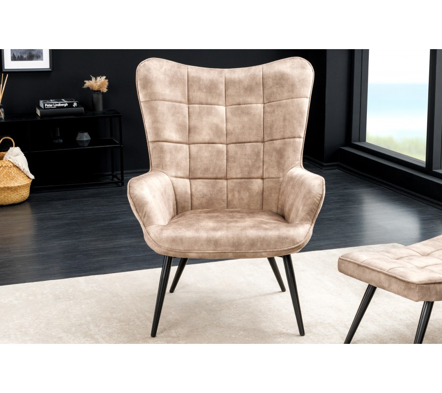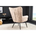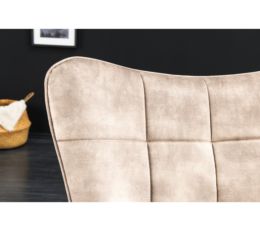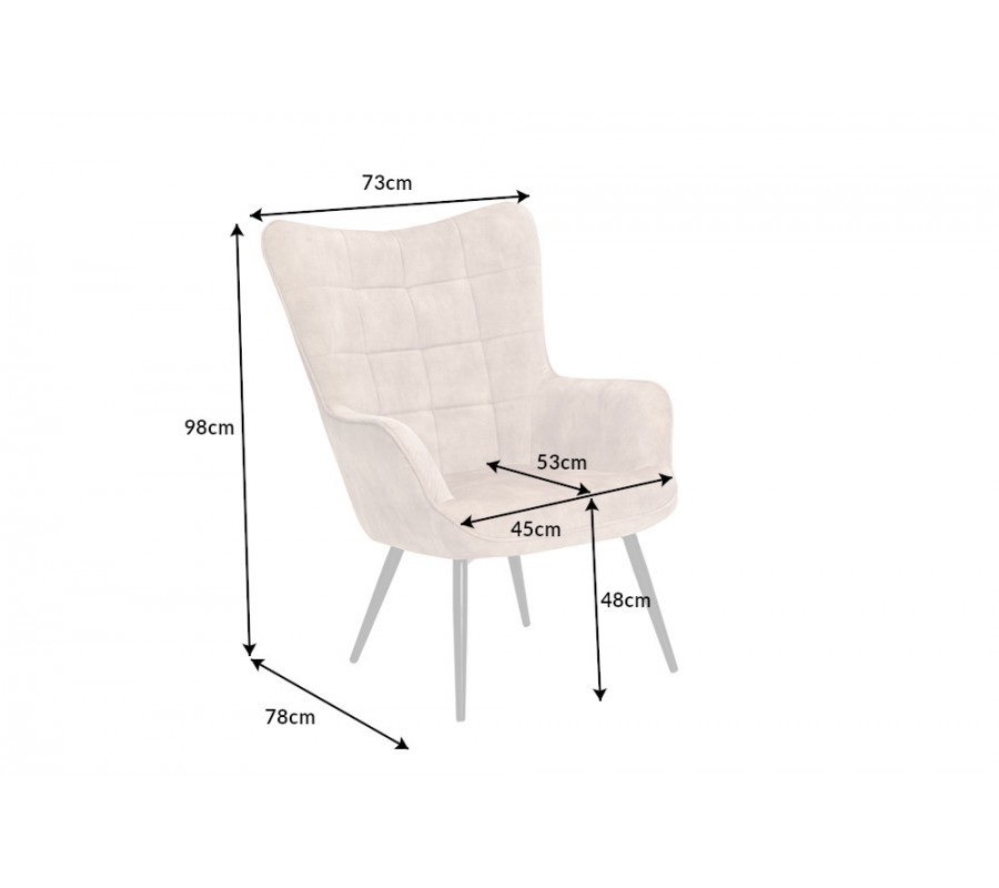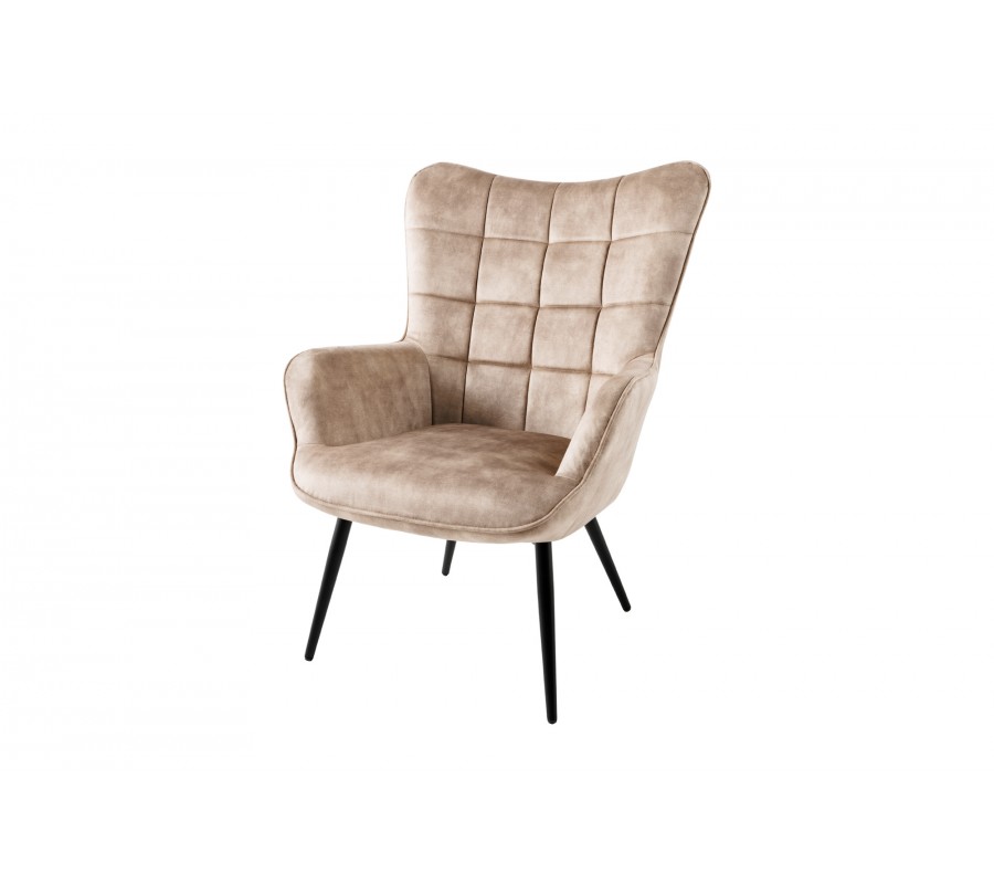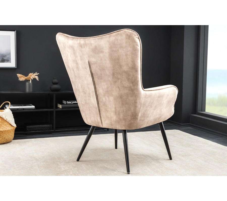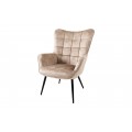 Dizajnové čalúnené kreslo ušiak Scandinavia so zamatovým poťahom v šampanskej béžovej farbe s ozdobným prešívaním 98 cm