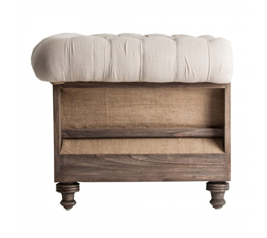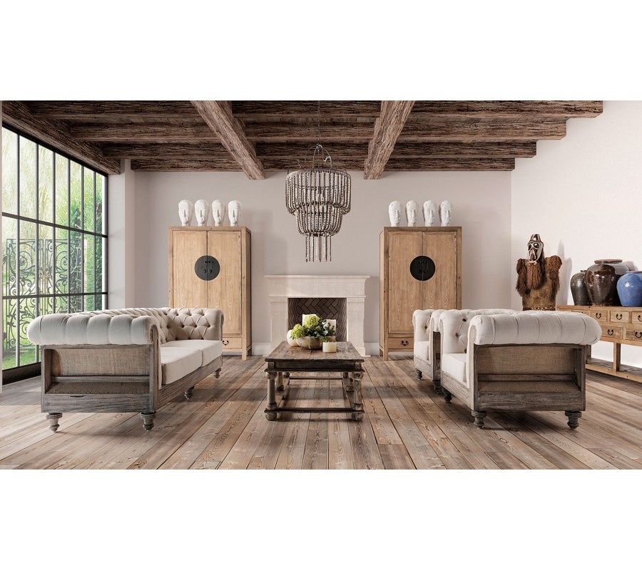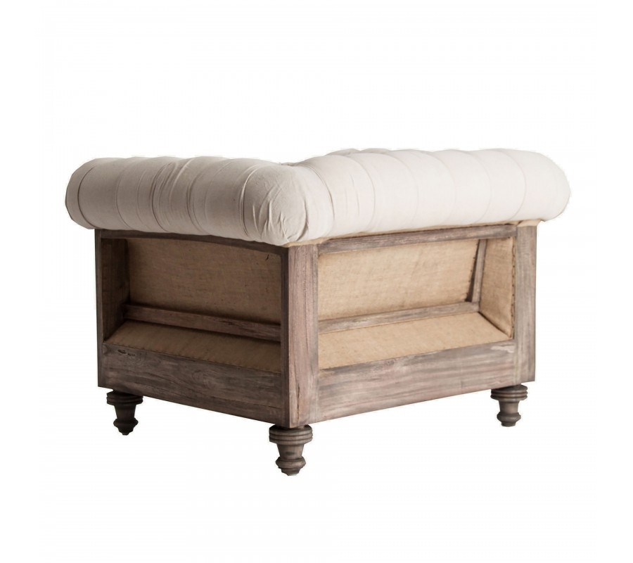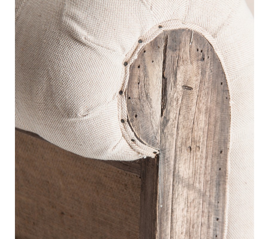 Podstava kresla je zhotovená z masívneho dreva s výraznou prírodnou štruktúrou, čo kontrastuje so sofistikovane pôsobiacou vrchnou časťou. Jej svetlá hnedá farba výborne dopĺňa béžovú farbu čalúnenia a odhalená konštrukcia na zadnej a bočných častiach zdôrazňuje naturálny charakter. V kombinácii s ďalším nábytkom z masívneho dreva sa tak kreslo hodí aj do obývačky zariadenej vo vidieckom štýle, s ktorým sa prepojí aj prostredníctvom okrúhlych vyrezávaných nožičiek.