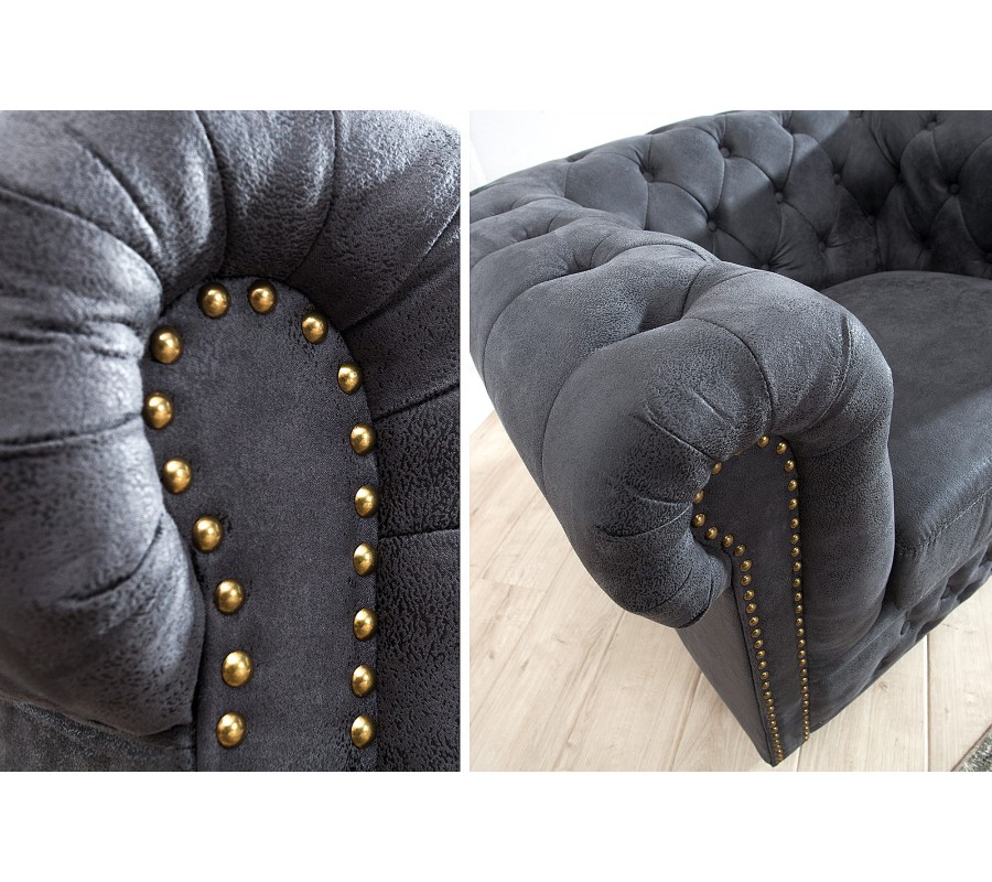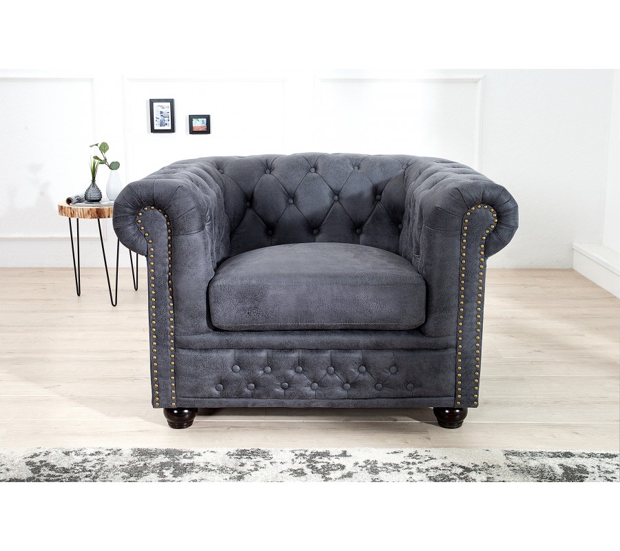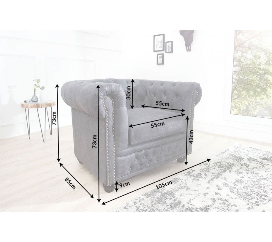 Kreslo Chesterfield Grau vás očarí svojím klasickým dizajnom kopírujúcim historický chesterfield nábytok. Do vašej obývačky prinesie nádych luxusu a elegancie.