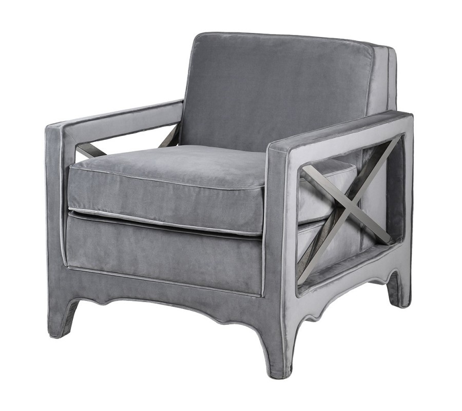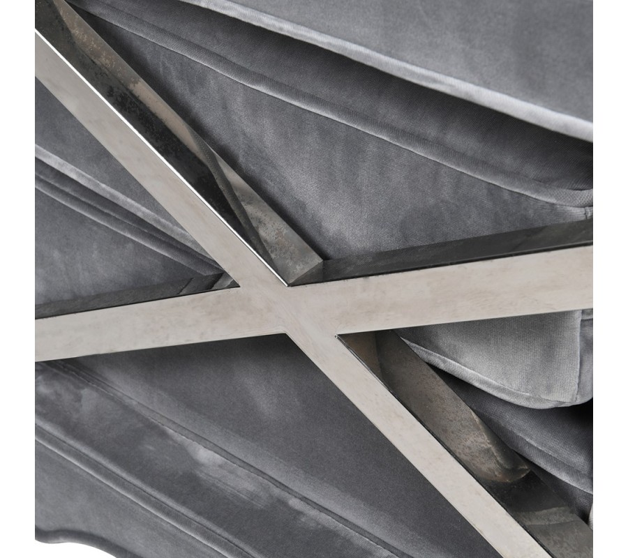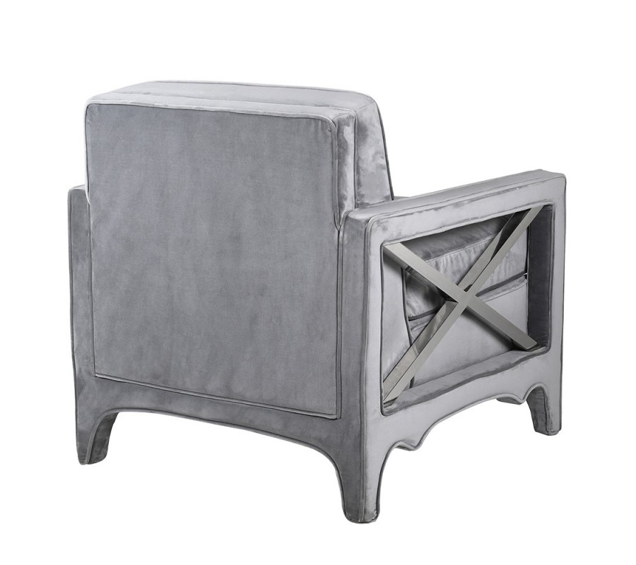 Luxusné kreslo Palace s jemným sivým zamatovým poťahom a moderným dizajnom pridáva vášmu interiéru výrazný prvok elegancie. Jeho charakteristickým znakom je chrómová opierka v tvare X, ktorá podčiarkuje jeho štýlový vzhľad.