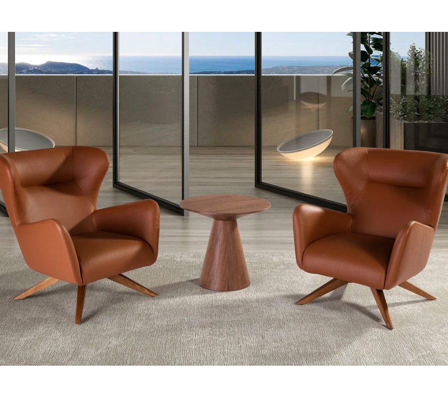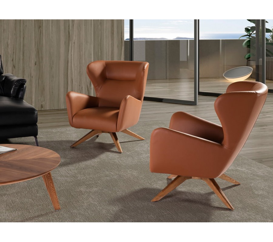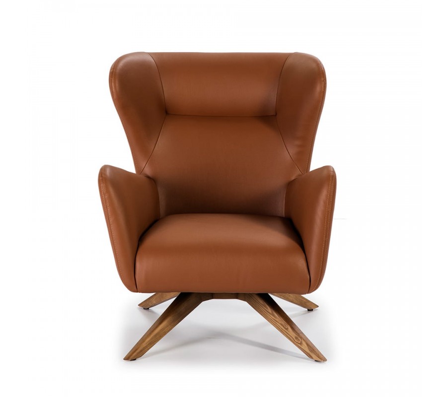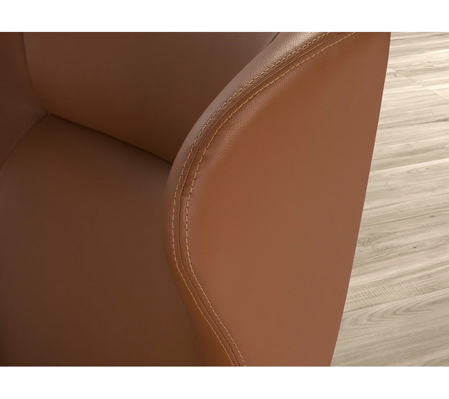 V dizajne dominuje nádherný koňakovo hnedý odtieň poťahu z eko kože. Pôsobí luxusným dojmom a jeho teplé tóny výborne dopĺňajú drevené nožičky v orechovej hnedej farbe. Viditeľná kresba letokruhov zdôrazňuje prírodný charakter materiálu a kreslo tak bude v miestnosti pôsobiť ako naturálny element.