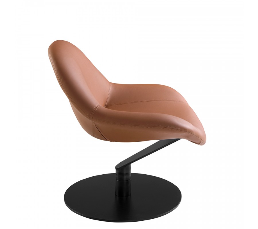 Z prednej časti sedacej časti vychádza plochá diagonálna línia, ktorá sa pripája k nohe kresla. Toto netradičné umiestnenie vytvára striktný rovný dizajnový prvok, kontrastujúci s oblými tvarmi. Noha má valcovitý tvar s otočným mechanizmom a napája sa na širokú okrúhlu podstavu. Prevedenie z nehrdzavejúcej ocele v matnej čiernej farbe zdôrazňuje moderný charakter nábytku a zároveň pôsobí minimalistickým dojmom.