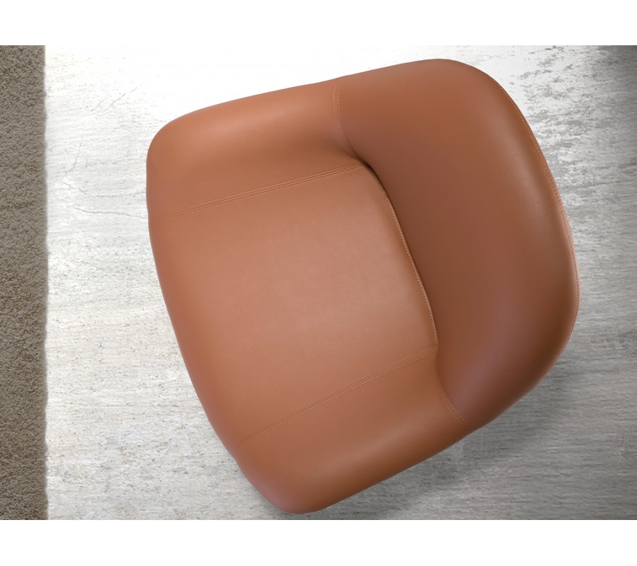 Kreslo má modernú siluetu, v ktorej dominujú elegantné zaoblené tvary a hladké povrchy. Sedadlo prechádza v plynulej krivke do nízkych bočných opierok a vizuálne ich oddeľuje minimalistické lineárne prešívanie poťahu. Chrbtová opierka sa zase napája na bočné opierky a postupne sa zužuje do oblúkového tvaru.