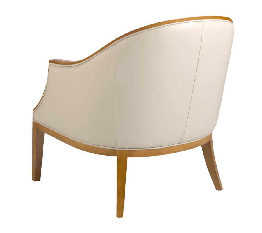 Luxusný charakter kresla zdôrazňuje jeho poťah z pravej kože. Má elegantnú, béžovo-sivú farbu v štýlovom odtieni taupe. Svetlé tóny výborne korešpondujú s bohatou, medovo hnedou farbou drevených prvkov. Tieto materiály pôsobia naturálnym dojmom a dizajnu dodávajú harmonický vizuál s teplým nádychom.