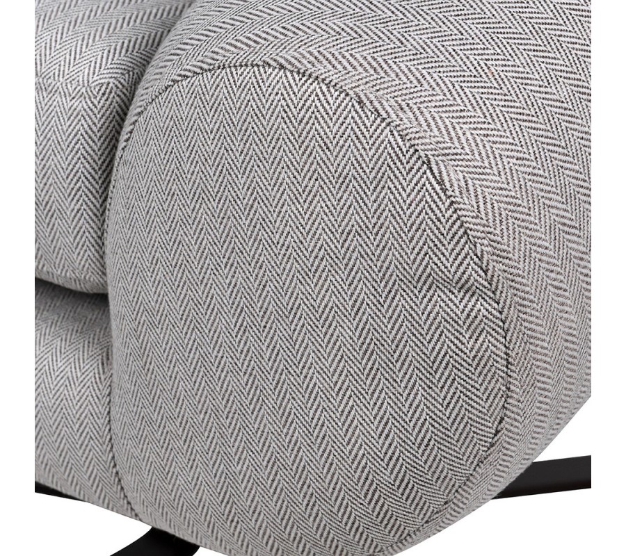 Dominantným prvkom kresla je jeho široká sedacia časť s nízkou opierkou, ktorá zaručuje pohodlné sedenie. Kreslo stojí na pevnej čiernej kovovej podstave, ktorá poskytuje stabilitu a moderný vzhľad. Kovová podstava v kombinácii so vzorovaným poťahom vytvára elegantný a harmonický dizajn.
