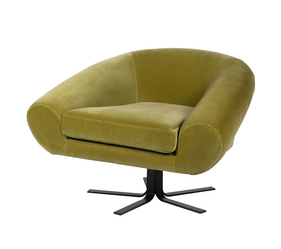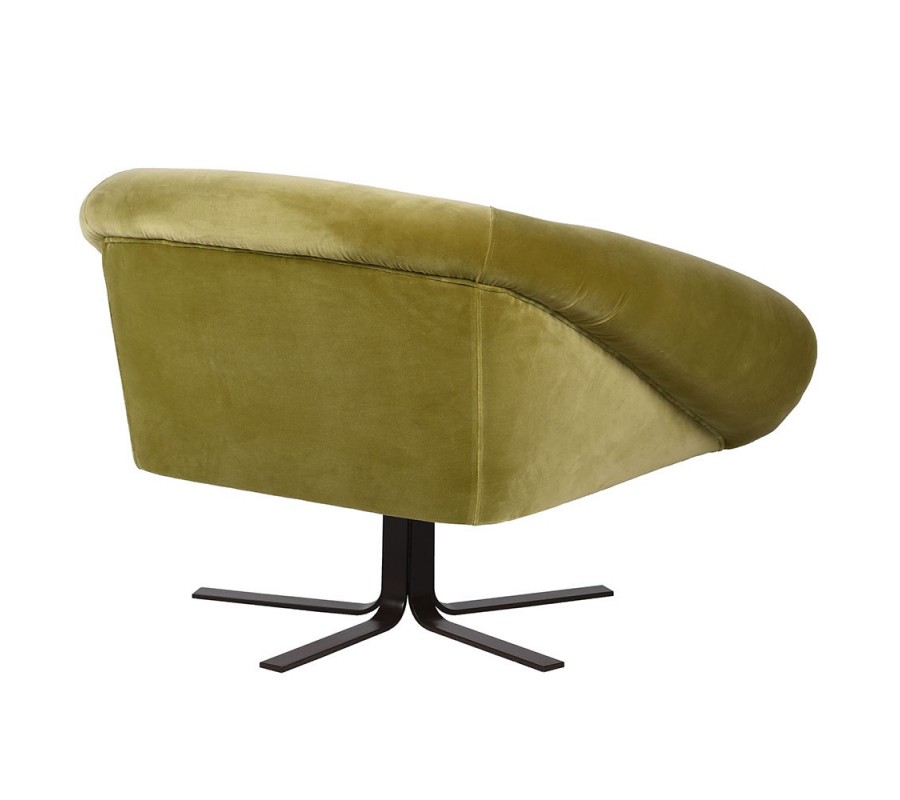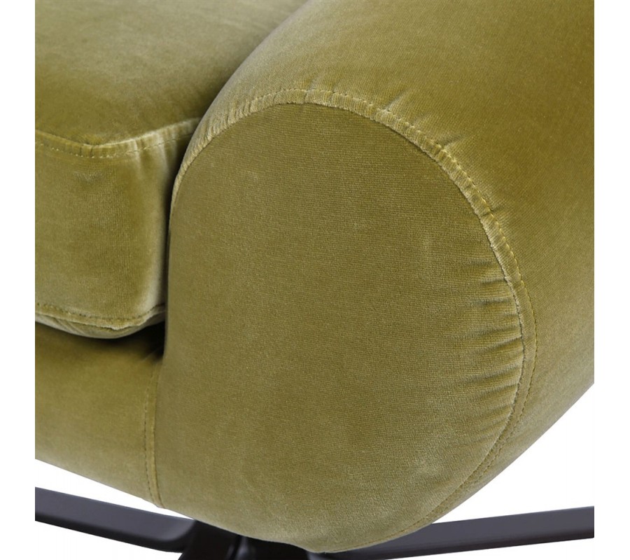 Dizajnové moderné otočné kreslo Sage so zamatovým olivovo zeleným poťahom a čiernou kovovou nohou 96 cm