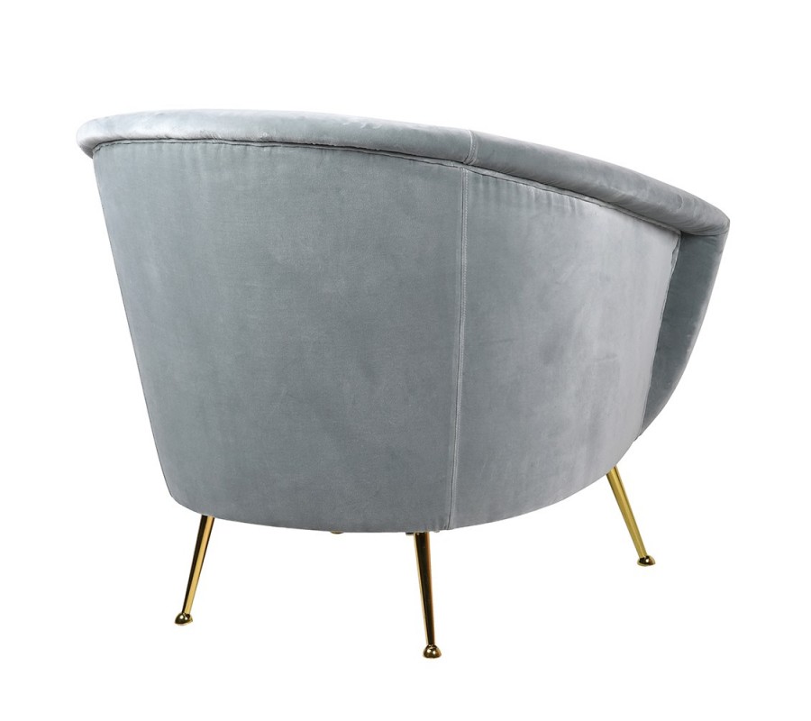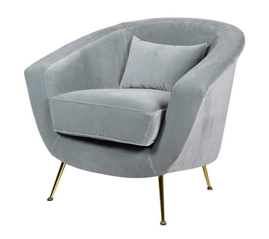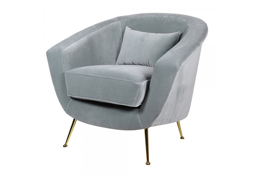 Art Deco dizajnové kreslo Stella so svetlo sivým zamatovým poťahom a zlatými nohami 85 cm