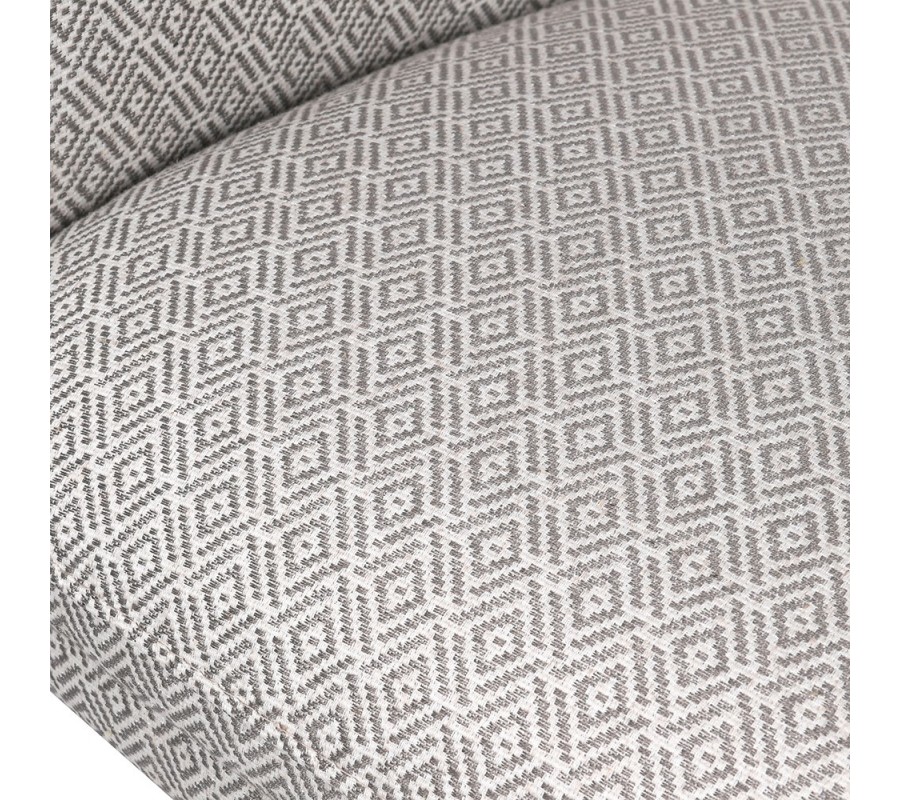 Textilný poťah zdobí subtílny tkaný geometrický diamantový vzor, ktorý vytvára zaujímavú vizuálnu štruktúru. Na bielom pozadí sú svetlým sivým vláknom vypletené menšie symetrické kosoštvorce. Táto kombinácia farieb pôsobí elegantným a uhladeným dojmom. V spojení s čiernym rámom zároveň vytvára sofistikovanú monochromatickú paletu.