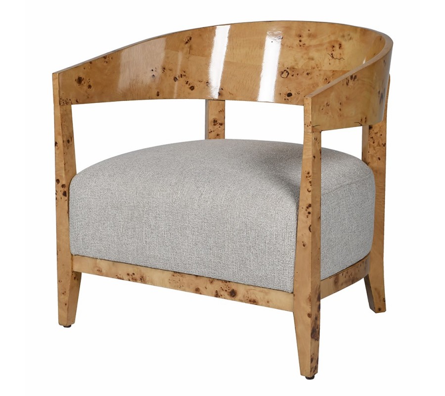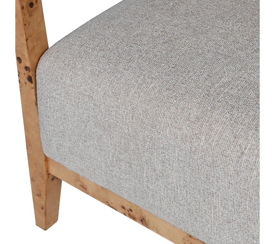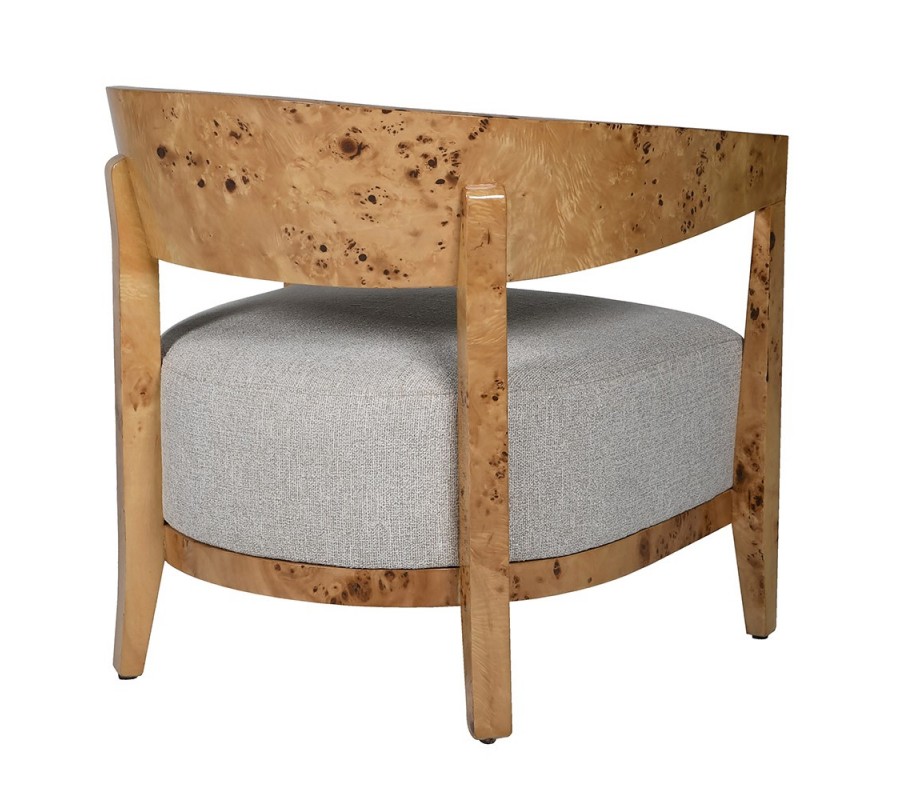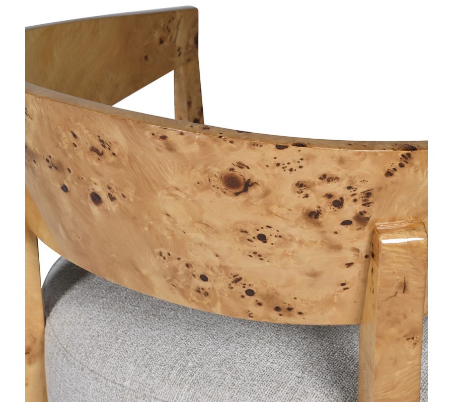 Kreslo má výrazný drevený rám v naturálne svetlej hnedej farbe. Nepravidelná kresba v tmavších odtieňoch je charakteristická pre burlové drevo, ktoré dodáva každému kusu nábytku jedinečný vzhľad. Tento materiál sa získava z nevypučaných výhonkov stromov a je vyhľadávaný vďaka svojej atypickej vizuálnej štruktúre a vysokej tvrdosti.