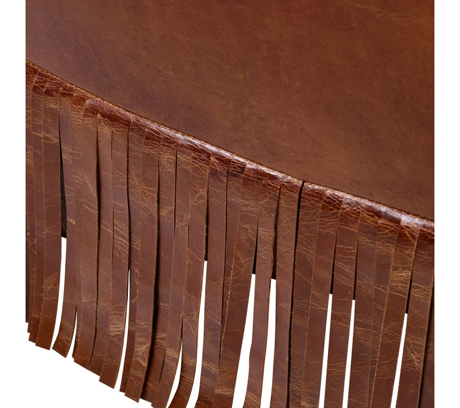 Originálnym detailom kresla sú jeho dlhé úzke a precízne vyrezané kožené strapce lemujúce obvod na spodnej časti. Dodávajú kreslu jedinečný nádych westernového a bohémskeho štýlu.