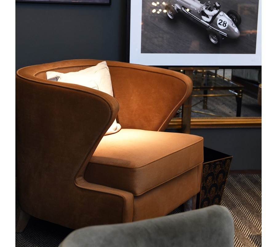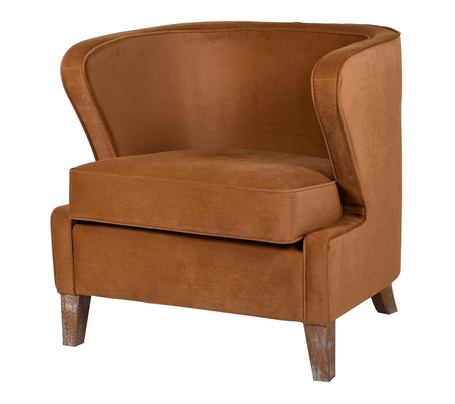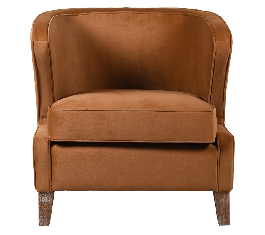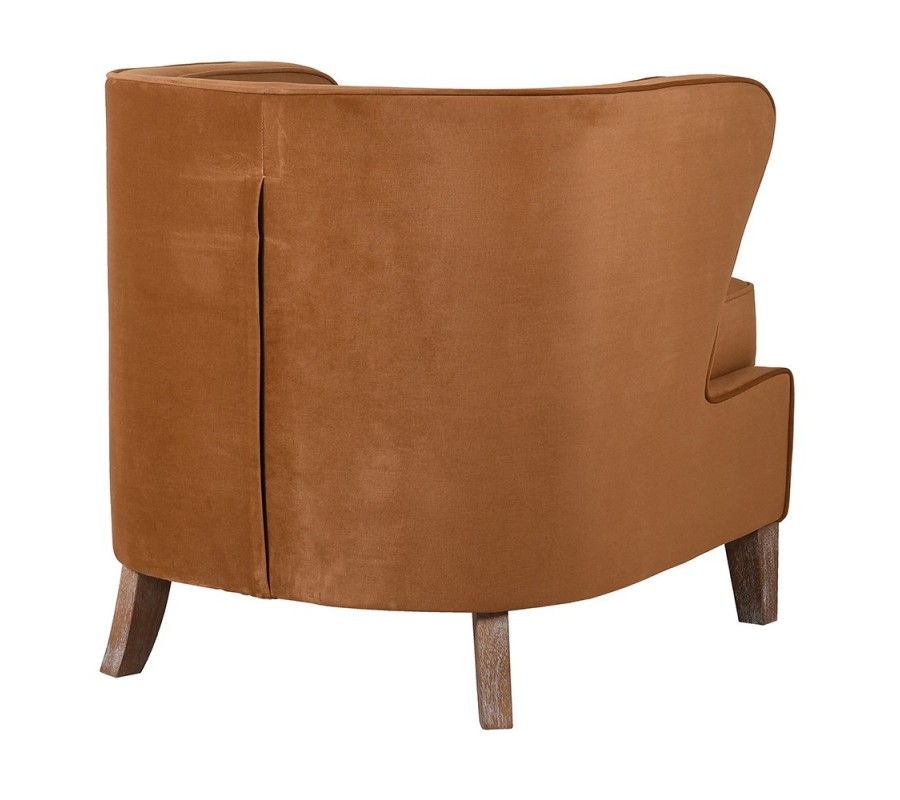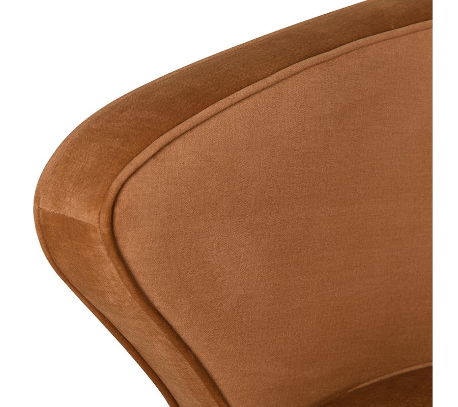Kreslo s elegantným dizajnom má zaoblený tvar operadla, ktoré plynulo prechádza do bočných opierok na ruky, čím poskytuje pohodlnú oporu. Čalúnenie v teplom karamelovo-hnedom odtieni vytvára pocit útulnosti a vynikne v interiéroch s prírodnými tónmi. Povrch je zamatový, jemne lesklý a na dotyk príjemný.