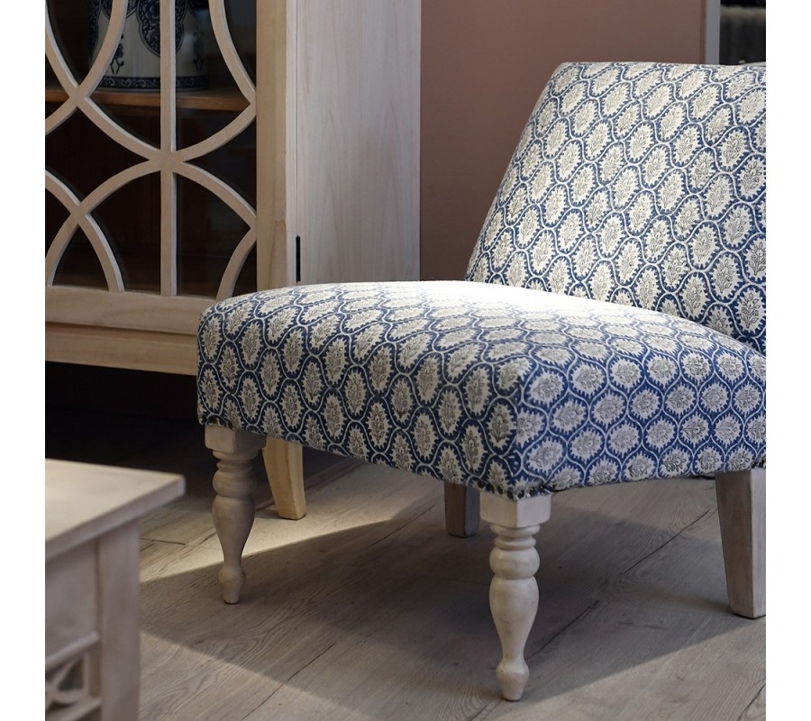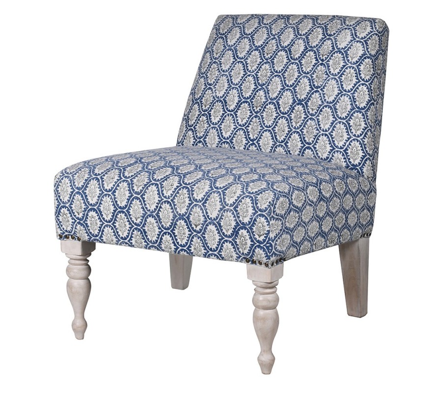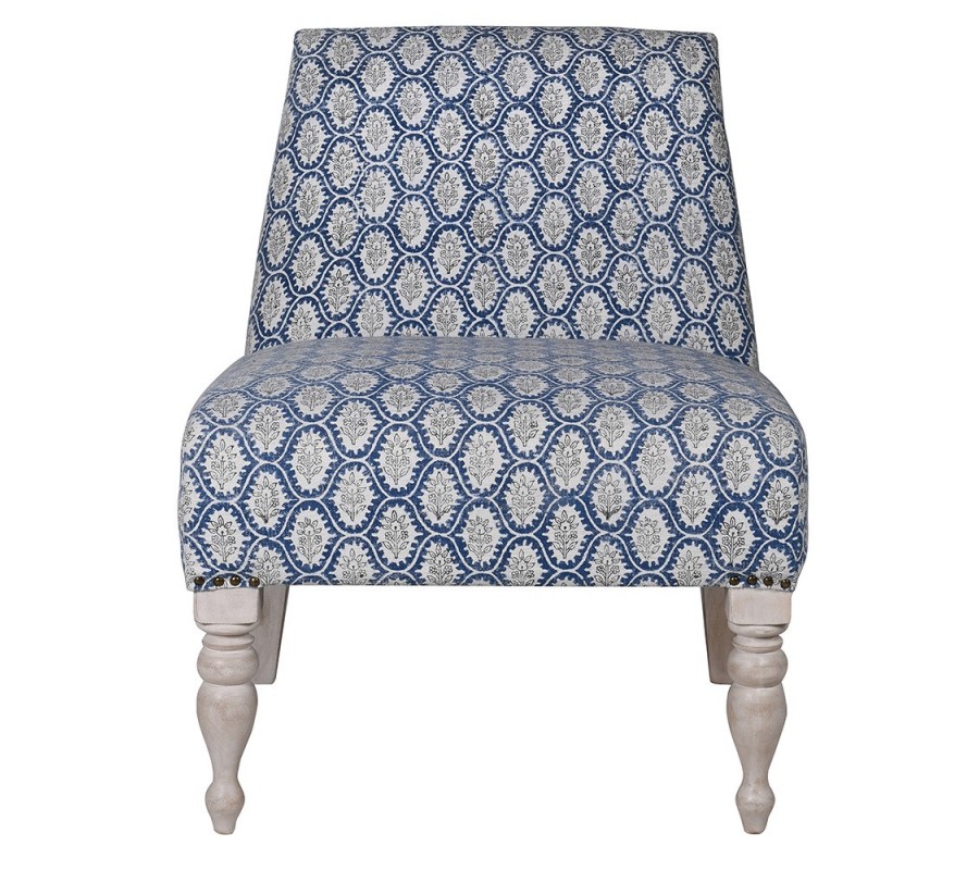 Dizajnové vidiecke kreslo Silvia so vzorovaným modrým poťahom a vyrezávanými bielymi drevenými nožičkami 77 cm