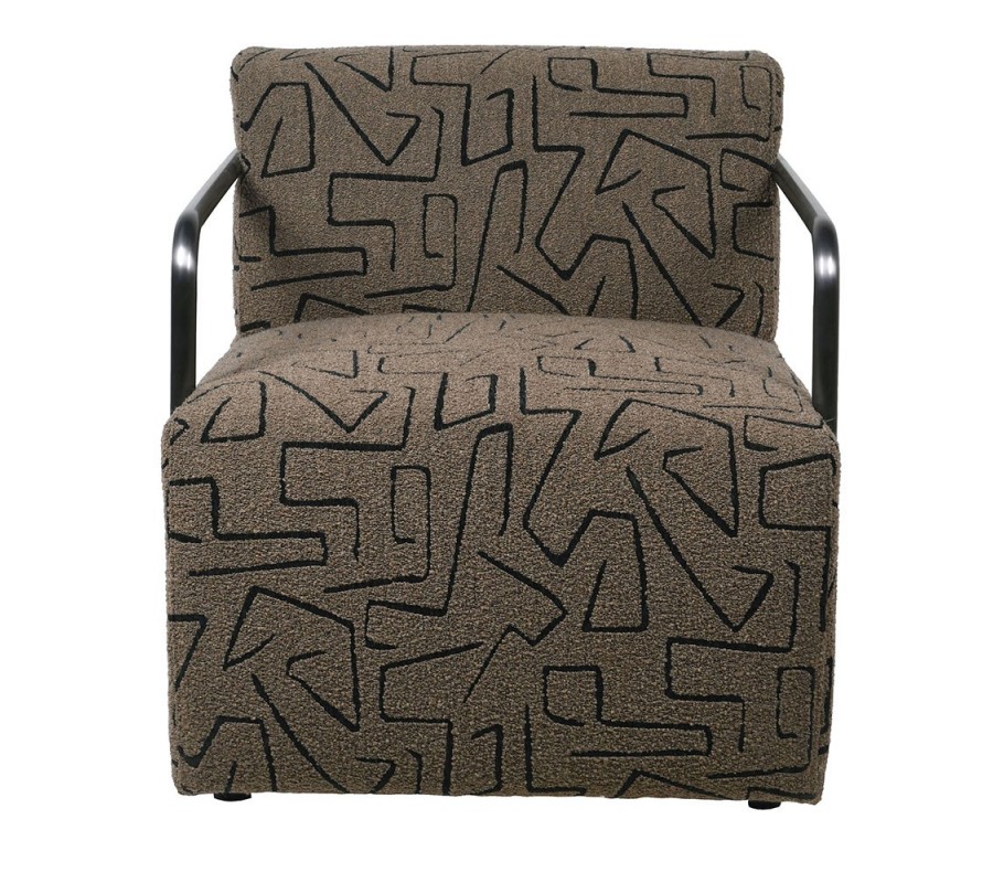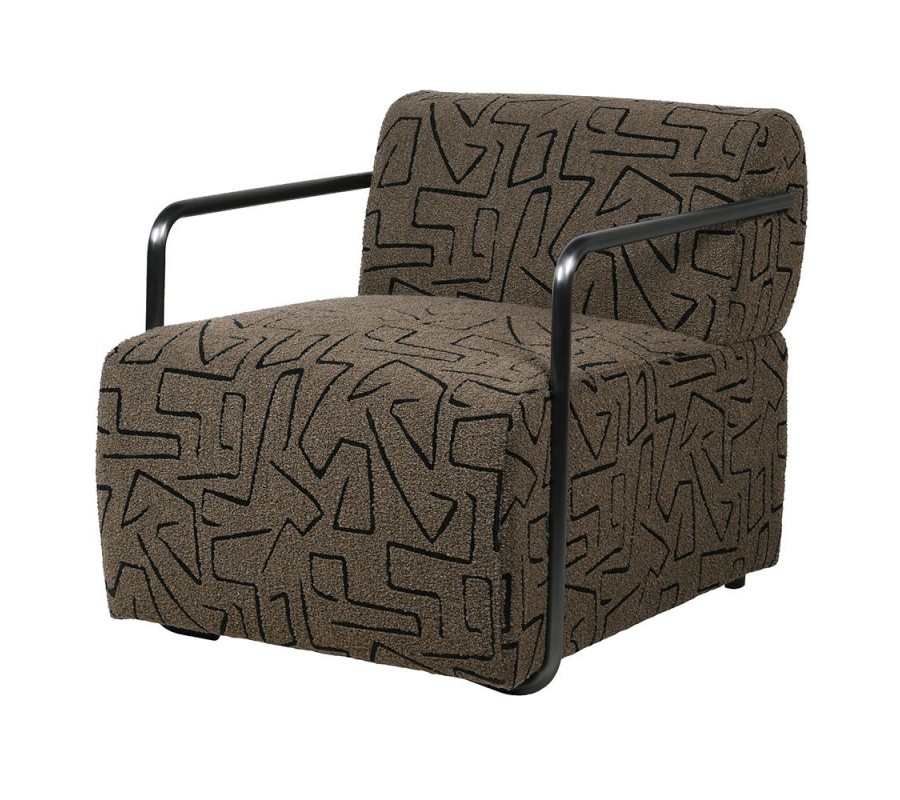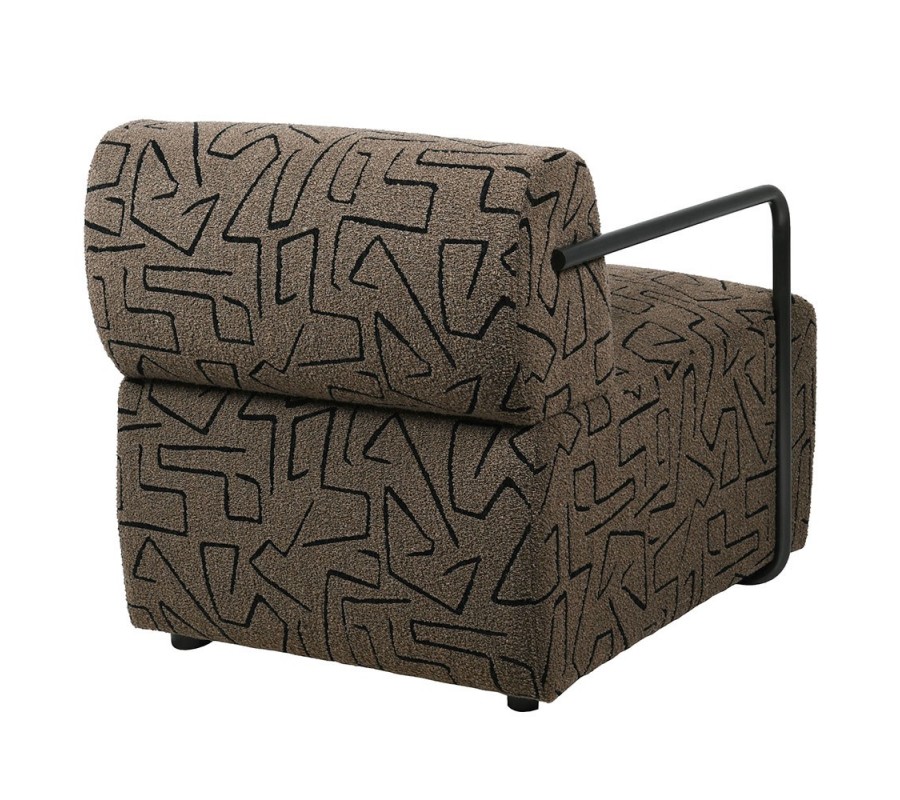 Kreslo má pevnú drevenú konštrukciu, ktorá je obalená penovým čalúnením. Okrem pohodlného sedenia vytvára aj jemne zaoblené tvary, ktoré pôsobia útulným dojmom. Opierky na ruky sú vyrobené z kovu v čiernej farby a prinášajú do dizajnu nádych industriálneho štýlu. Tvorí ich súvislá valcovitá línia, ktorá sa na bokoch pripája k chrbtovej opierke a plynie po stranách paralelne so sedacou časťou. Po bočných stranách prechádzajú smerom dole, kde plnia funkciu predných nožičiek. Zadné nožičky majú okrúhly tvar a sú tiež čierne.