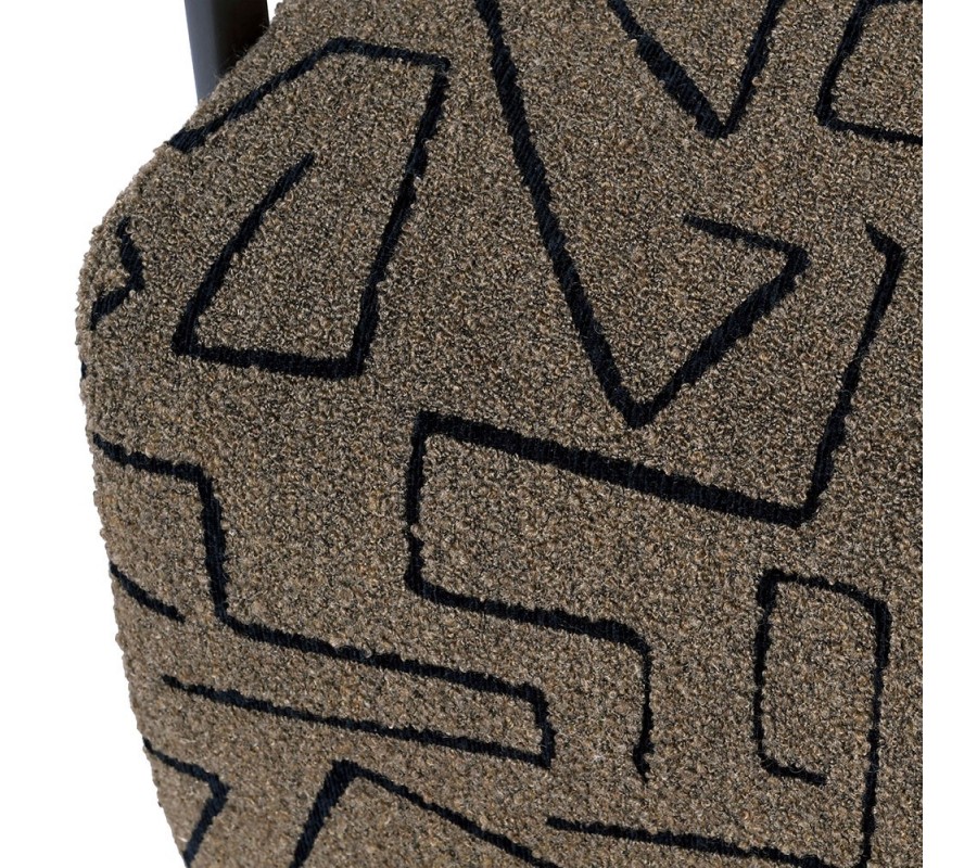 Poťah je vyrobený z mikrovlákna, ktoré mu zaručuje výbornú odolnosť. Jeho olivovo zelená farba pôsobí elegantným dojmom. Má hrubú kučeravú štruktúru, v ktorej sú prehĺbené asymetrické vzory. Ich čierna farba a tvary korešpondujú s opierkami a dodávajú kreslu moderný rozmer.