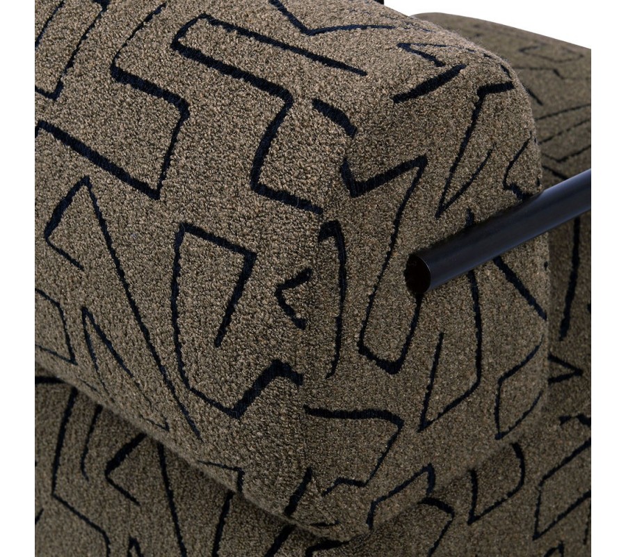 Dizajnové moderné kreslo Miria s poťahom v olivovej zelenej farbe s asymetrickým čiernym vzorom a kovovými opierkami 65 cm