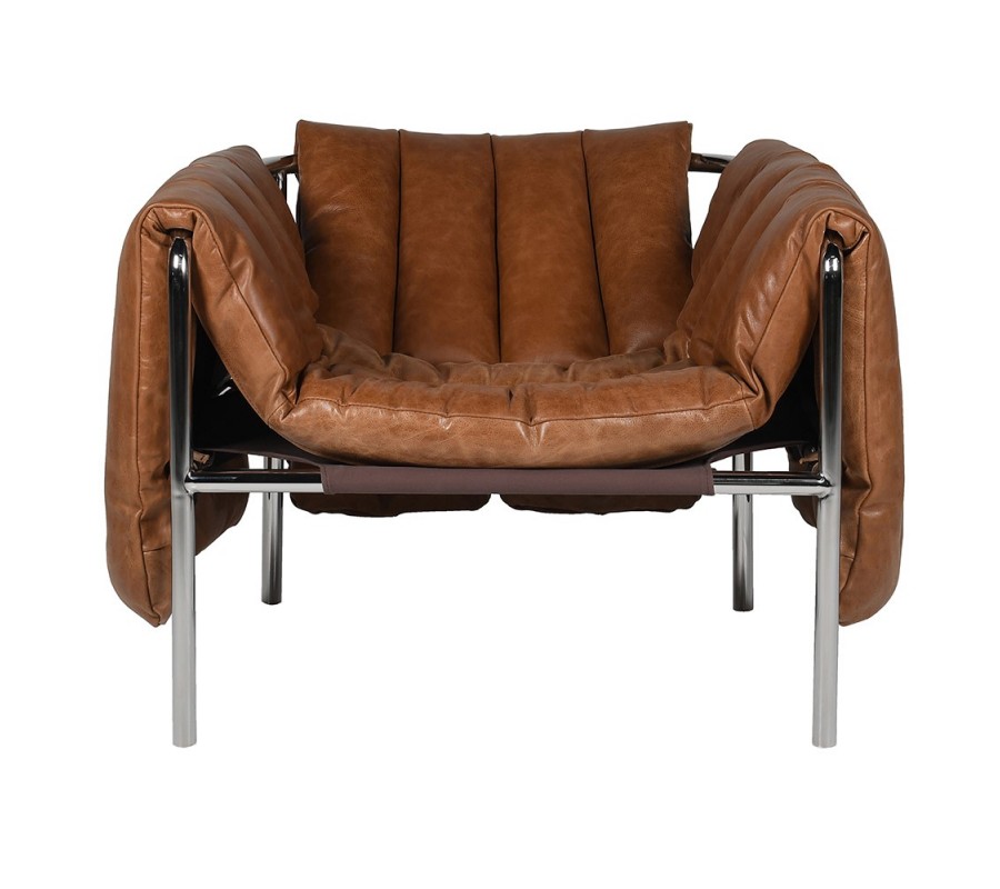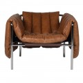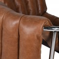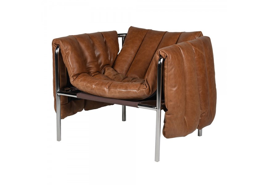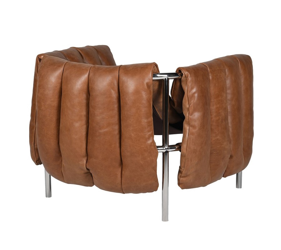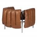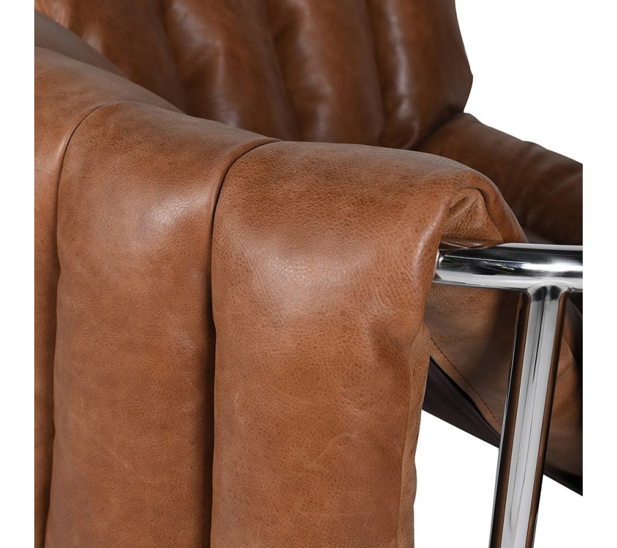 Rám křesla je vyroben z kovu s lesklou chromovou povrchovou úpravou. Čalounění s jemnou texturou je z pravé hnědé kůže, zdobené výraznými vertikálními švy. Měkké polstrování na sedací i opěrné části zaručuje pohodlné sezení, zatímco hranatý tvar rámu dodává konstrukci stabilitu a pevnost.