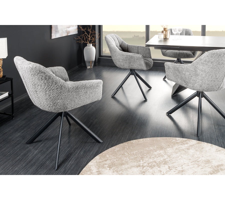 Otočná jedálenská stolička ponúka kombináciu pohodlia a moderného dizajnu, čo ju robí vhodnou na použitie v kancelárii aj jedálni. Poťah je z boucle látky v šedom odtieni, ktorá dodáva mäkkosť na dotyk a zároveň vytvára zaujímavú textúru.
