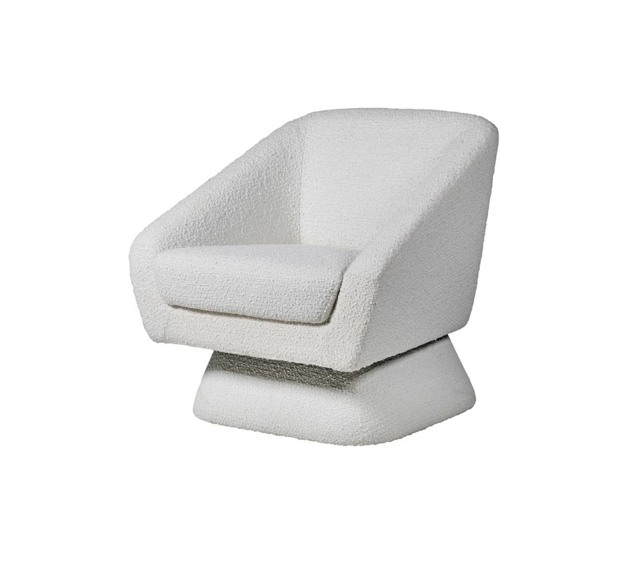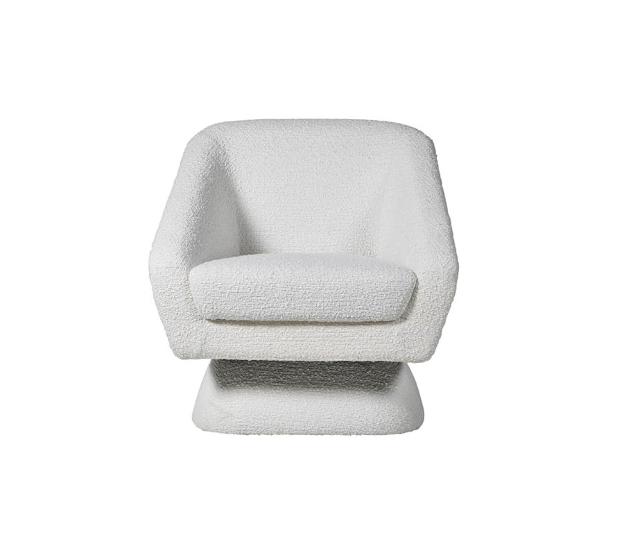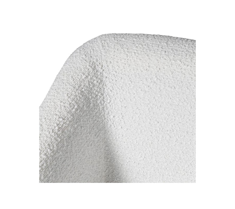 Kreslo je čalúnené, čo zjemňuje jeho rovné hrany a rohy. Sedacia časť aj noha sú potiahnuté buklé látkou v čistej bielej farbe. Materiál je príjemný na dotyk a jeho povrch zároveň vytvára zaujímavú vizuálnu štruktúru, ktorá oživuje geometrický dizajn.