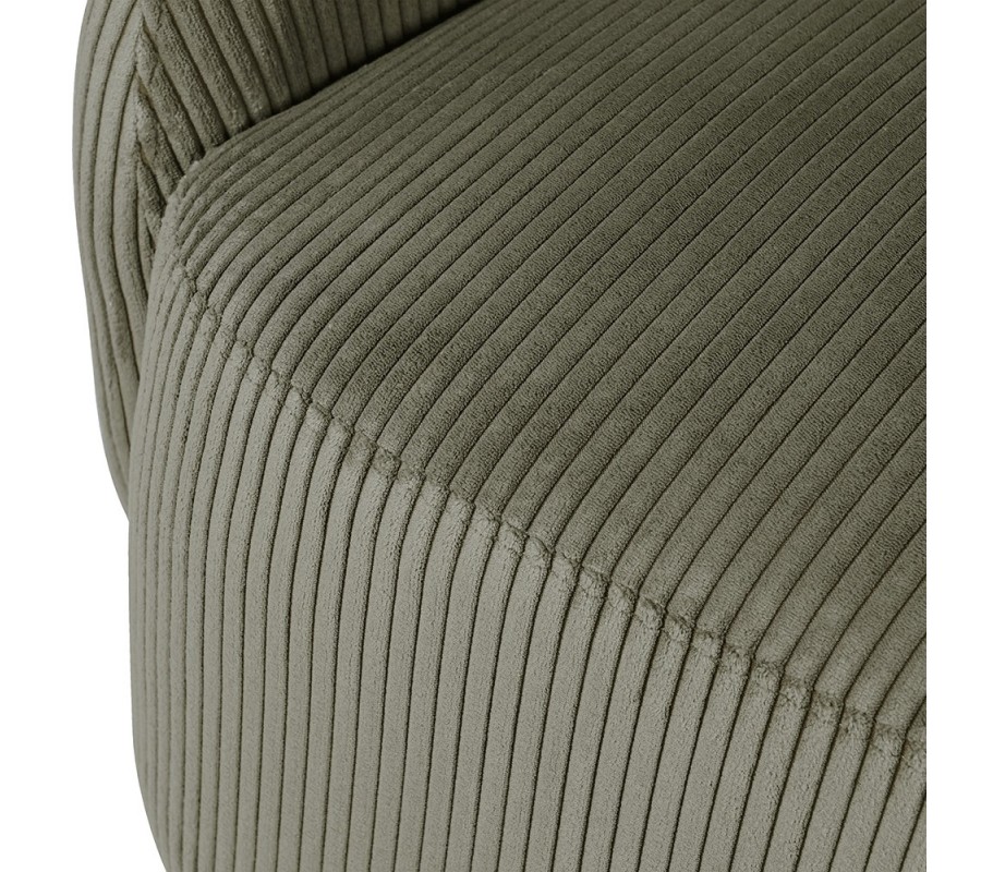 Konštrukcia kresla je vyrobená z kaučukovníkového dreva a pokrýva ju mäkké penové čalúnenie. Pohodlie zvyšuje aj na dotyk príjemný poťah s kordovou štruktúrou. Výrazný lineárny vzor pôsobí sofistikovaným dojmom a zdôrazňuje elegantný vizuál nábytku. Poťah je vyrobený z mikrovlákna v šalviovej zelenej farbe. Pôsobí sviežim dojmom a pastelové prevedenie je zároveň jemné.