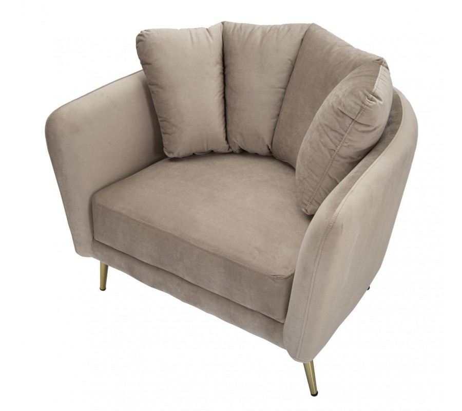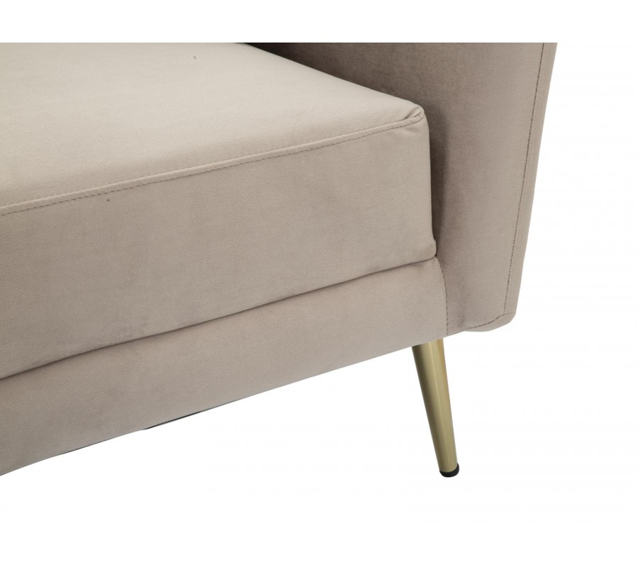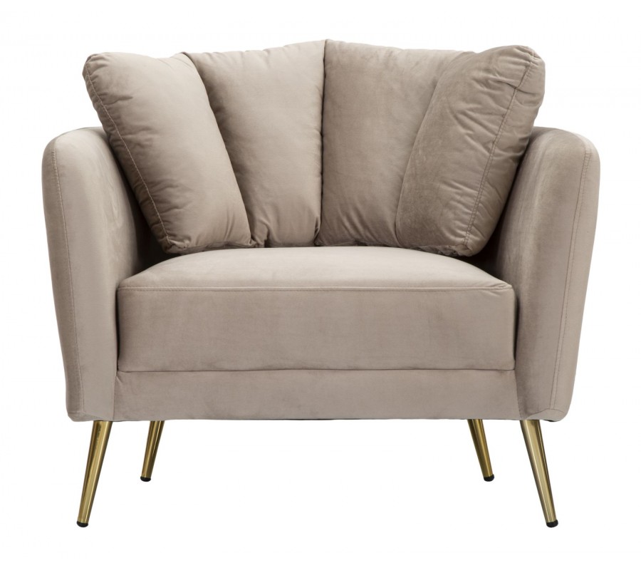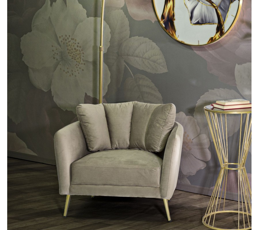 Široké, jemne zaoblené opierky na ruky plynule nadväzujú na celkový dizajn, čím zabezpečujú maximálne pohodlie. Výrazným prvkom sú štíhle kovové nožičky v zlatej farbe, ktoré kreslu dodávajú ľahkosť a vizuálnu eleganciu, zatiaľ čo zároveň podčiarkujú jeho glamour štýl.
