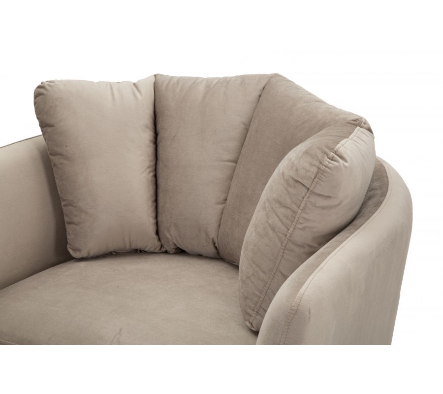 Luxusné kreslo Lana v art deco a glamour štýle kombinuje eleganciu, pohodlie a sofistikovaný dizajn. Jeho zamatový poťah v jemnej sivej farbe pôsobí mimoriadne príjemne na dotyk a dodáva interiéru nádych exkluzivity. Tvar kresla je zaoblený, s mäkkými líniami, ktoré vytvárajú útulný a harmonický dojem. Bohato čalúnená sedacia časť poskytuje vysoký komfort, pričom zadná časť je doplnená tromi mäkkými vankúšmi. Stredný vankúš má dekoratívne prešívanie, ktoré zdôrazňuje jeho luxusný vzhľad a dodáva kreslu jedinečný charakter.