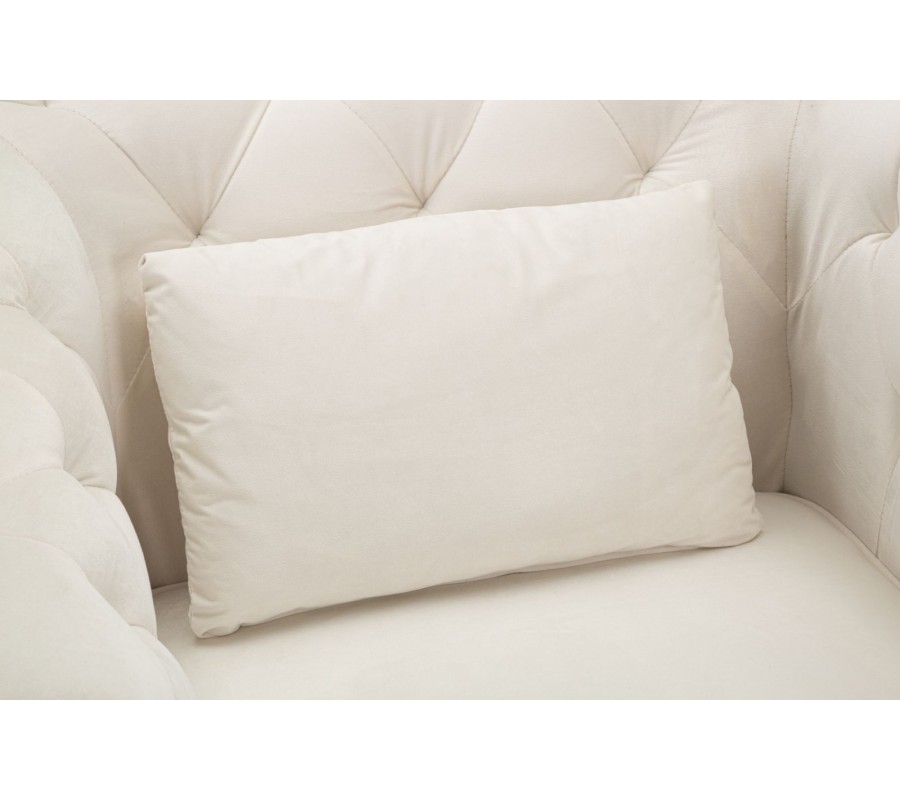 Jeho tvar je zaoblený a mohutný, čím vytvára pocit objatia a poskytuje výnimočný komfort. Sedacia časť je bohato čalúnená a doplnená o mäkký, veľký vankúš, ktorý ponúka optimálnu podporu pri sedení. Operadlo a vnútorné strany opierok zdobí klasické prešívanie v chesterfield štýle, čo dodáva kreslu výrazný a noblesný vzhľad. Súčasťou dizajnu je aj menší dekoratívny vankúš, ktorý ešte viac umocňuje pocit pohodlia.