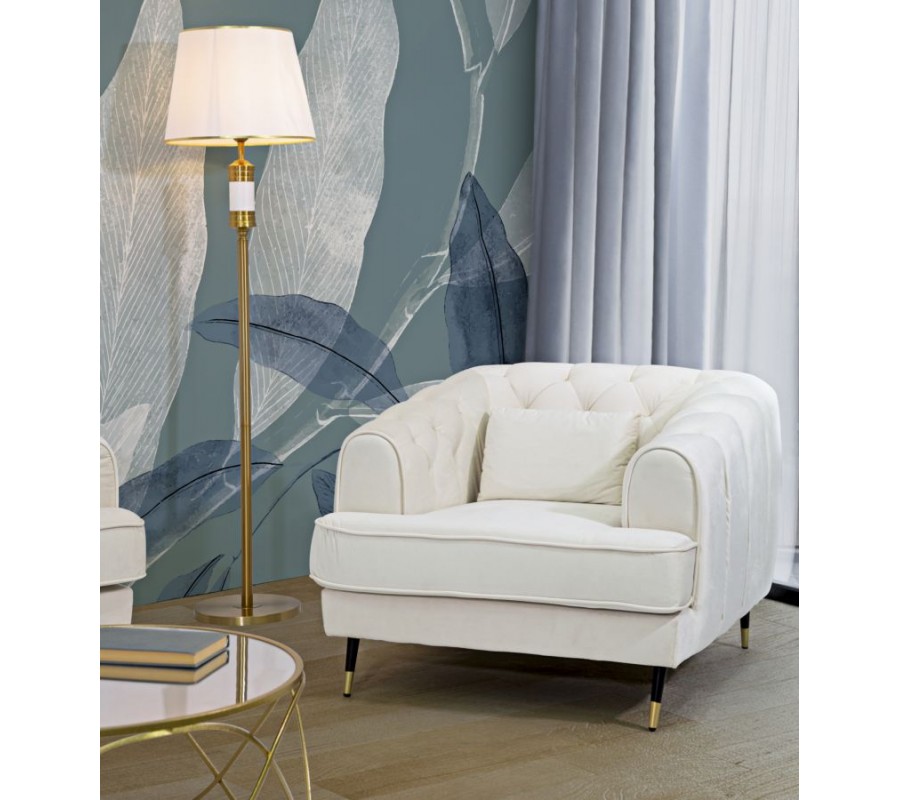 Opierky na ruky sú široké a mierne zaoblené, čím plynulo nadväzujú na operadlo a vytvárajú kompaktný a harmonický celok. Výrazným prvkom sú štíhle kovové nožičky v čiernej farbe so zlatými koncovkami, ktoré dodávajú kreslu ľahkosť a elegantný kontrast k jemnému čalúneniu.