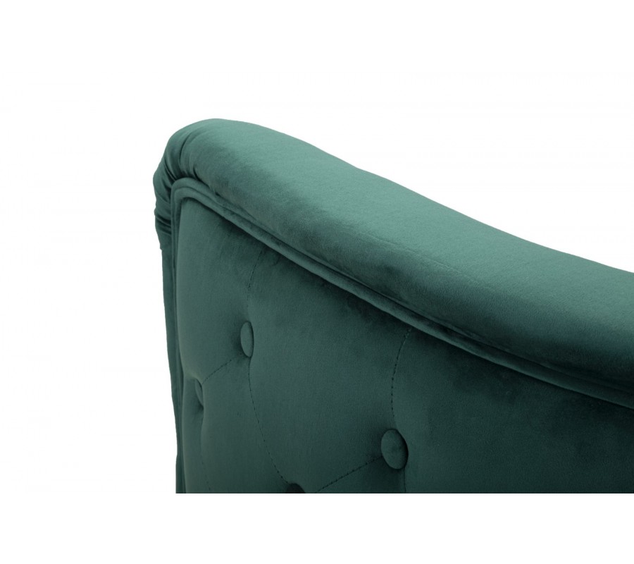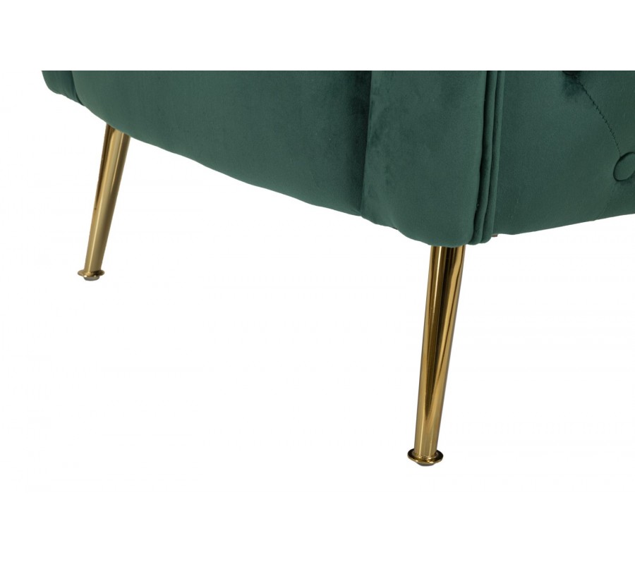 Štíhle kovové nožičky v zlatej farbe dodávajú kreslu ľahkosť a vytvárajú výrazný kontrast k smaragdovo zelenému čalúneniu. Ich mierne kónický tvar pôsobí elegantne a dokonale zapadá do glamour estetiky.
