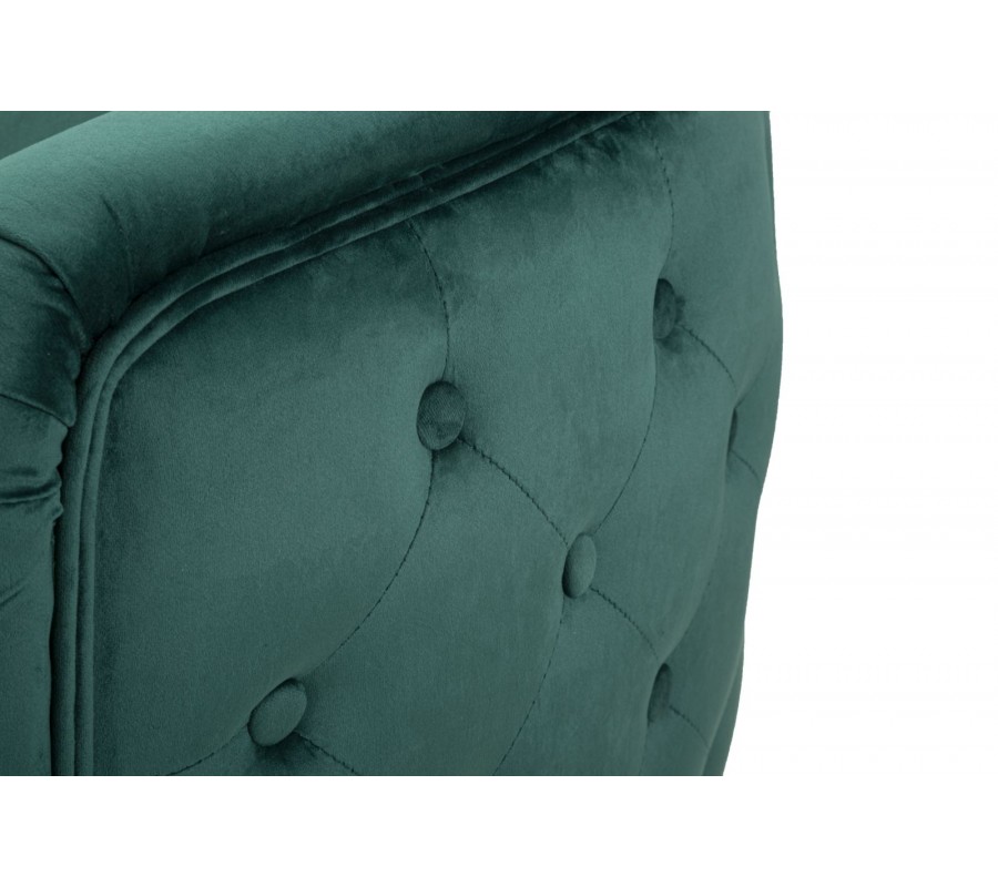 Opierky na ruky sú široké, jemne zaoblené a plynulo prechádzajú do operadla, čo vytvára súvislý a elegantný dizajn. Bočné strany a zadná časť kresla sú zdobené klasickým chesterfield prešívaním s hlbokými gombíkmi, ktoré podčiarkuje noblesný charakter kresla a zvýrazňuje jeho detailné remeselné spracovanie.