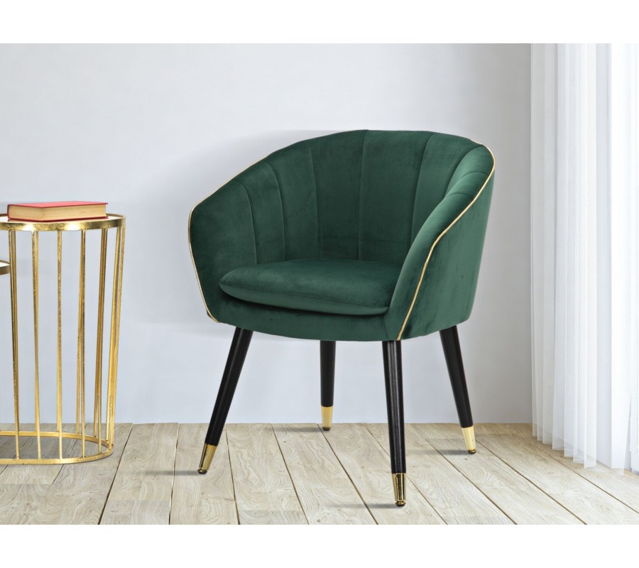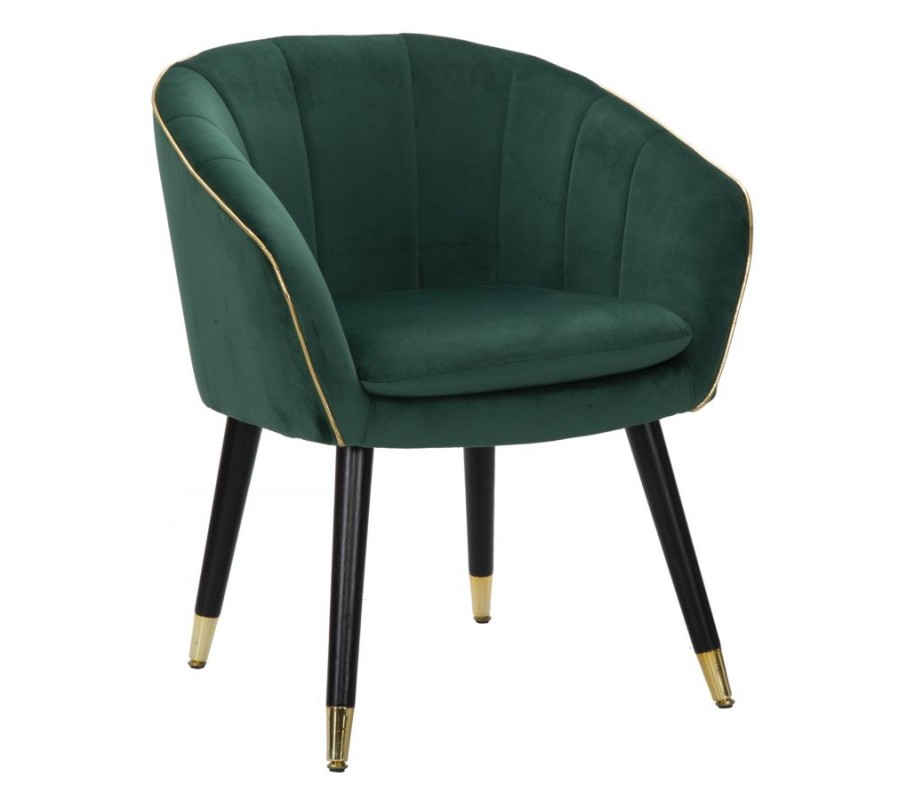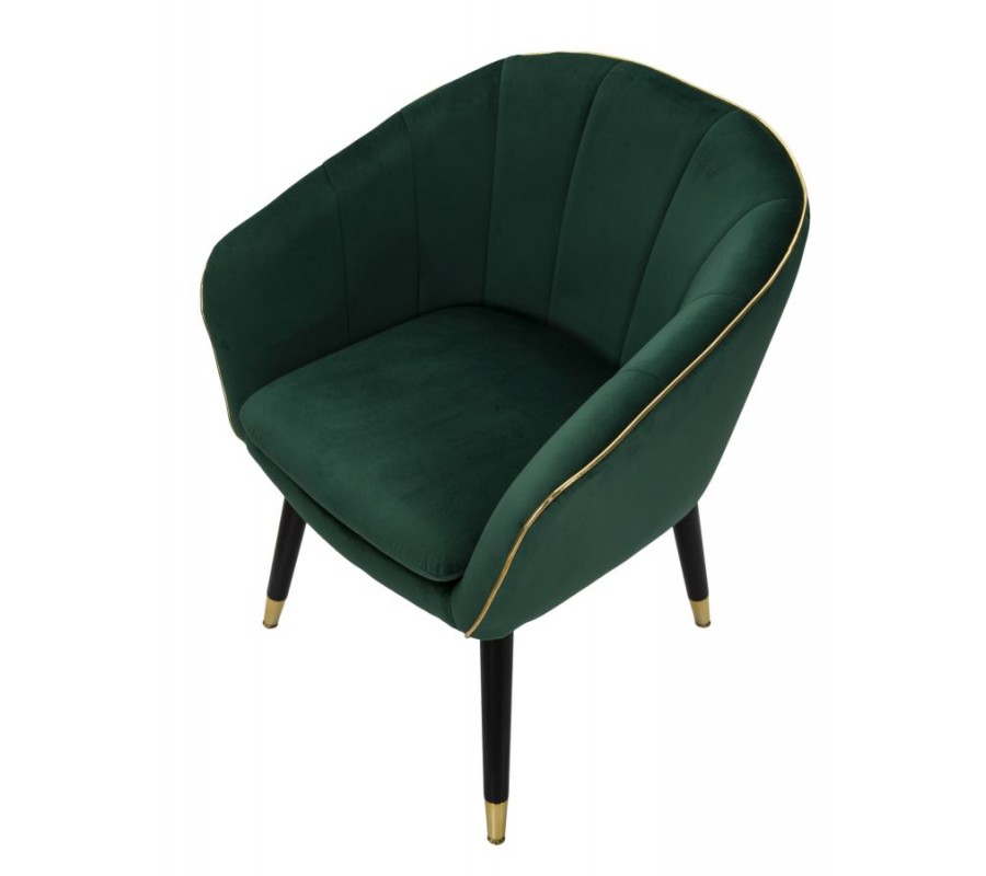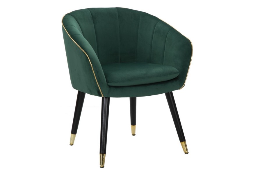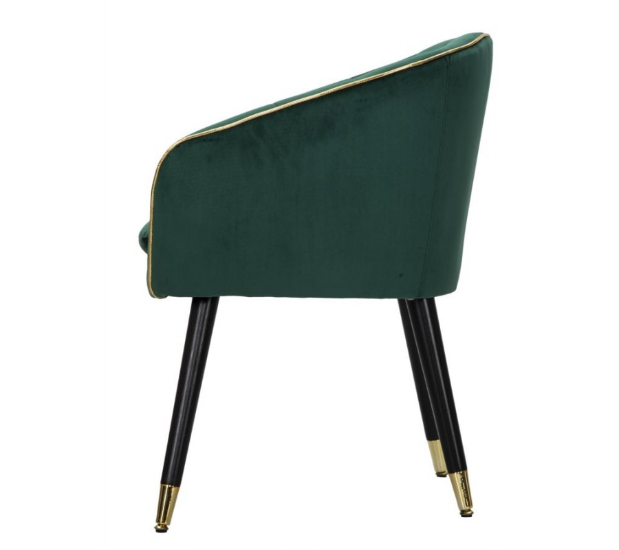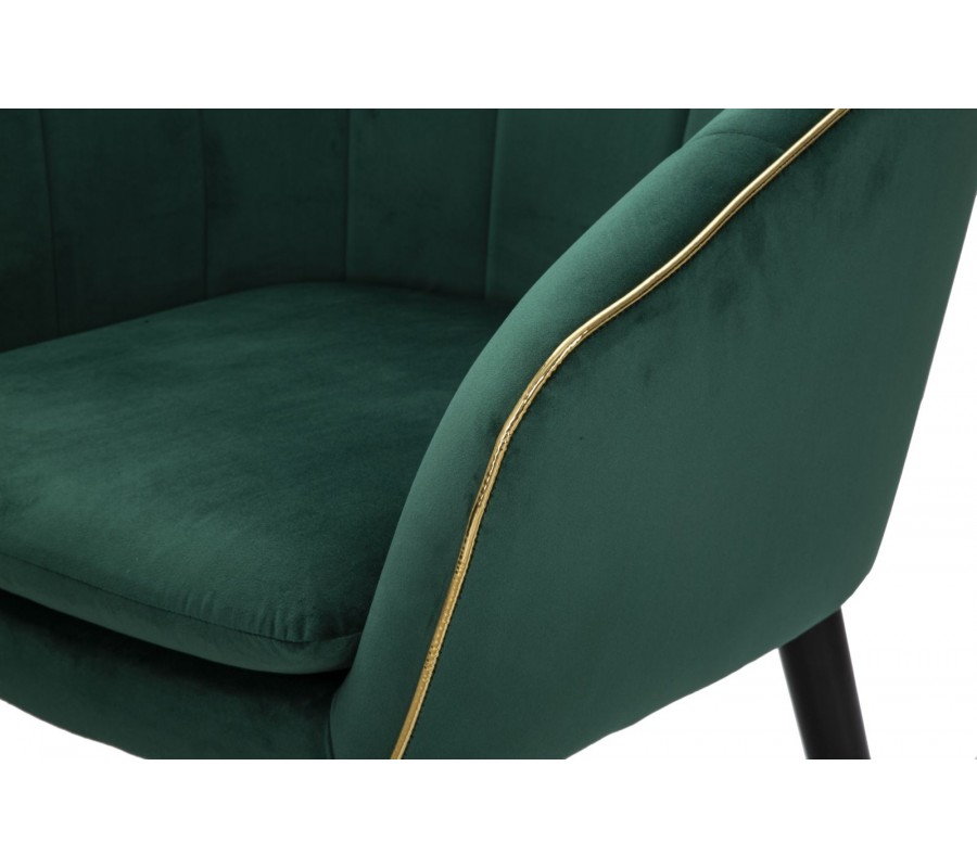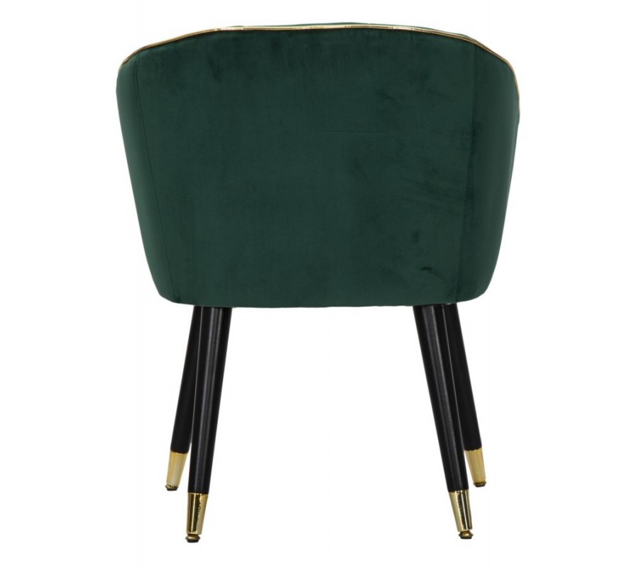 Výrazným detailom je jej zlaté lemovanie, ktoré kopíruje obrysy operadla a dodáva stoličke luxusný kontrast. Stabilitu zabezpečujú štíhle, mierne skosené nohy v čiernej farbe, ktoré sú zakončené kovovými prvkami v lesklom zlatom odtieni. Zakončenia dodávajú stoličke vizuálnu ľahkosť a zároveň ju chránia pred poškodením.
