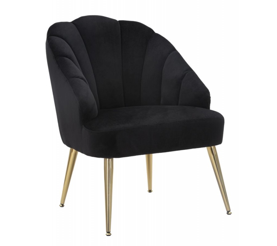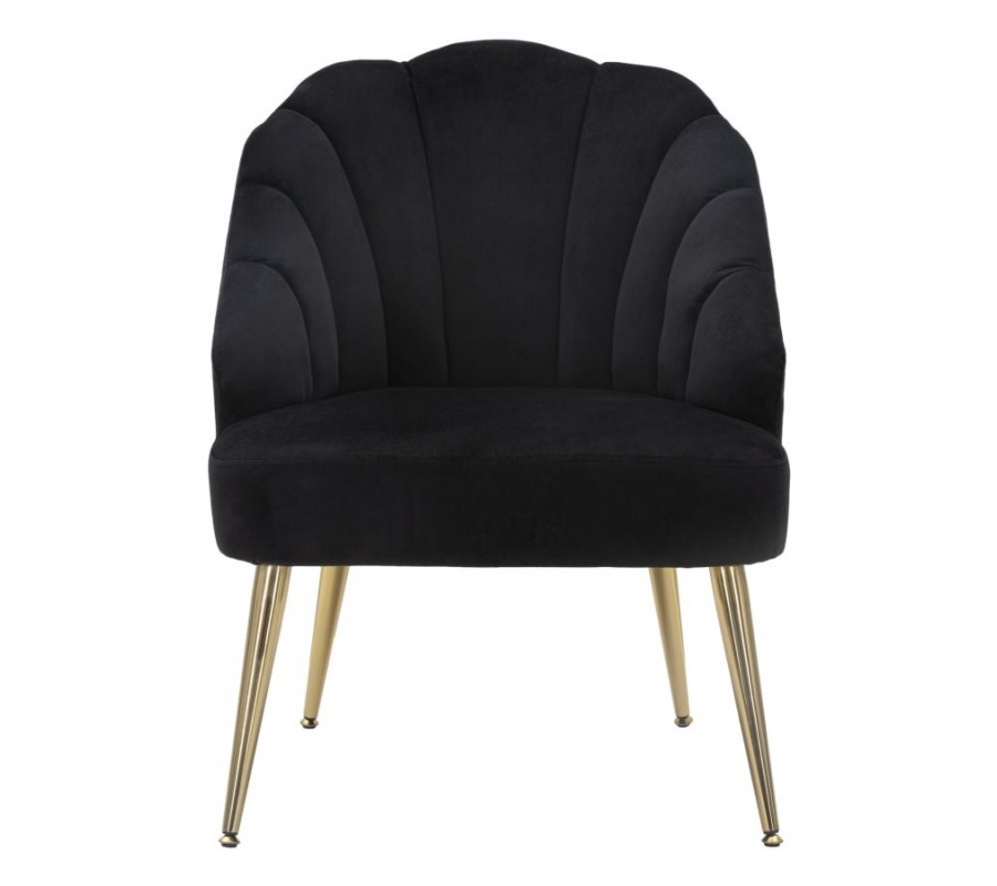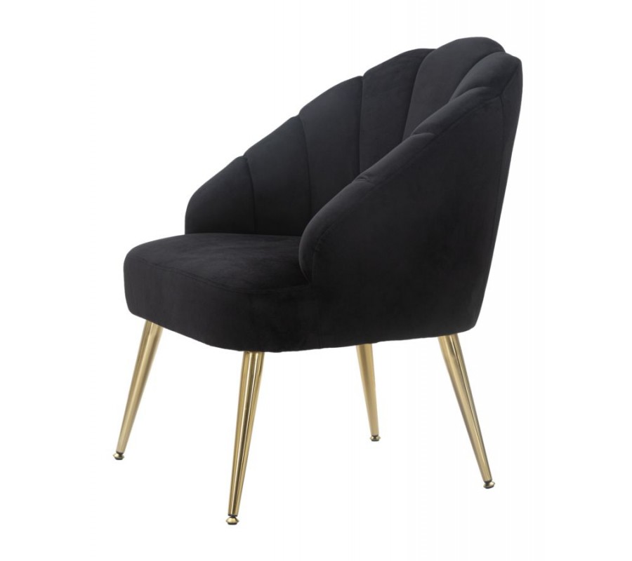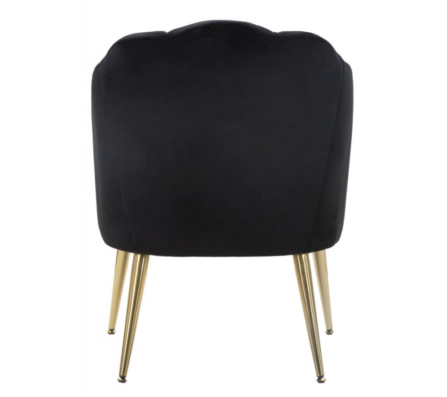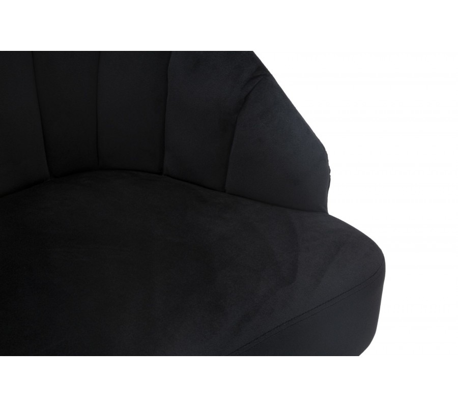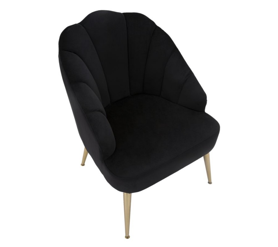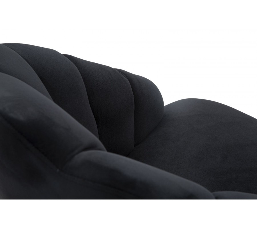 Operadlo je bohato čalúnené a prešívané do tvaru mušle, čo mu dodáva noblesný vzhľad a zároveň poskytuje pohodlnú oporu chrbta. Zamatový poťah v hlbokom čiernom odtieni podčiarkuje exkluzivitu kresla a zároveň príjemne pôsobí na dotyk.