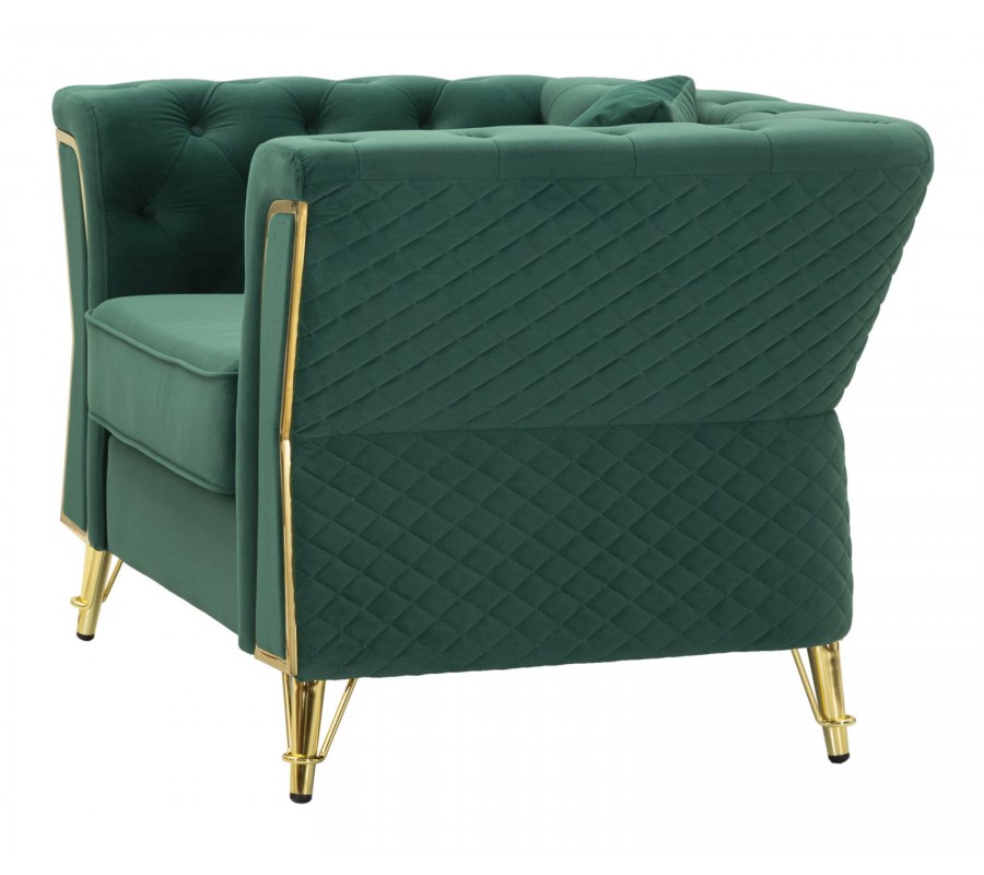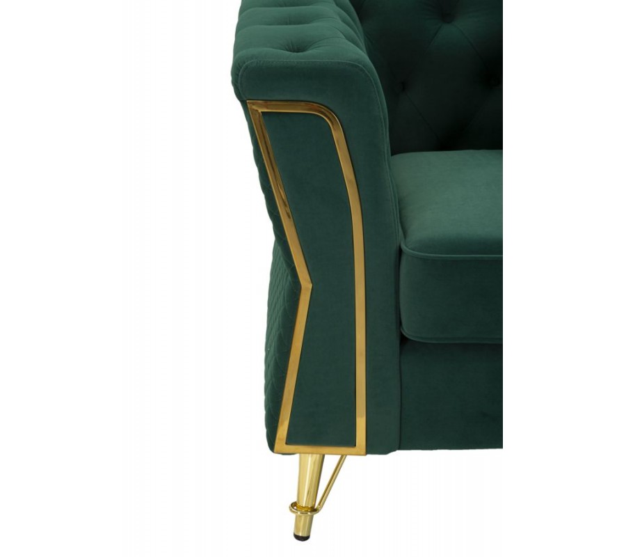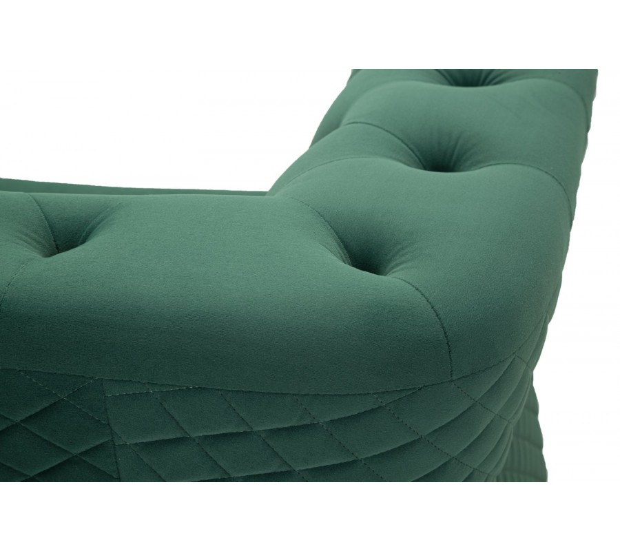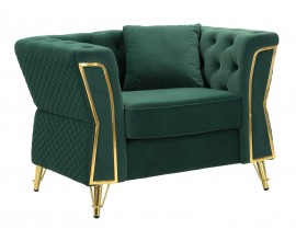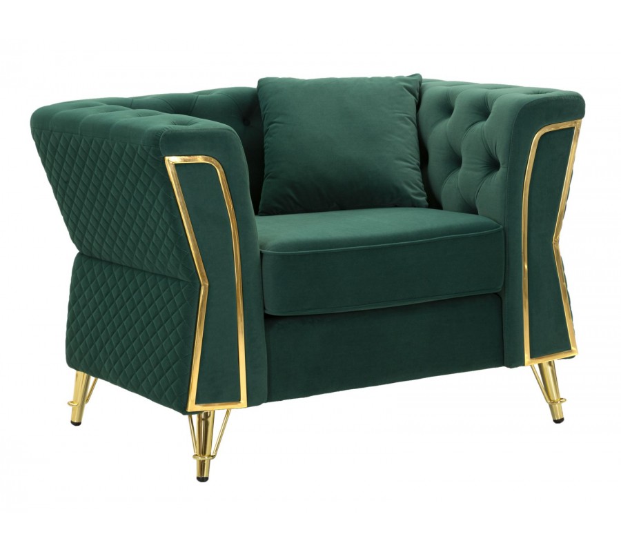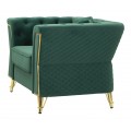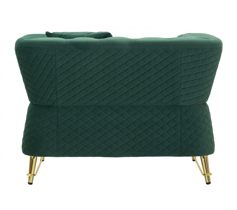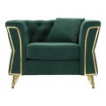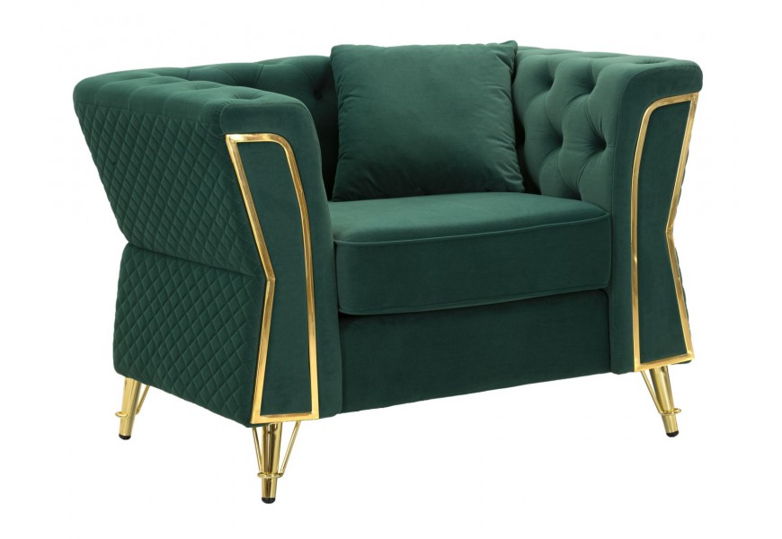 Glamour kreslo Velaria s tmavo zeleným zamatovým čalúnením s prešívaním so zlatými detailmi a kovovými nožičkami 104 cm