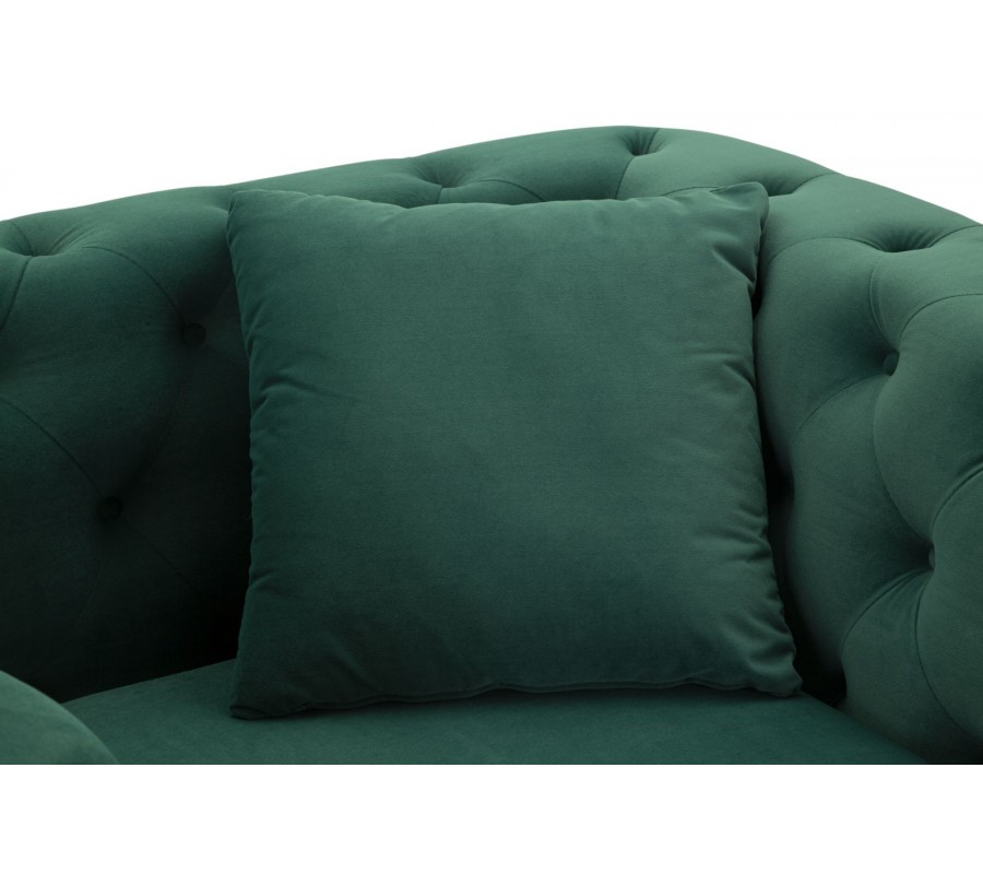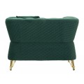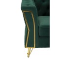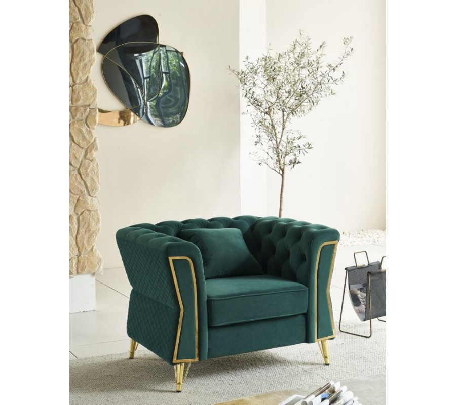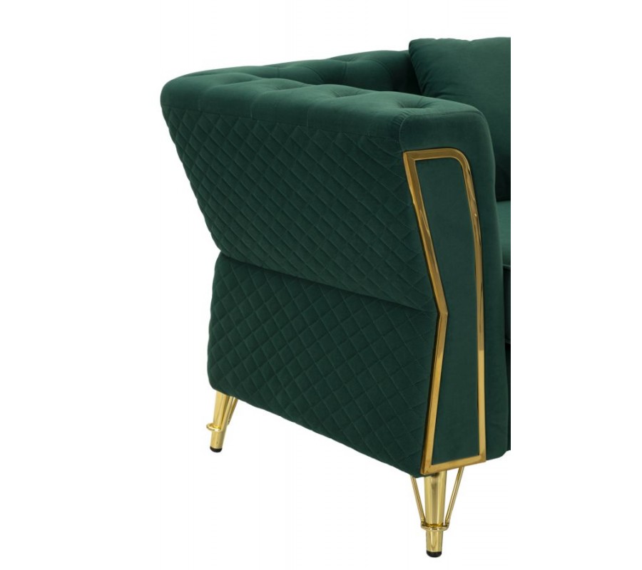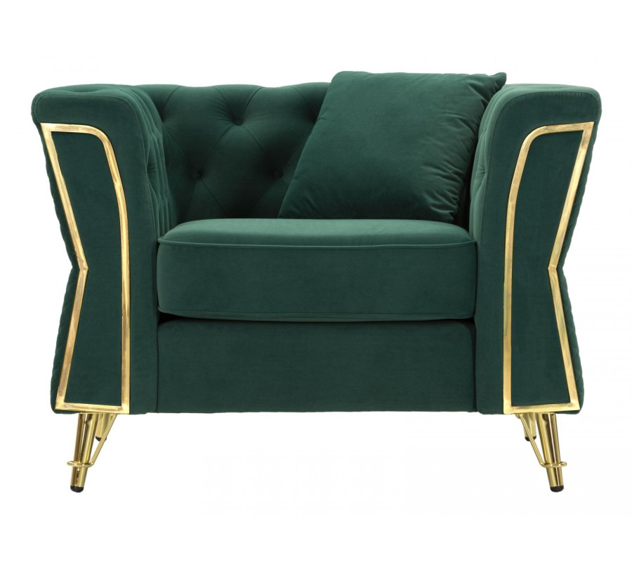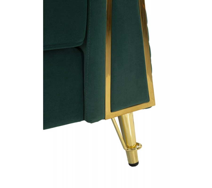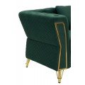 Glamour kreslo Velaria s tmavo zeleným zamatovým čalúnením s prešívaním so zlatými detailmi a kovovými nožičkami 104 cm