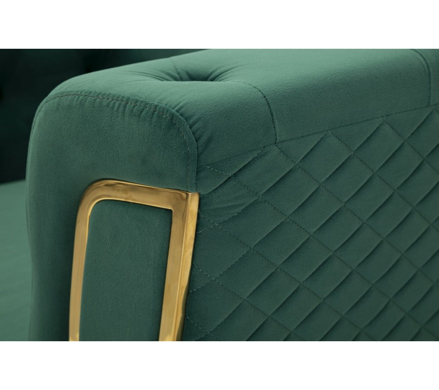 Vnútorná strana opierky je zdobená chesterfield prešívaním, ktoré zvýrazňuje nadčasový dizajn. Na zadných a bočných vonkajších stranách kresla sa nachádza prešívanie s diamantovým vzorom, ktoré dodáva textúru a eleganciu. Exkluzívny vzhľad podčiarkujú zlaté prvky na bočných opierkach, ktoré kreslu dodávajú punc luxusu.