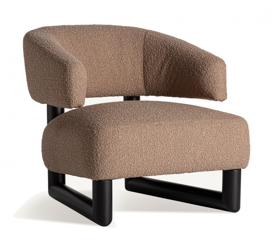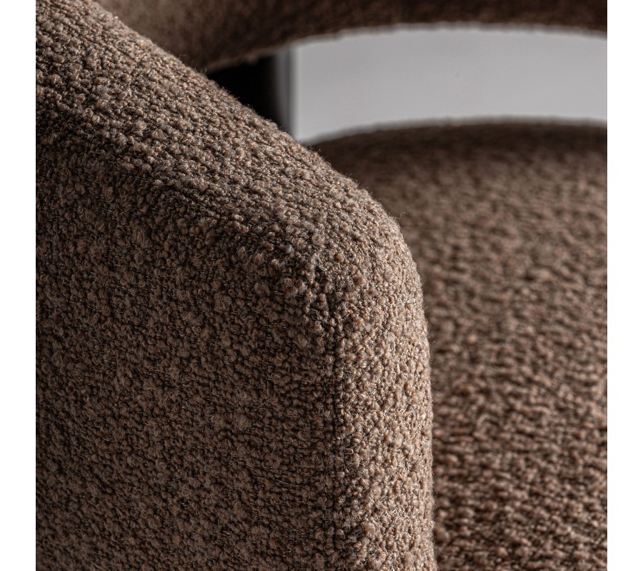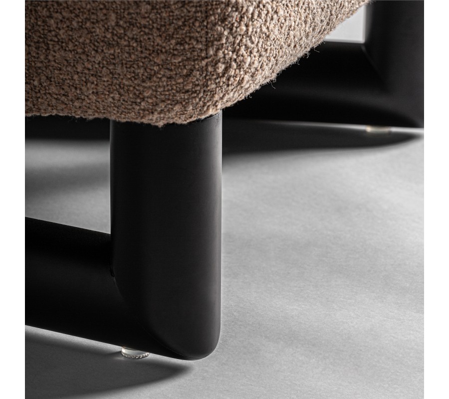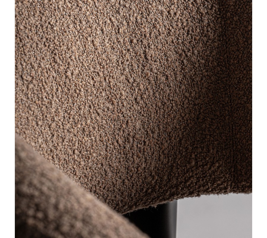 Luxusné dizajnové moderné čalúnené bouclé kreslo Orbin s hnedým huňatým poťahom s čiernou masívnou konštrukciou 82 cm
