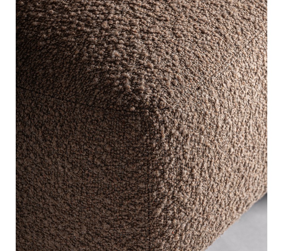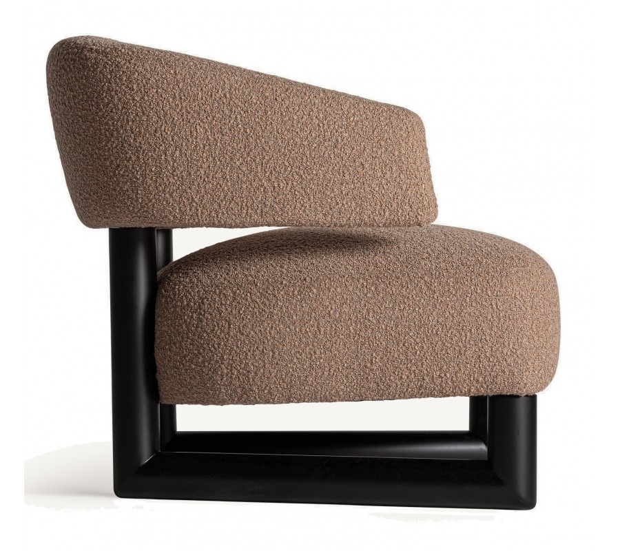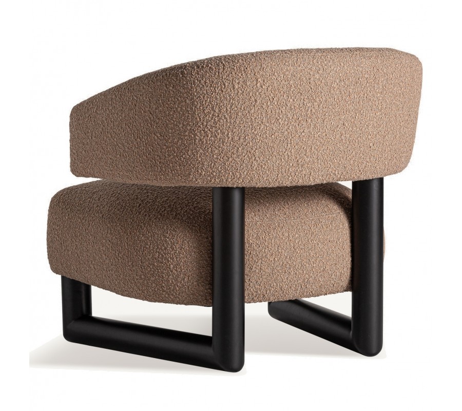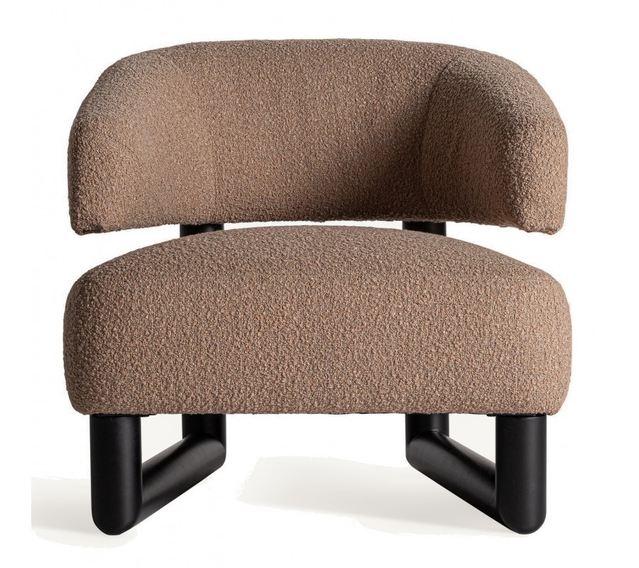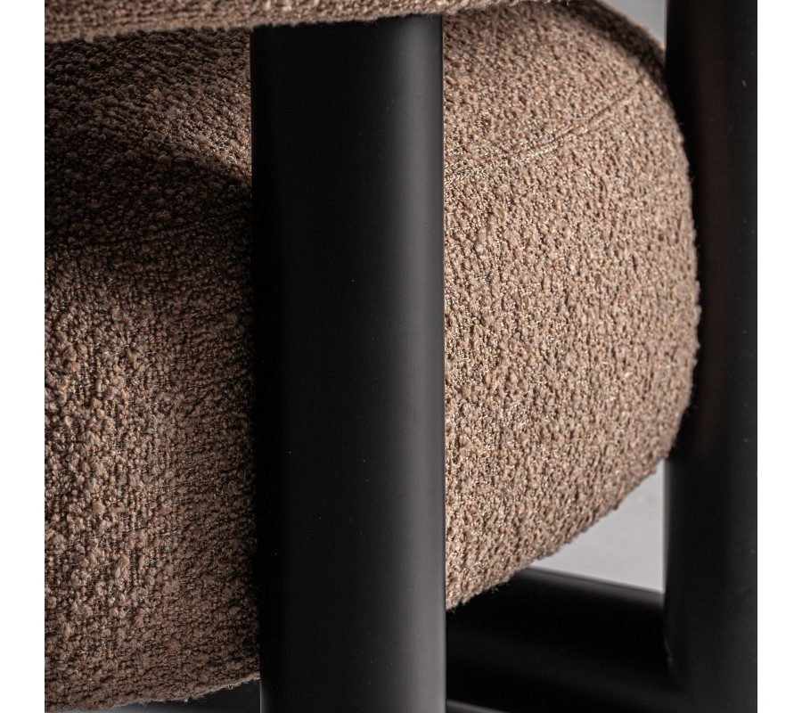 Luxusné dizajnové moderné čalúnené bouclé kreslo Orbin s hnedým huňatým poťahom s čiernou masívnou konštrukciou 82 cm