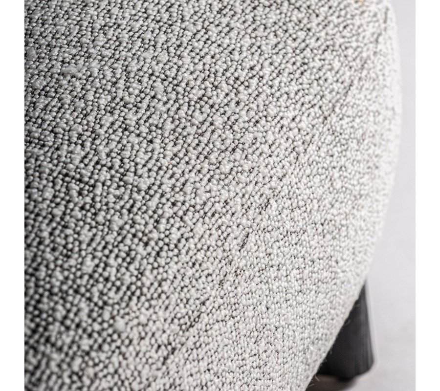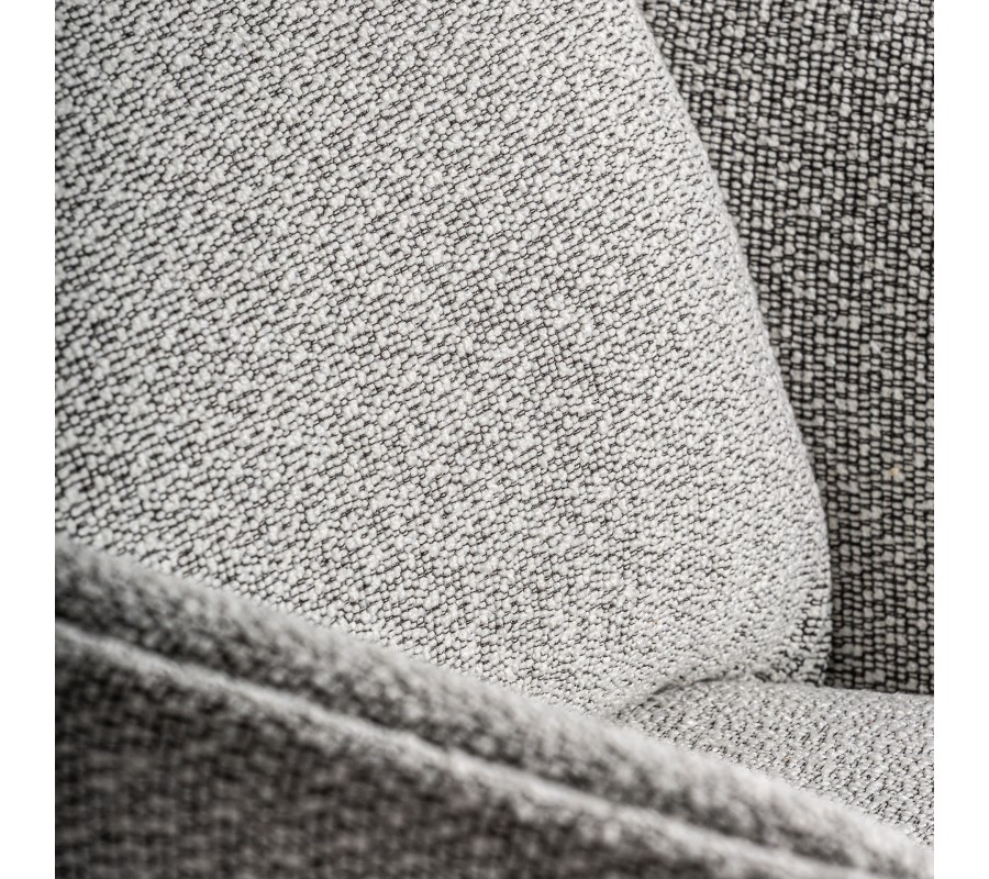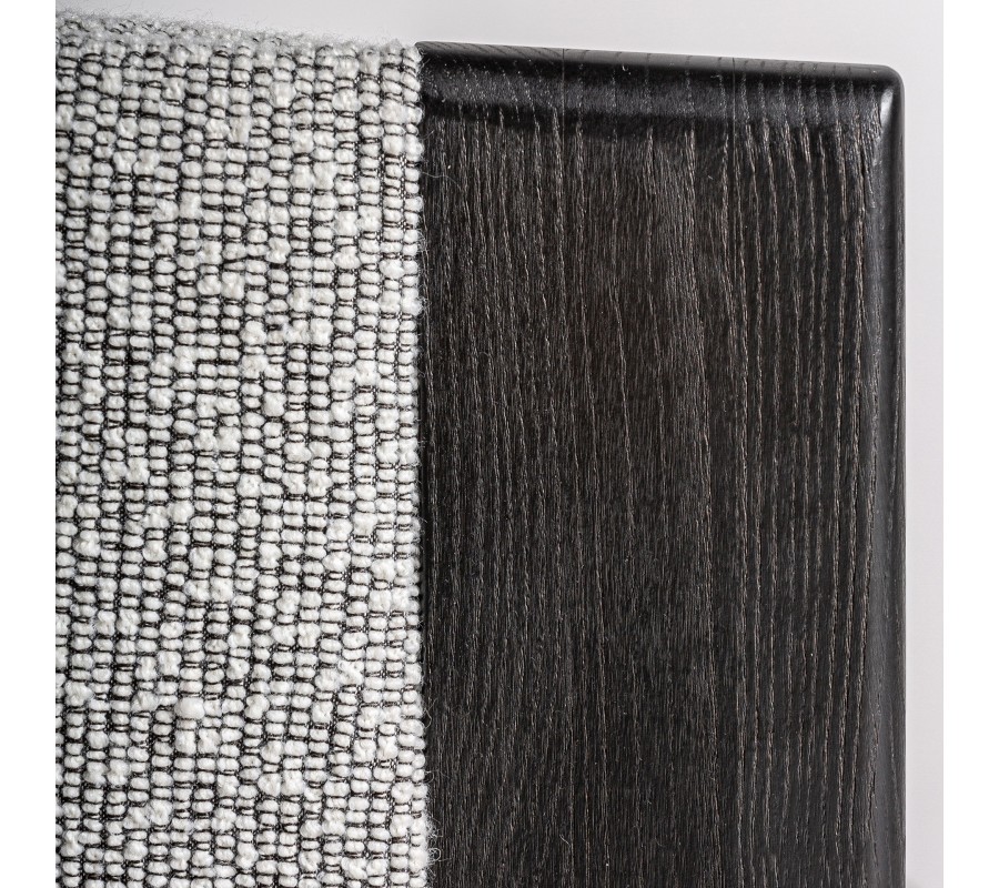 Sedacia časť je priestranná a zaručuje maximálny komfort aj pri dlhšom sedení, tvorí ju robustný vankúš čalúnený čierno-bielou textúrovanou látkou, ktorá je príjemná na dotyk a vizuálne dotvára celkový dizajn. Opieracia časť disponuje odnímateľným obdĺžnikovým vankúšom potiahnutým identickou textíliou. Bočné opierky na ruky plynulo prechádzajú do zadnej opieracej časti a tvoria tak harmonický celok zaobleného tvaru.
