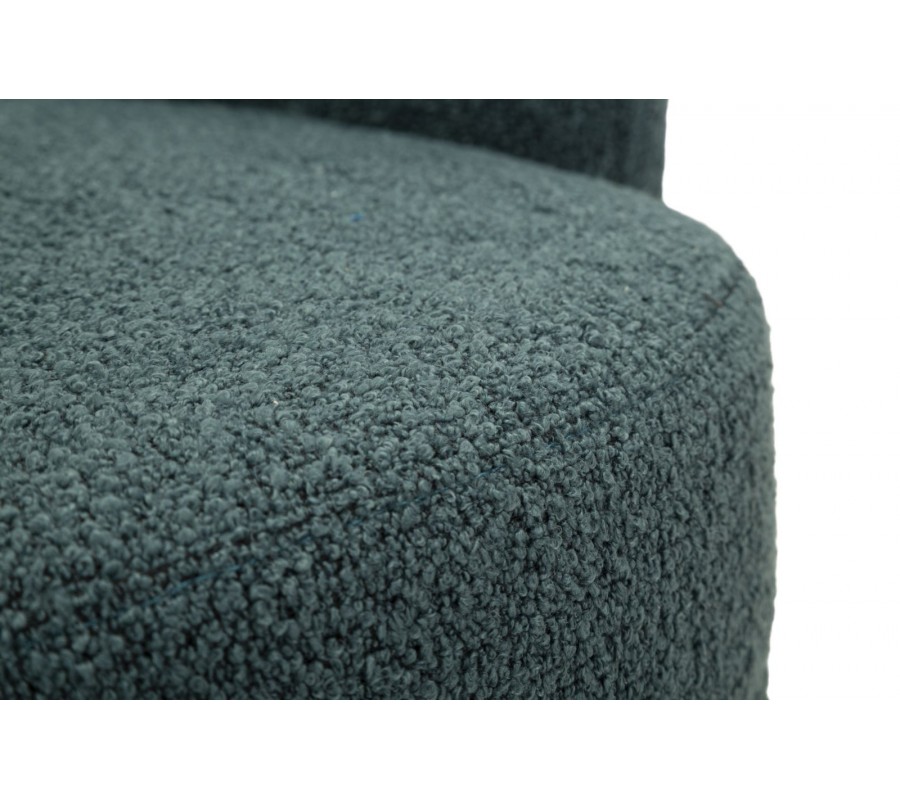 Dizajnové klubové bouclé kreslo Meron v petrolejovej modrej farbe kombinuje moderný štýl s pohodlím. Má otočnú funkciu a čiernu kovovú podstavu, ktorá zabezpečuje stabilitu a zároveň dodáva industriálny kontrast k mäkkému textilu. Poťah je vyrobený z bouclé látky, ktorá je príjemná na dotyk a vytvára útulný vzhľad. Vzadu sa nachádza zips, vďaka čomu je poťah odnímateľný a praktický na údržbu.