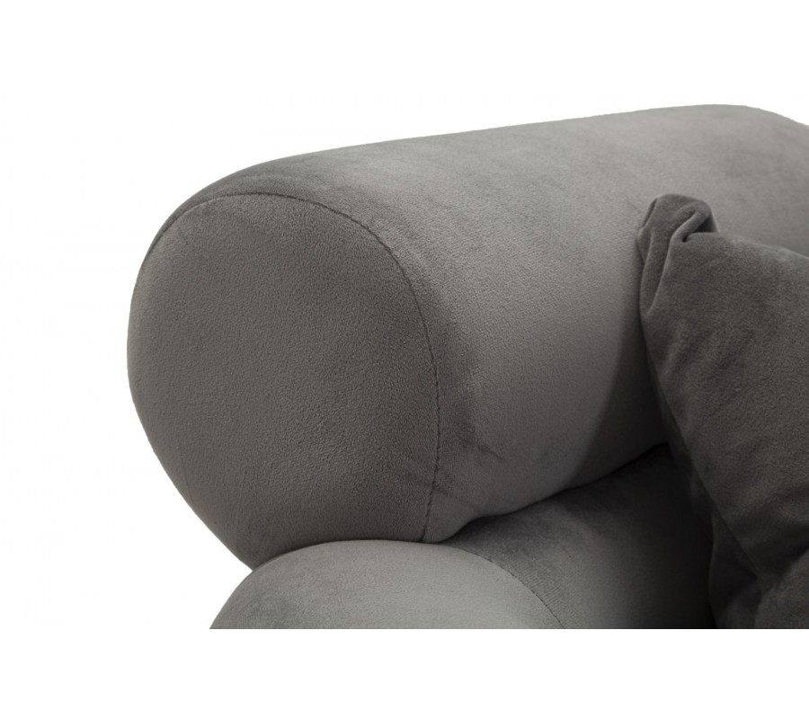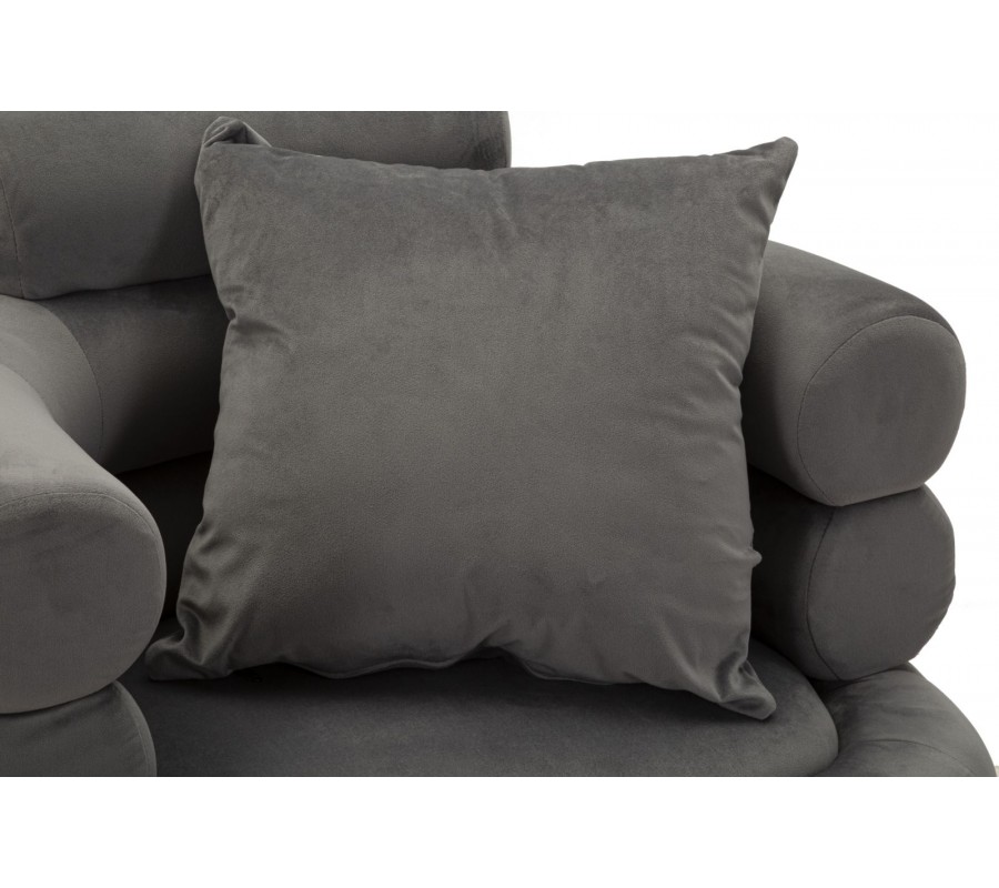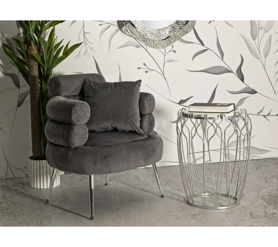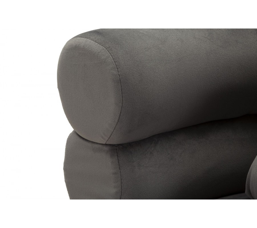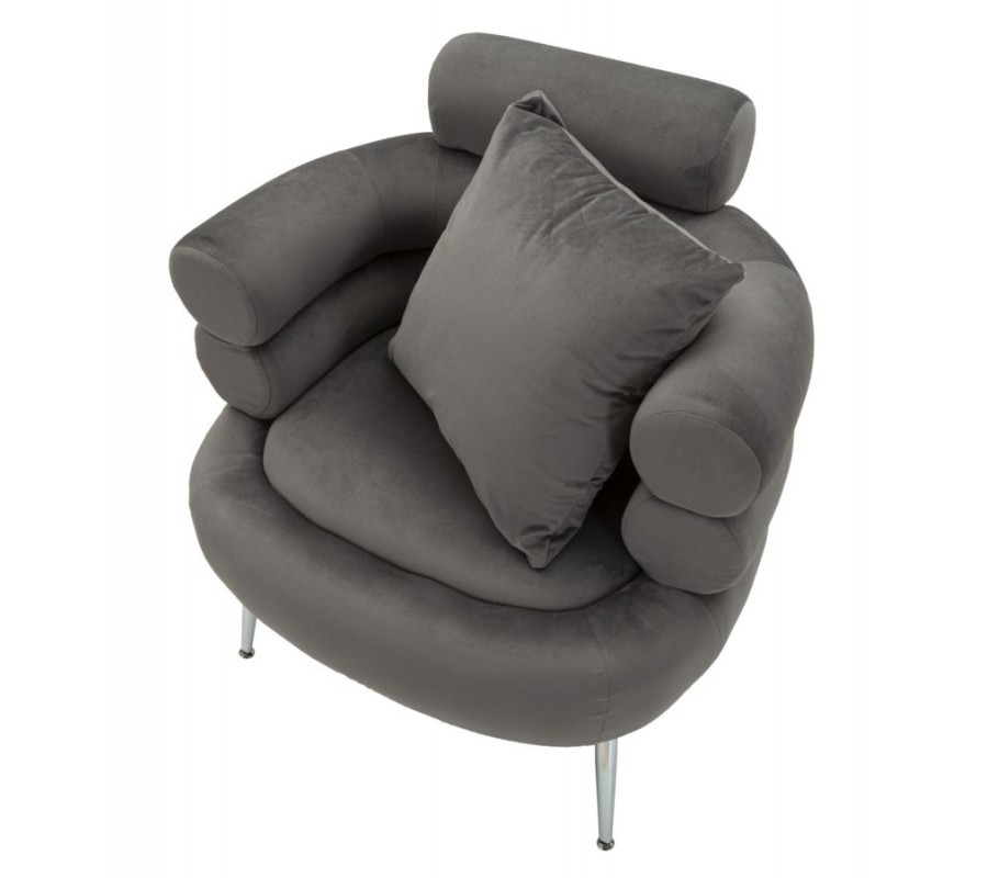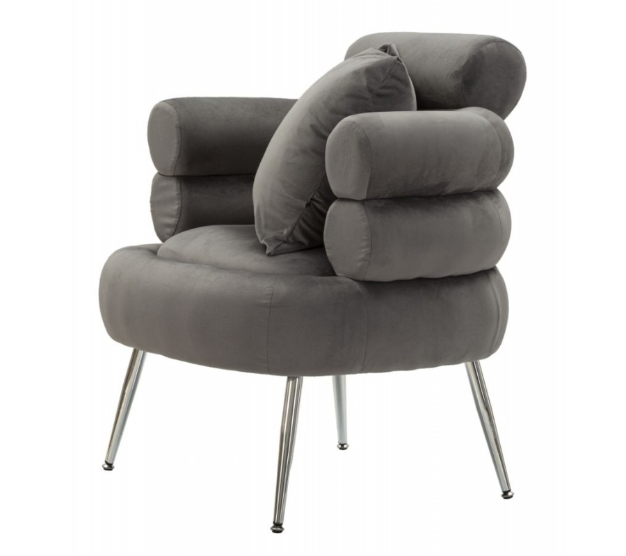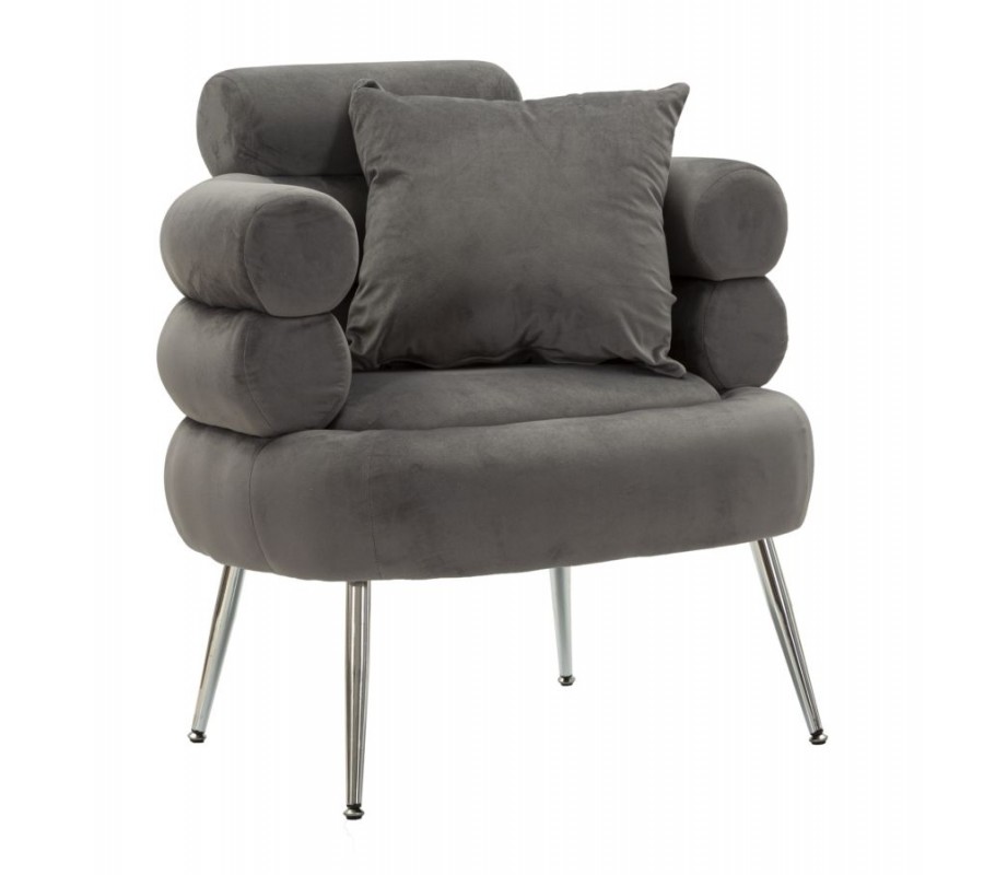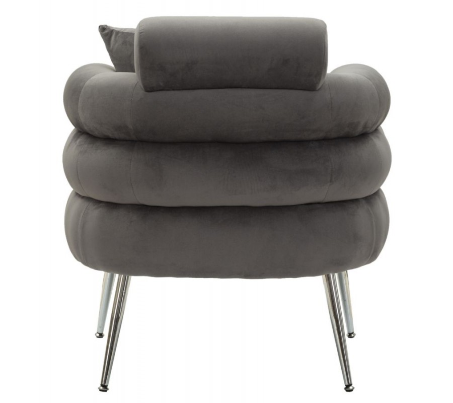 Štýlový vrstvený dizajn pôsobí geometrickým dojmom a vytvára až skulpturálny vizuál. Textilný poťah so zamatovým finišom v sivej farbe má jemný lesk a v kombinácii s vysoko lesklými kovovými chrómovými nožičkami dodáva dizajnu nádych glamour štýlu. Nožičky kreslo svojím štíhlym zošikmeným tvarom vizuálne odľahčujú. Štvorcový vankúš v rovnakom prevedení ako poťah zasa zabezpečuje dodatočný komfort.