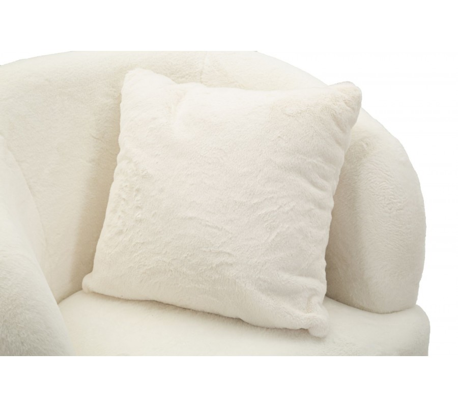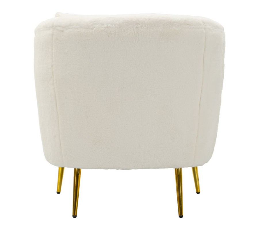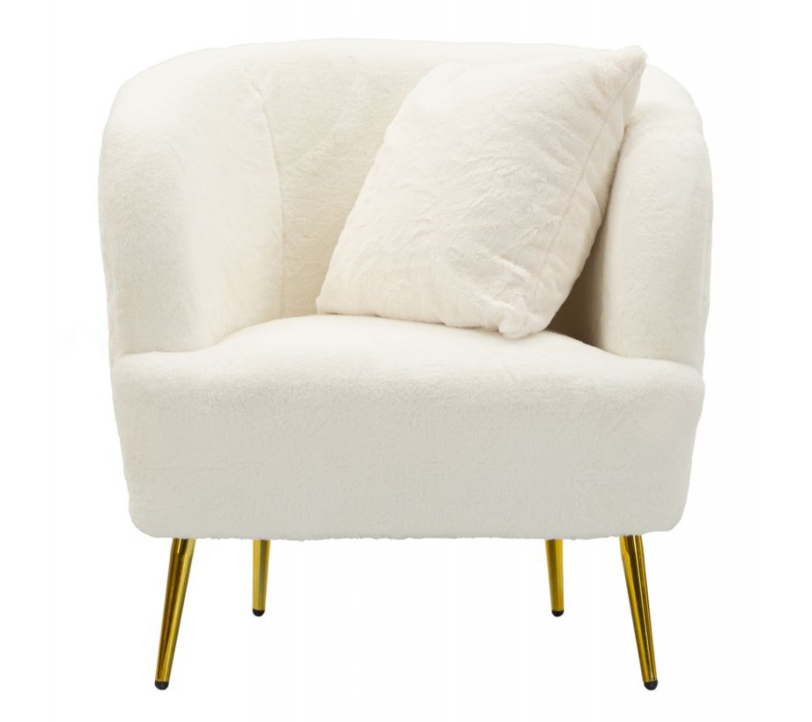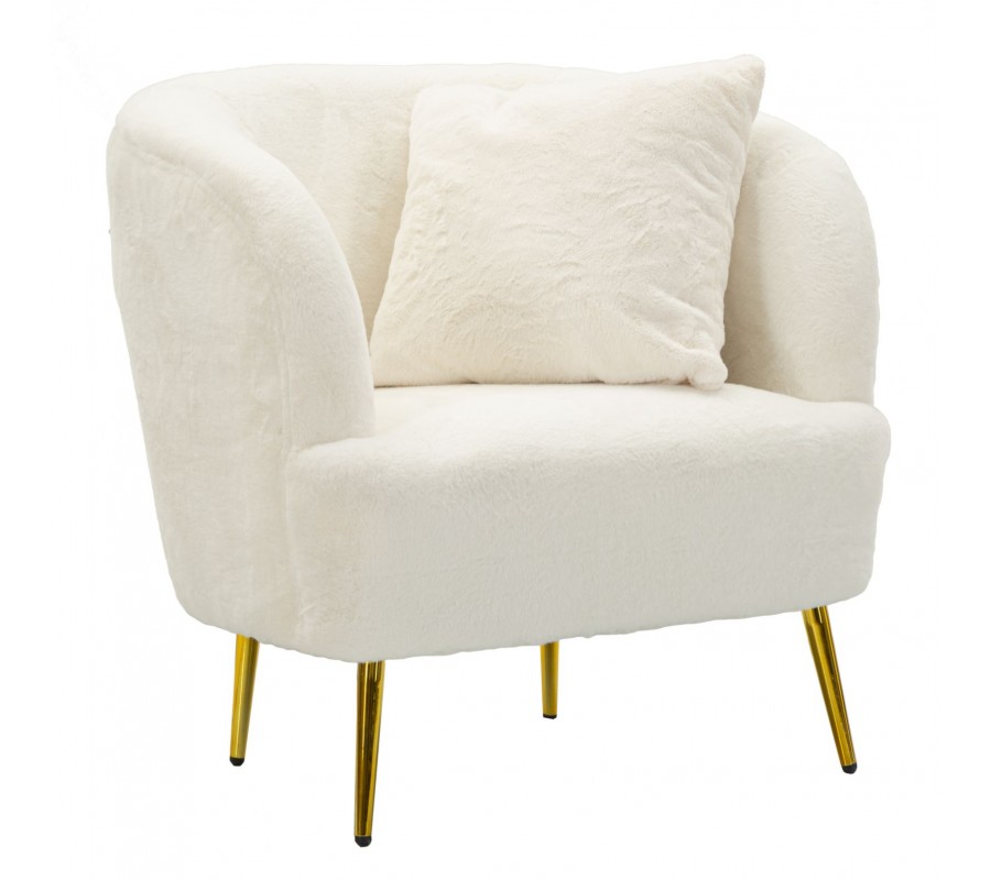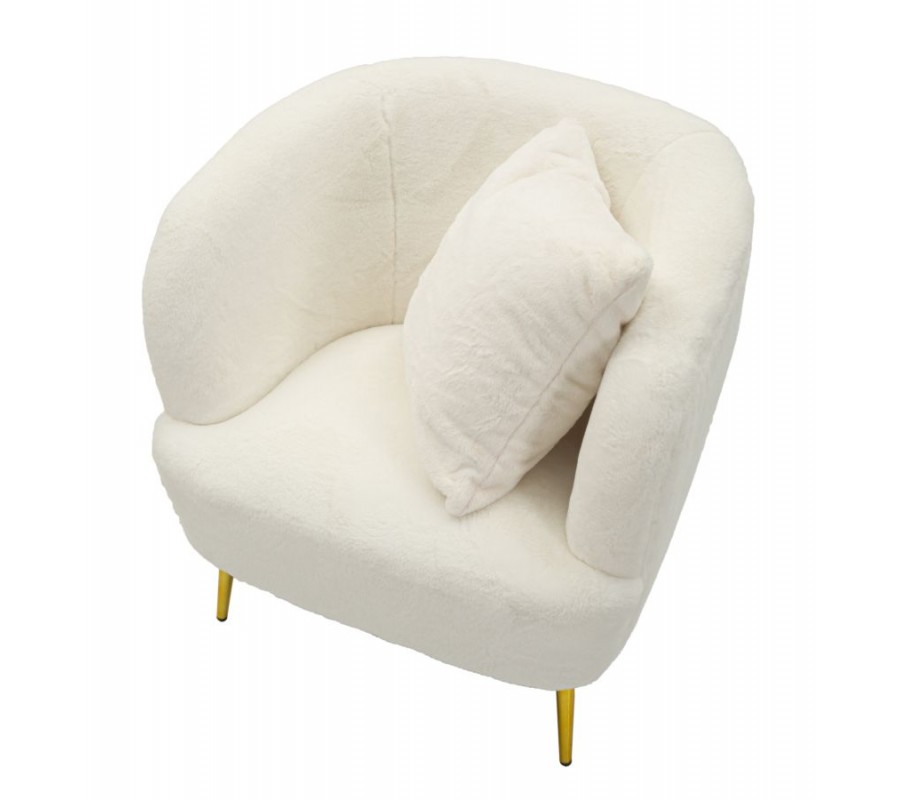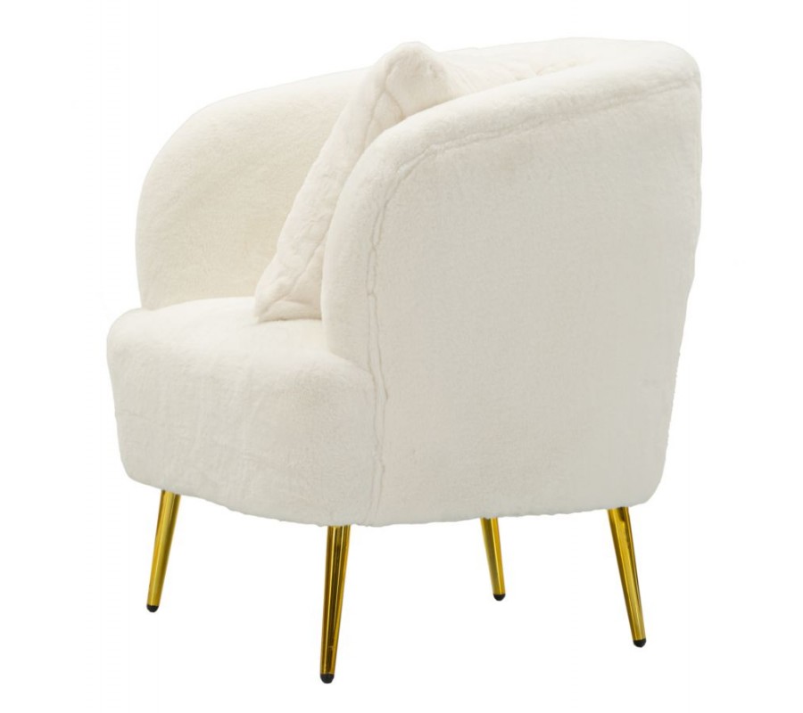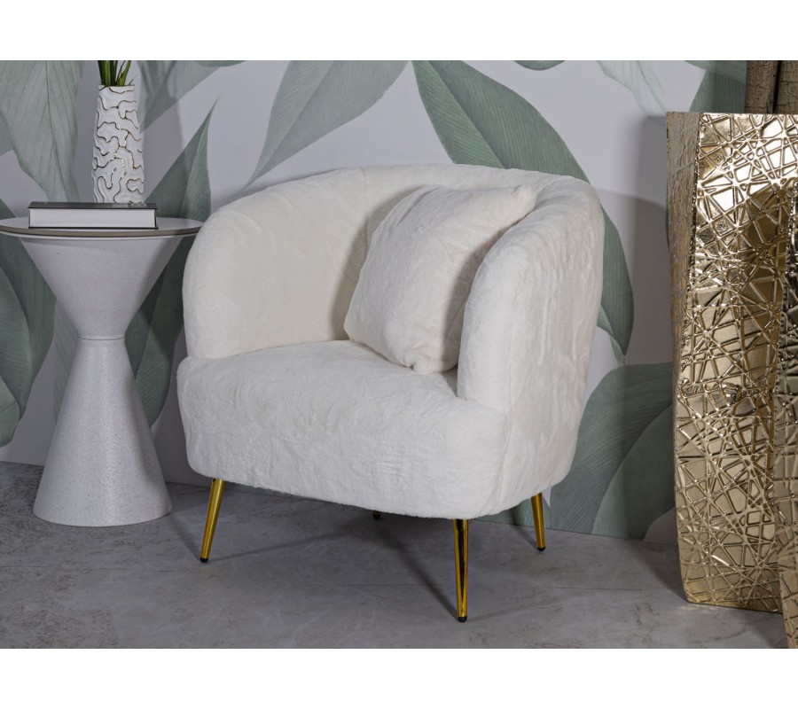 Dizajnové glamour kreslo Cally so zlatými nožičkami a bielym poťahom z umelej kožušiny s vankúšom 78 cm