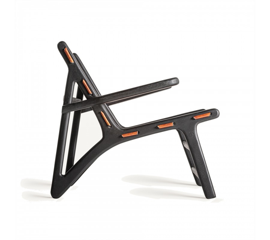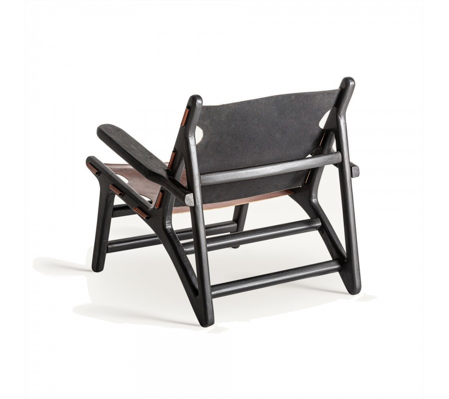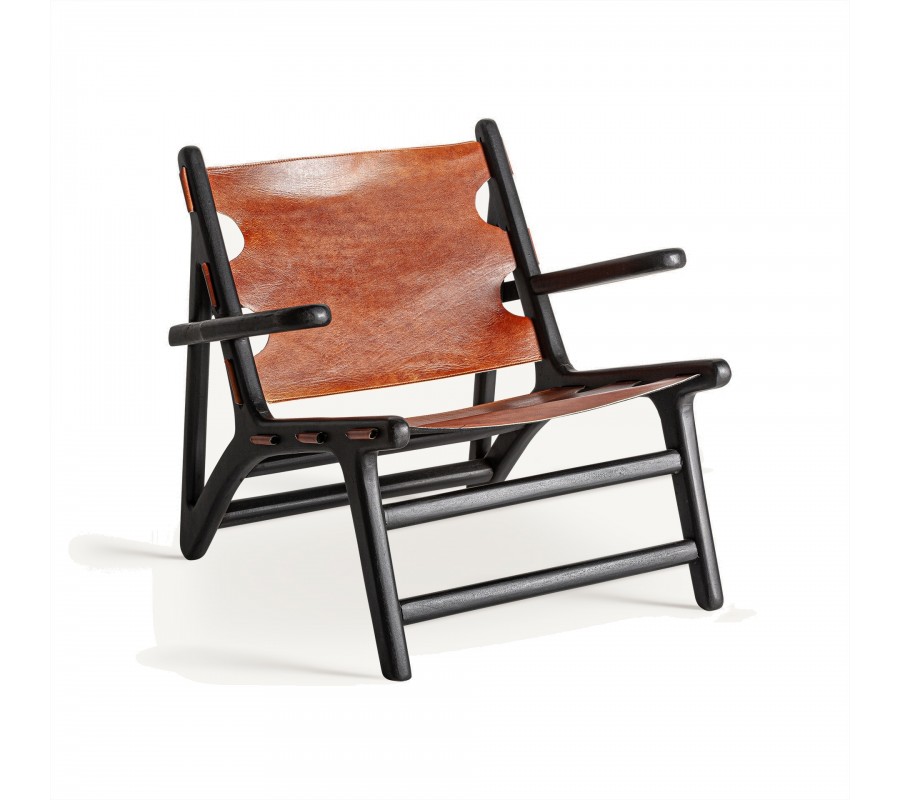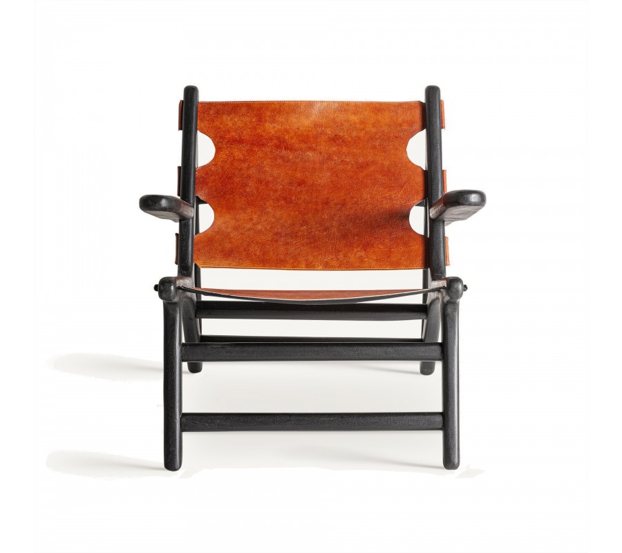 Luxusné vintage kreslo Huron je dizajnovým kúskom, ktorý spája retro šarm s remeselnou precíznosťou. Jeho nízka a rozšírená silueta pripomína pohodlné lehátko, ideálne na relax. Tehlovočervený kožený poťah je napnutý medzi masívnou čiernou mangovou konštrukciou, pričom efektné výrezy v koži umocňujú dojem pevného, ale pružného sedadla a operadla.