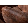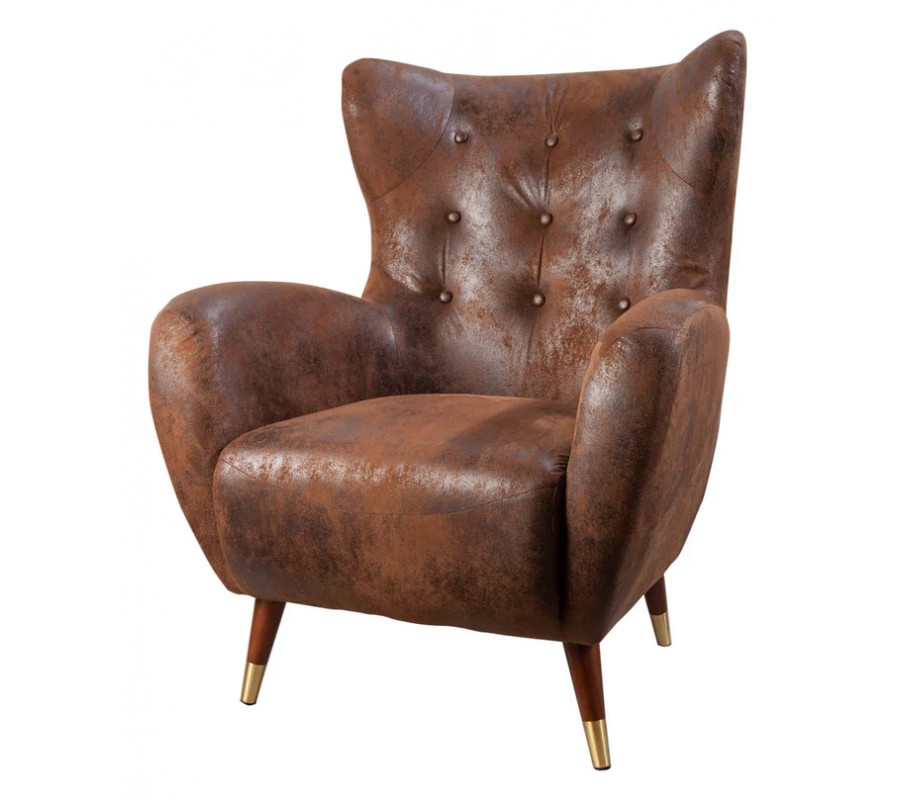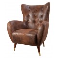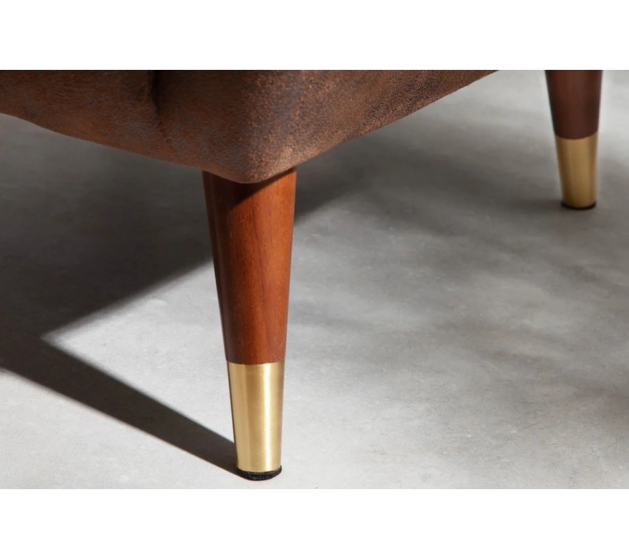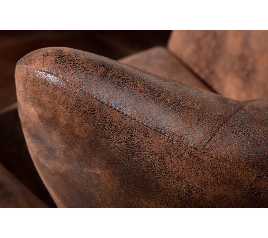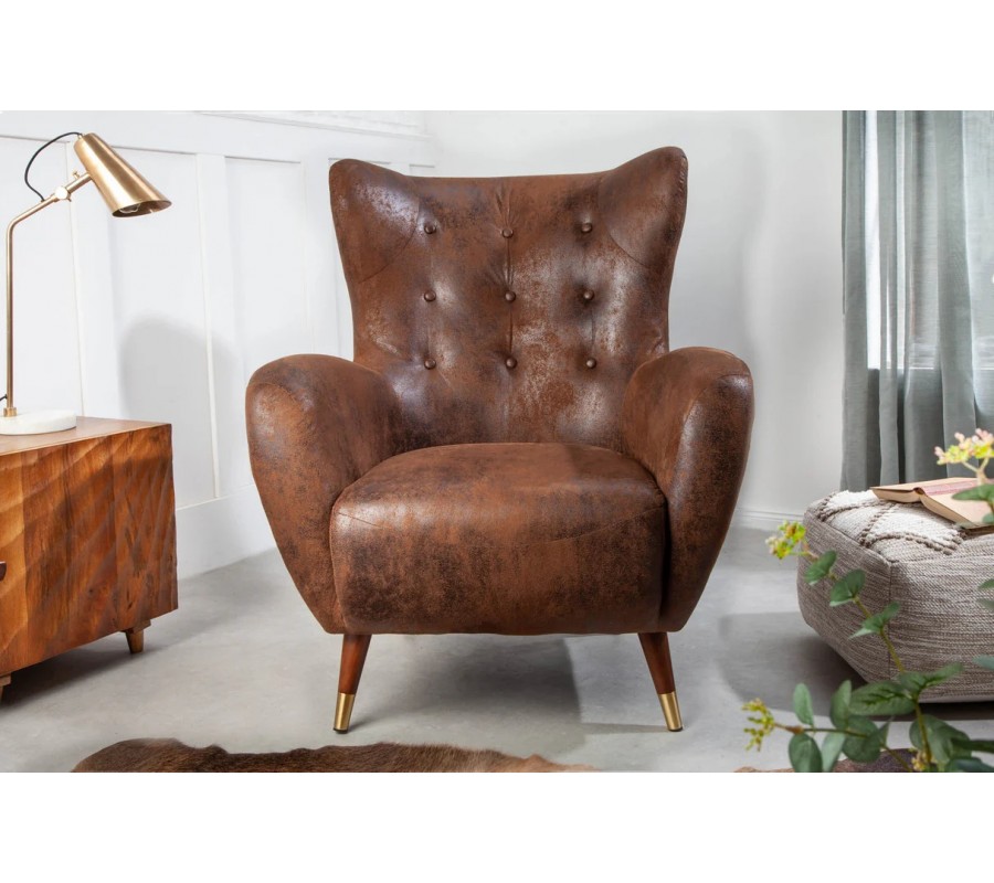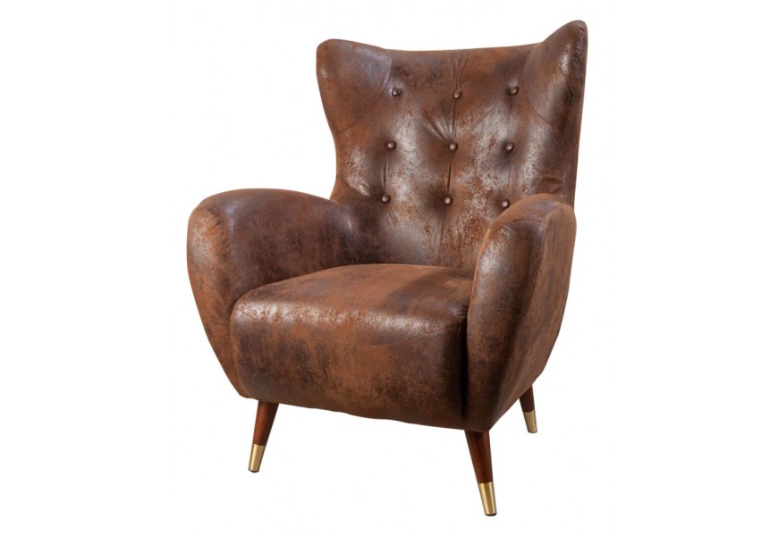 Poťah v hnedej farbe s výraznou patinovanou štruktúrou pôsobí ako stará brúsená eko koža a dokonale zapadá do art deco a vintage interiérov. V oblasti operadla sa nachádza prešívanie s gombíkmi usporiadanými do stĺpcov, ktoré zdôrazňuje vertikálnu líniu a pridáva kreslu dekoratívny rozmer.