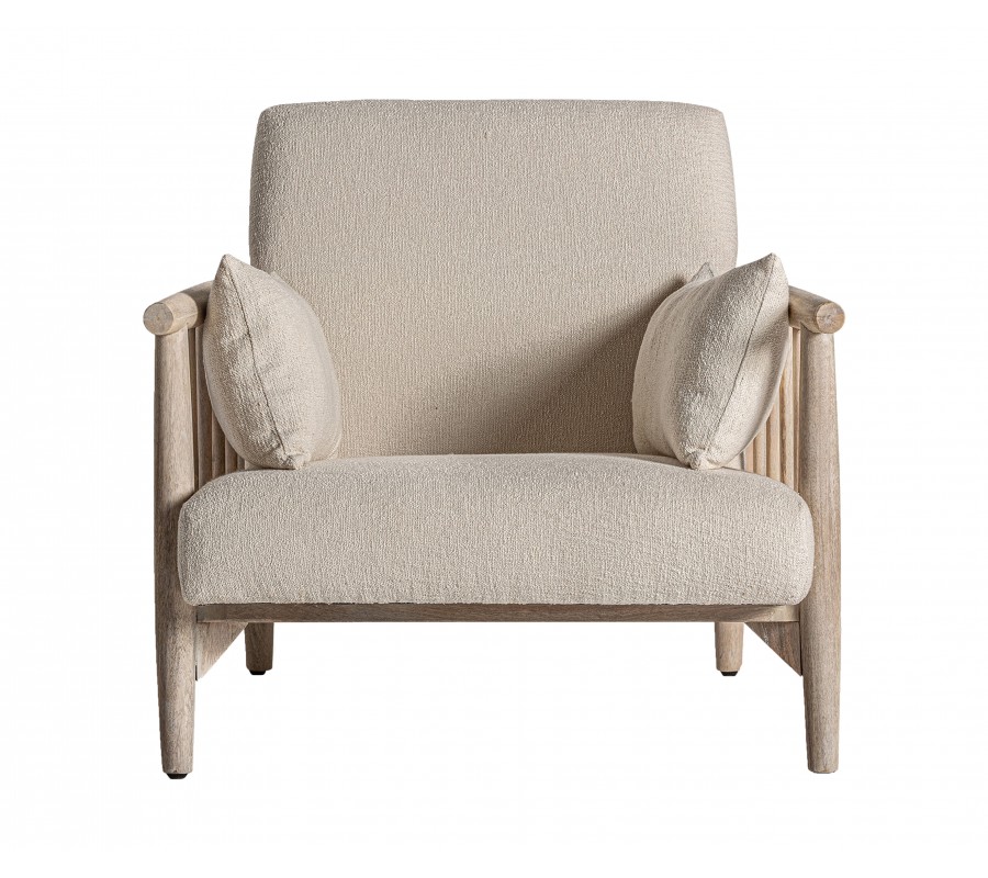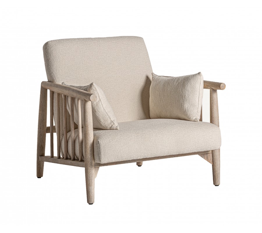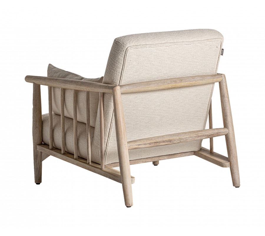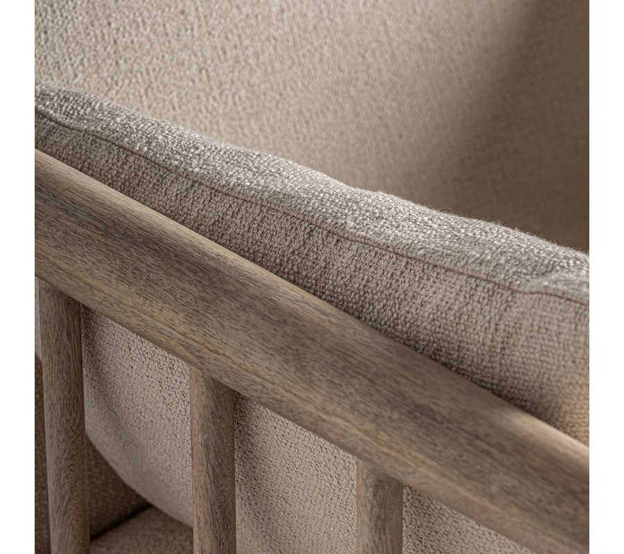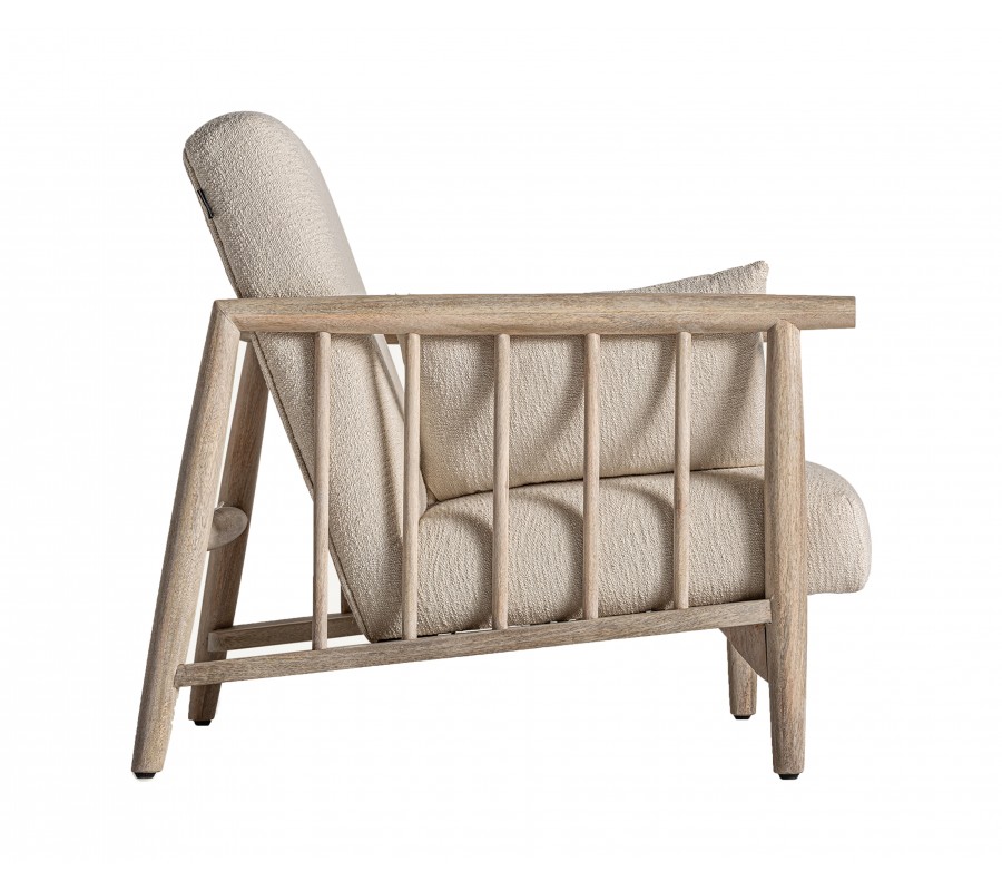 Bočné strany kresla zdobia zvislé drevené tyče, ktoré vytvárajú vzdušný a vizuálne ľahký dojem. Tyče sú osadené v ráme z dreva, pričom zo zadnej strany ich spája vodorovná spojovacia tyč, čím sa zaručuje stabilita a štýlové ukončenie. Nožičky aj opierky majú zaoblený profil, ktorý ladí s jemnou štruktúrou dreva a celkovou mäkkosťou tvarov.