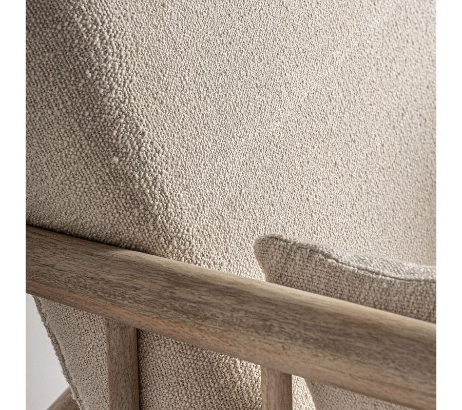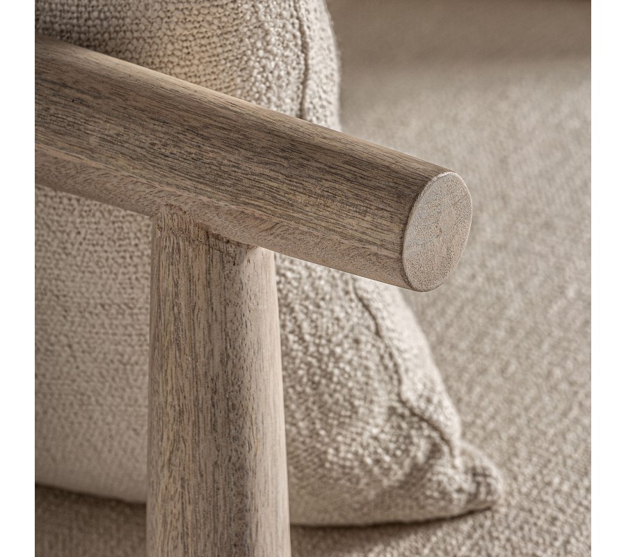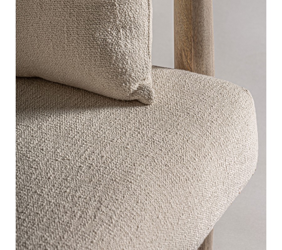 Jemná textúra poťahu v kombinácii s prirodzeným vzhľadom dreva dodáva kreslu teplý a prívetivý charakter. Dizajn sa výborne hodí do moderných interiérov, svetlých priestorov v škandinávskom alebo japandi štýle, ale aj do vidieckeho alebo koloniálne ladeného bývania.