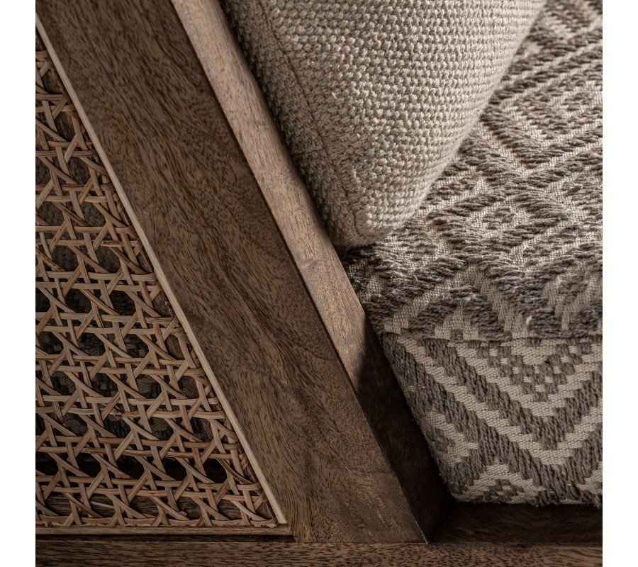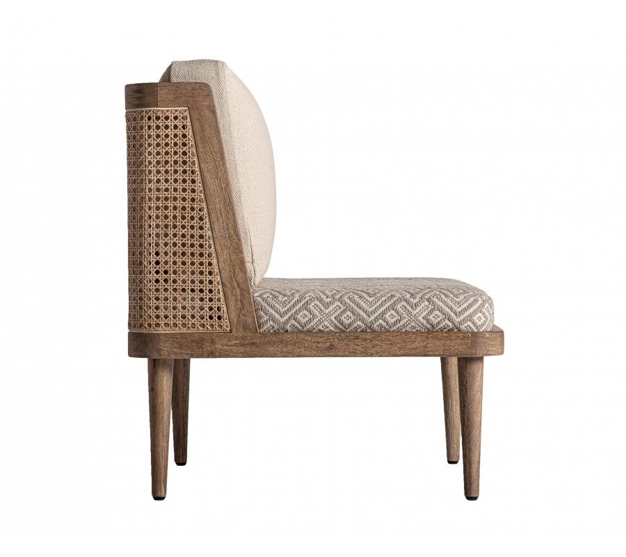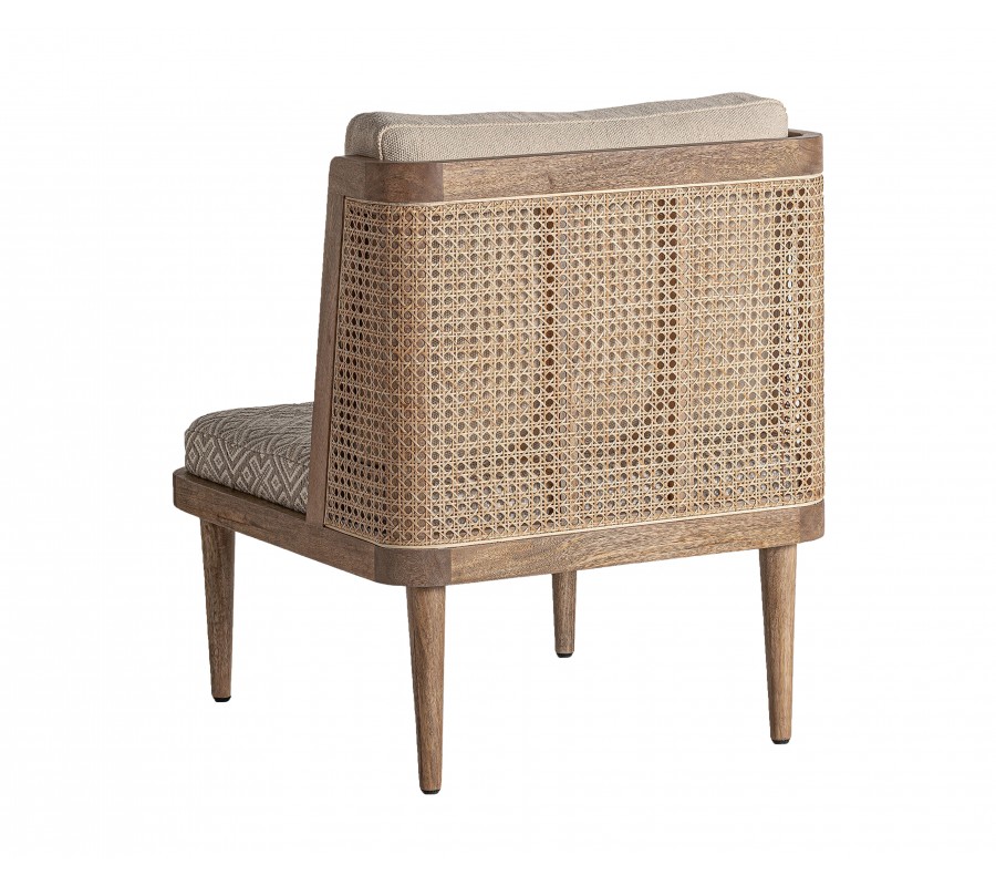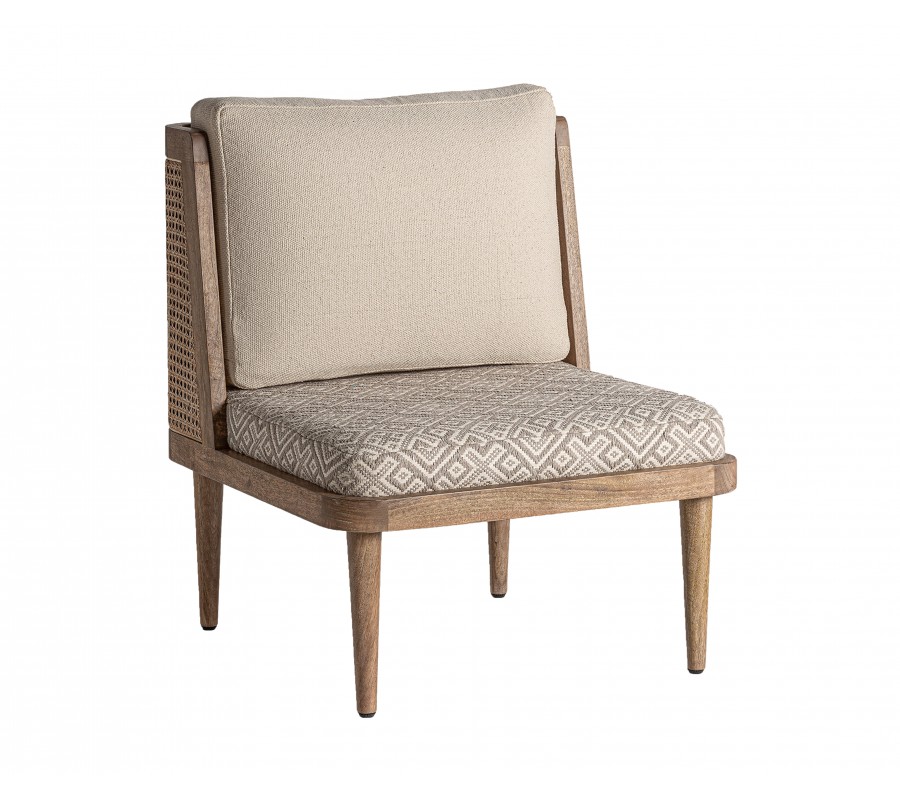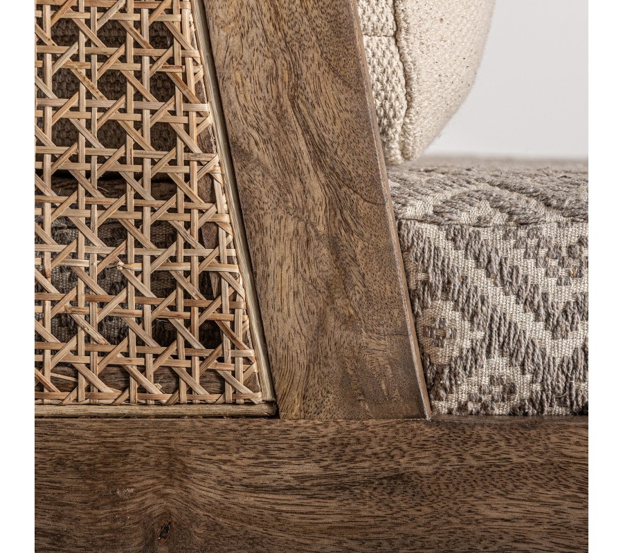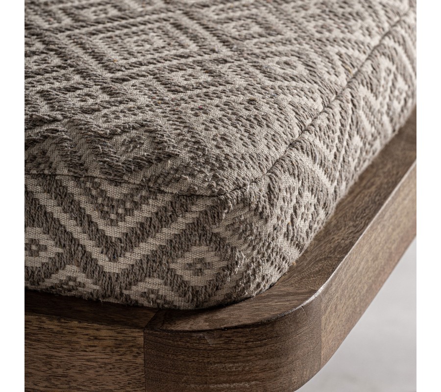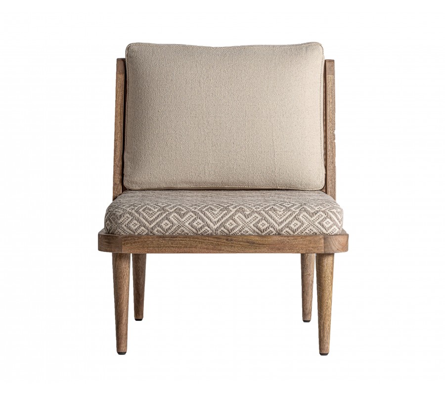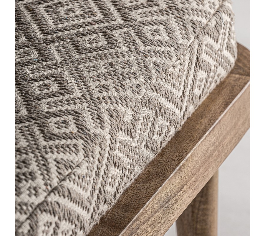 Retro kreslo Lunia zaujme na prvý pohľad svojím výrazným štýlom a precíznym remeselným spracovaním. Rám je vyrobený z masívneho brezového dreva v prírodnom hnedastom odtieni s viditeľnou štruktúrou letokruhov a bez lesklého povrchového náteru, čo podporuje jeho prirodzený, autentický vzhľad. Sedacia časť je v štvorcovom tvare a doplnená o dva vankúše s čalúnením v béžovej farbe. Sedadlový vankúš má geometrický vzor v kombinácii béžovej a sivej, čím vytvára elegantný kontrast k jednofarebnej opierke a dodáva mu etno charakter.