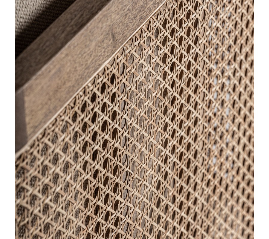 Zadná a bočné strany kresla sú dekorované viedenským výpletom, ktorý vytvára ľahký a vzdušný dojem. Výplet je vsadený do pevného dreveného rámu, čím kreslu dodáva zároveň dekoratívny aj funkčný prvok. Štyri kužeľovité nožičky sa smerom nadol zužujú, čo opticky odľahčuje celkový objem kresla a zároveň odkazuje na estetiku retro nábytku.