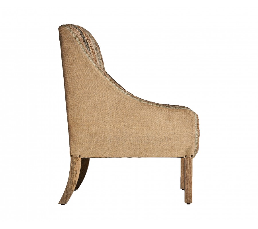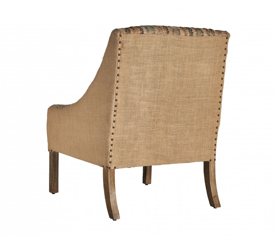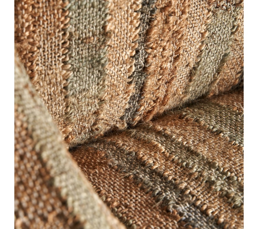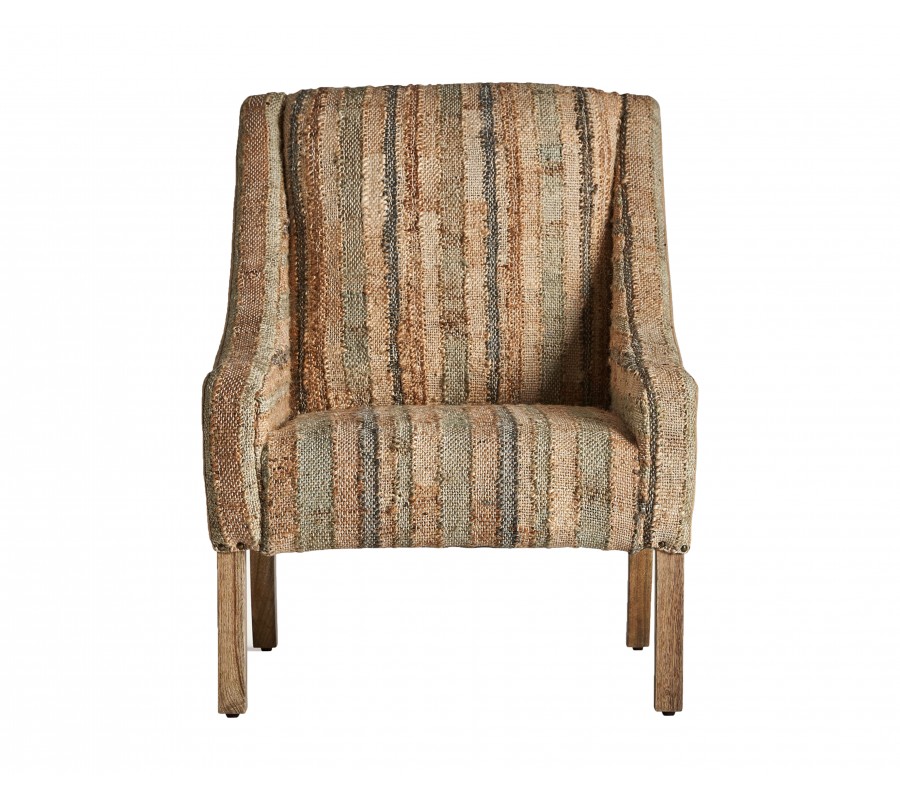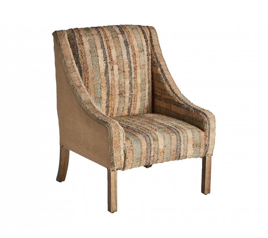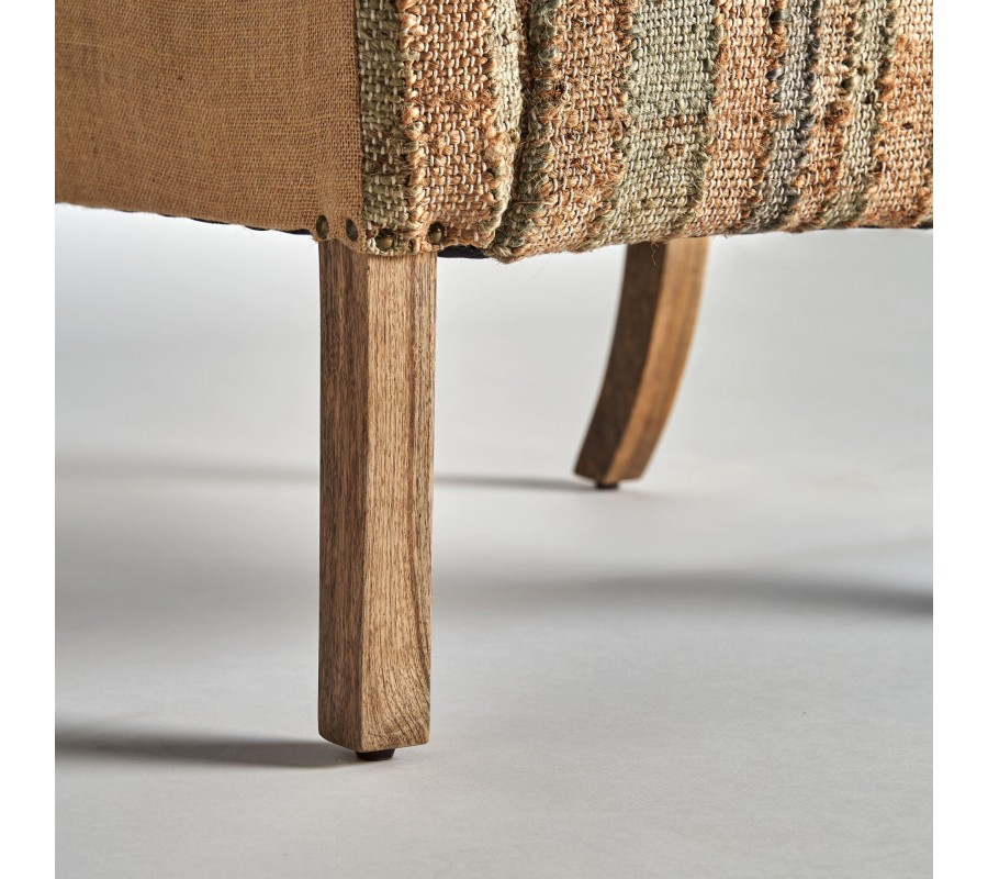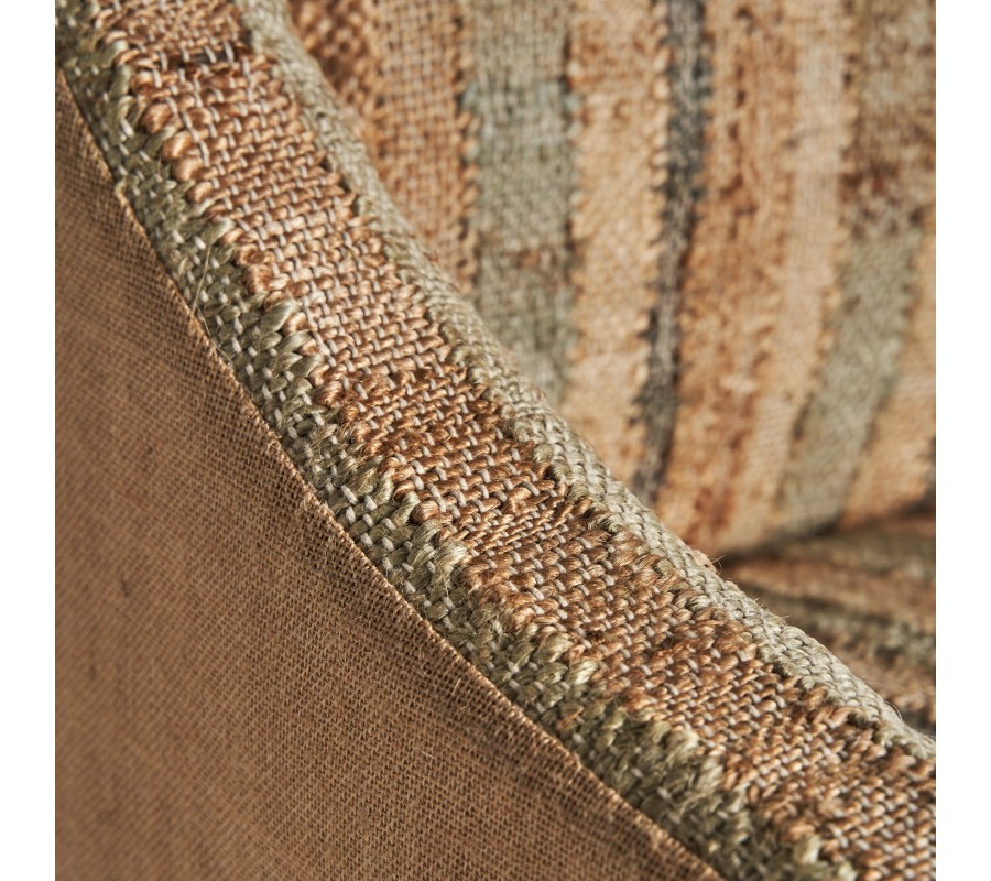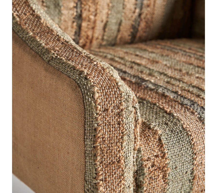 Čalúnenie kresla je potiahnuté hrubou jutovou látkou s viditeľnou textúrou, ktorá je zladená v teplých tónoch zelenej, hnedej a oranžovej. Prúžkovaný vzor pôsobí remeselne a etnicky, pričom látka má nepravidelnú štruktúru a ručne tkaný vzhľad. Tento poťah dodáva kreslu autentický a naturálny charakter.