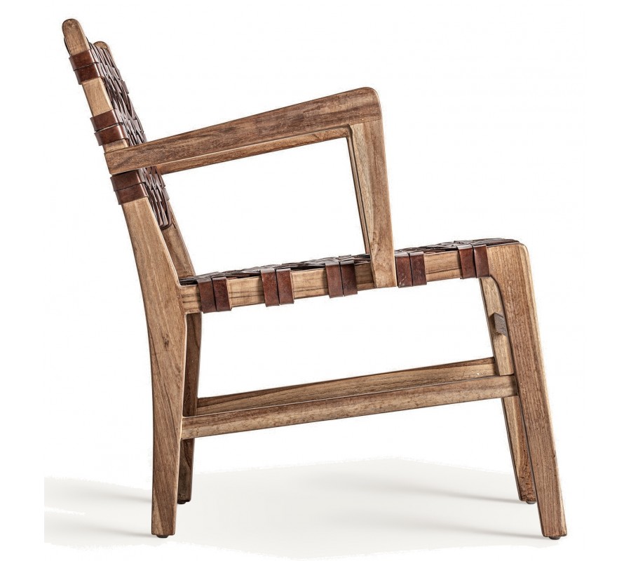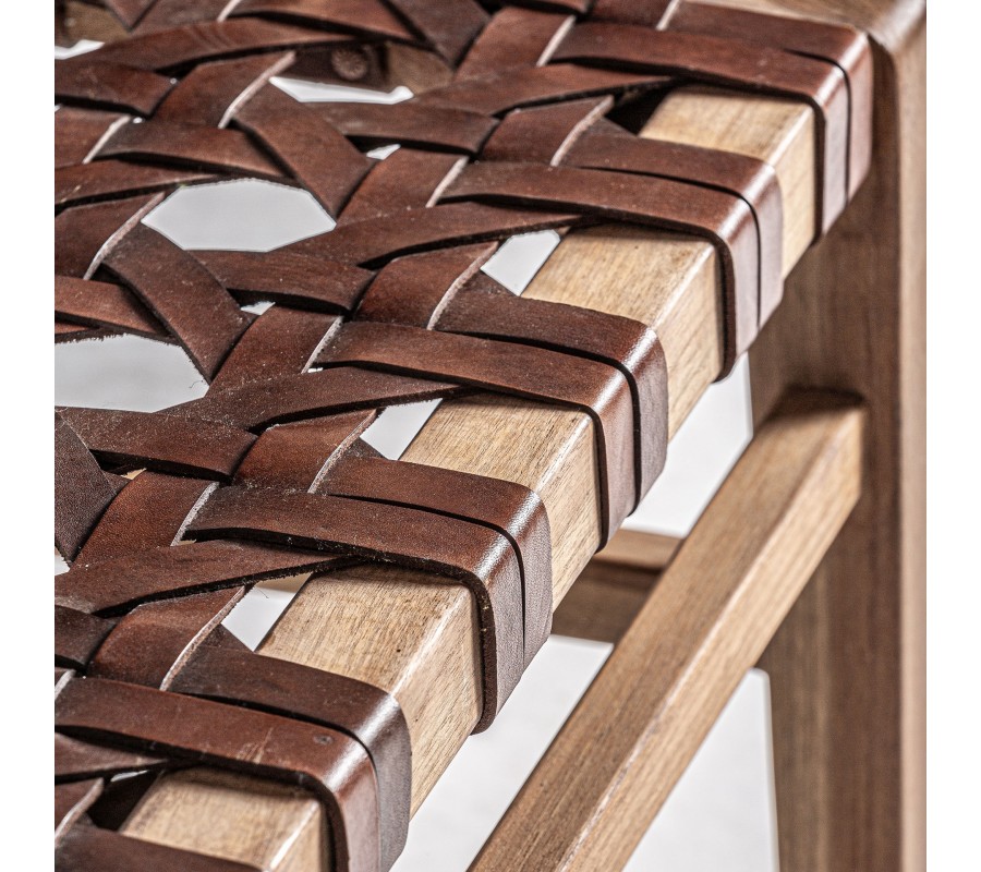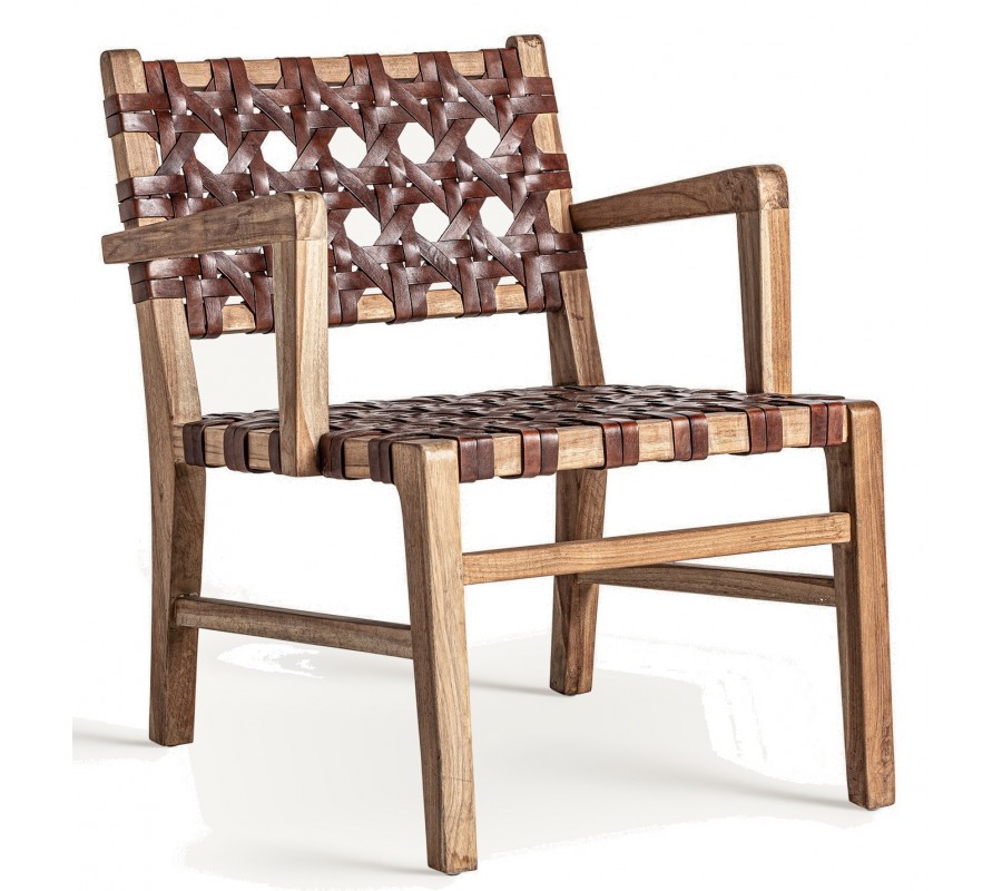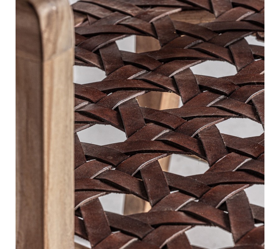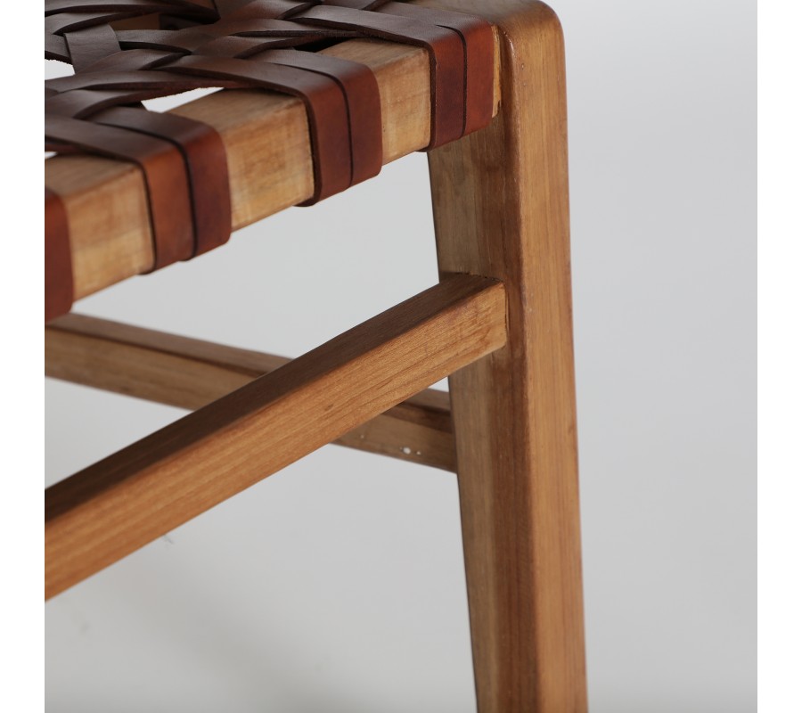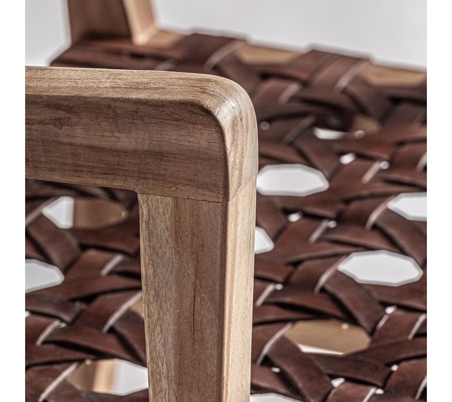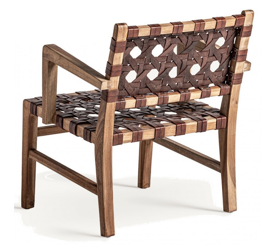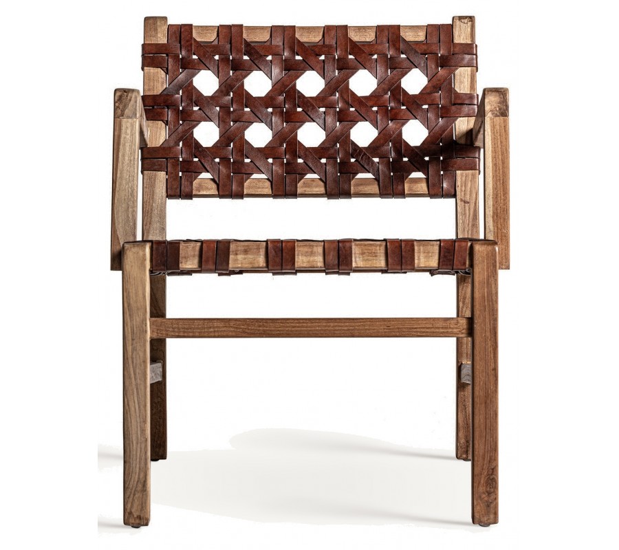 Luxusné vintage kreslo Turisk zaujme na prvý pohľad svojím remeselne spracovaným výpletom z pravej kože v hnedej farbe, ktorý pripomína viedenský výplet, ktorý sa nachádza na opierke a sedadle, no v mohutnejšej a robustnejšej koženej verzii. Rám je vyrobený z masívneho hnedého teakového dreva, ktoré je známe svojou pevnosťou a krásnou prirodzenou kresbou. Celá konštrukcia je hranatá, čo podčiarkuje autentický vintage vzhľad.