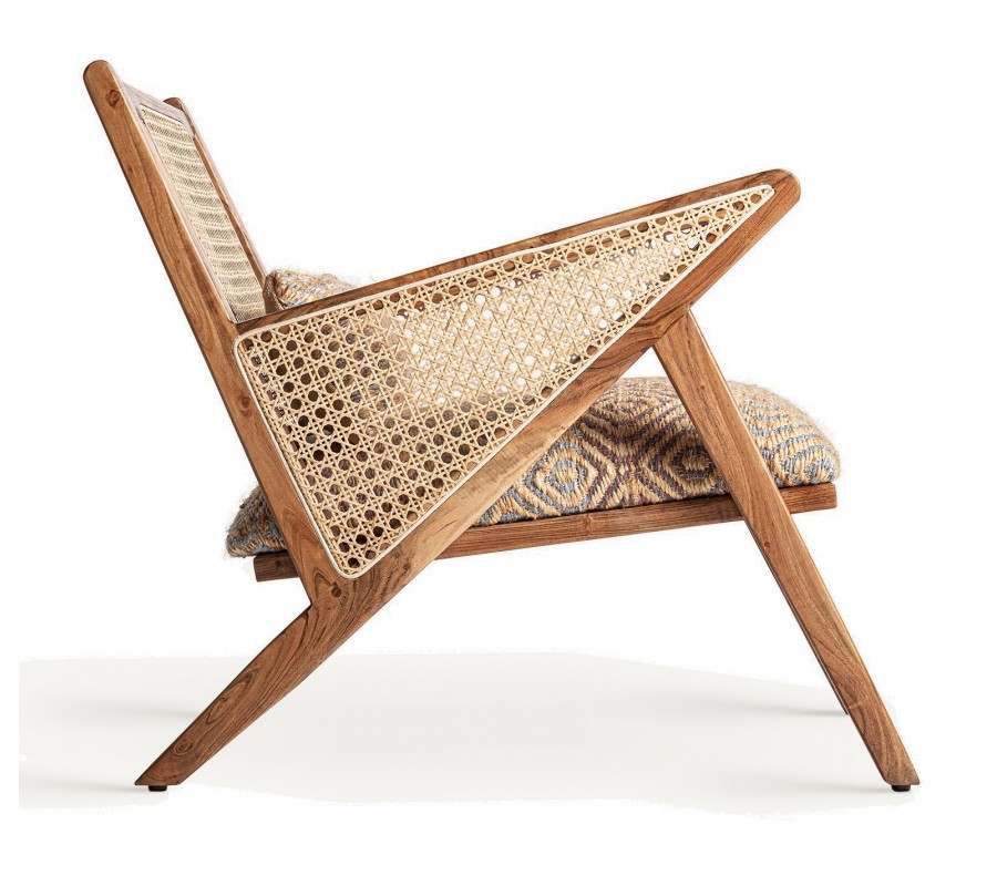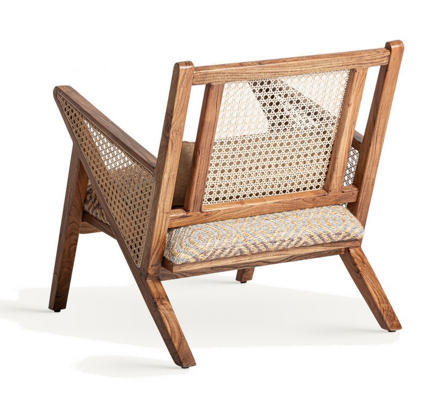 Kreslo má pevný drevený rám, vyrobený z mangového dreva. Jeho silueta je geometrická - chrbtová opierka a sedadlo sú obdĺžnikové, zatiaľ čo bočné opierky majú tvar trojuholníka. Rovnaký tvar vytvárajú aj nožičky - zadná je predĺžením opierky na ruky a zošikmená predná sa pripája k tejto línii. Dizajn je vizuálne zaujímavý a zároveň zaručuje nábytku výbornú stabilitu.